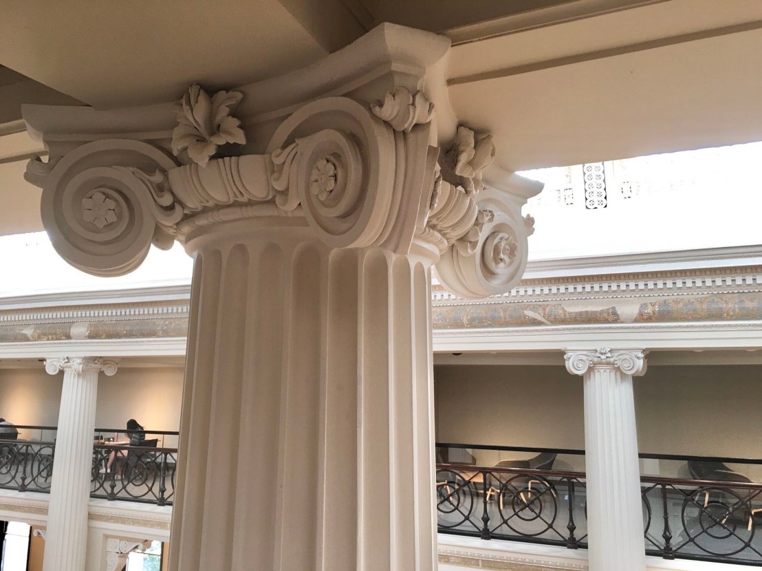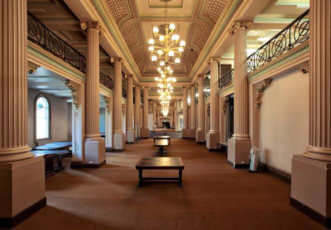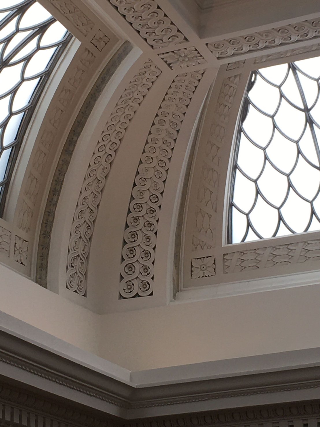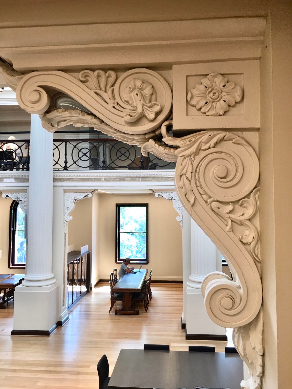 The refurbished #QueensHall at the #StateLibraryVictoria looks amazing, all that delicate plaster detail highlighted by pale paint, and the fabbo #fishscale #skylights reinstated; hard to believe it’s been 16 years since it closed (due to fire risk/exits), and what a change from the 1970s green and cream scheme. It now looks much as it did in a photo from 1866. Designed by Joseph Reed, it was built in 3 stages all matching (middle, south, north) and the photo shows it was mostly pale, with patterned #friezes by EJ Bateman only in the places where they’ve been revealed. The giant 70s Victorian style lights have gone, but not replaced with reproductions of the 1860s lights. This room is fondly remembered as the cosy and quiet Arts Library section from 1976 to 2003, now it’s just the chess and bridge collection, with the central space more easily emptied for functions. Restoration works by @andronasarchitecture.