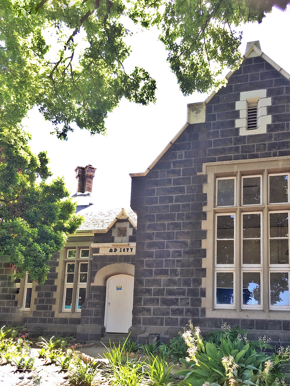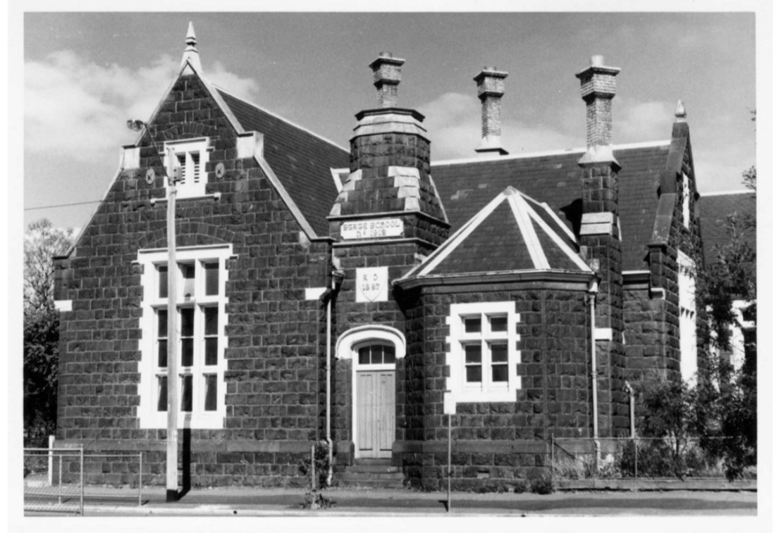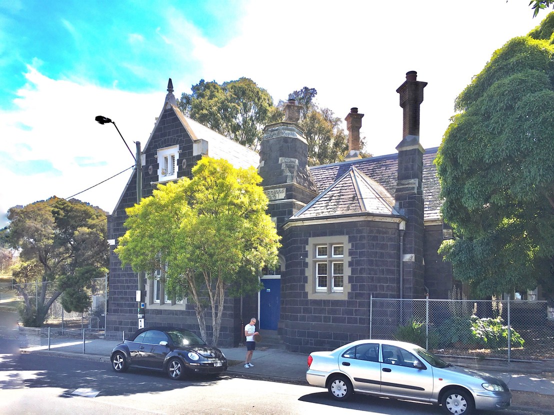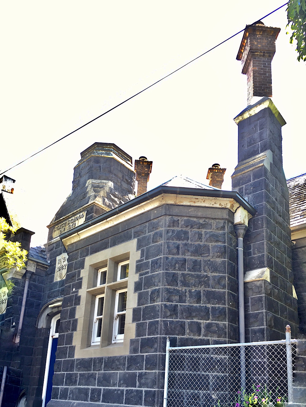 #FootscrayCityPrimarySchool, which I think is pretty cute, a madly squished up collection of #Tudor features, built 1887, added to the more typically spreading rectangular 1877 earlier part, set back from the street. Both parts seem to have all original windows, which is rare. I’ve put the 1960s photo first because of that #poorlyplacedtree. I think there’s a steeple/spire missing from the tower over the door, but the crazy tall diagonal chimney make up for it. This is in Hyde Street, not the more photogenic one in Geelong Rd. Presumably designed by #HenryBastow, the architect for the Education Department who designed most of the first wave of primary schools when the state started building them 1872.