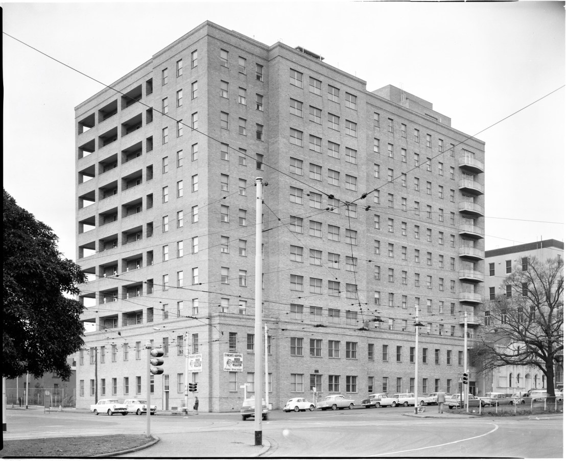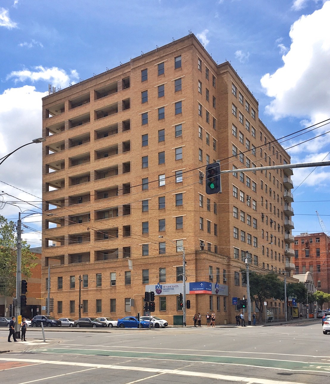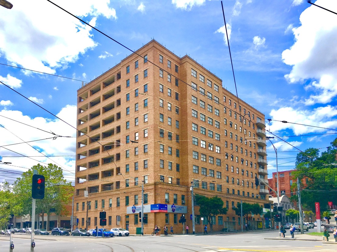 Apparently this is going to be demolished soon, and I’m ok with that. Built as the #StVincentsHospitalMelbourne #NursesHome with casualty on the lower levels, it was built in the early 1950s, and it’s just a huge imposing #creambrick bock, relieved only by inset balcs on one side and stuck on ones on the other. It’s rather like US public housing of the late 40s esp NY which was totally without ornament or balcs. It’s got some trad detailing down the bottom but that’s it. It’s neither Modern nor trad nor late Art Deco, it’s nothing, and it totally dominates that corner. I do hope though that whatever they build will have some set backs at least. Not sure if this is going ahead soon though vis they’re currently plonking something huge at the other end, looming over the Eastern Hill Hotel, though not dem any of it – but that’s the private wing ? Hospitals make odd choices when rebuilding, based on need and land and moving things around – in the 90s their plan was to one by one sweep away all the old buildings for new, they dem the 1913 Druids Wing recently…