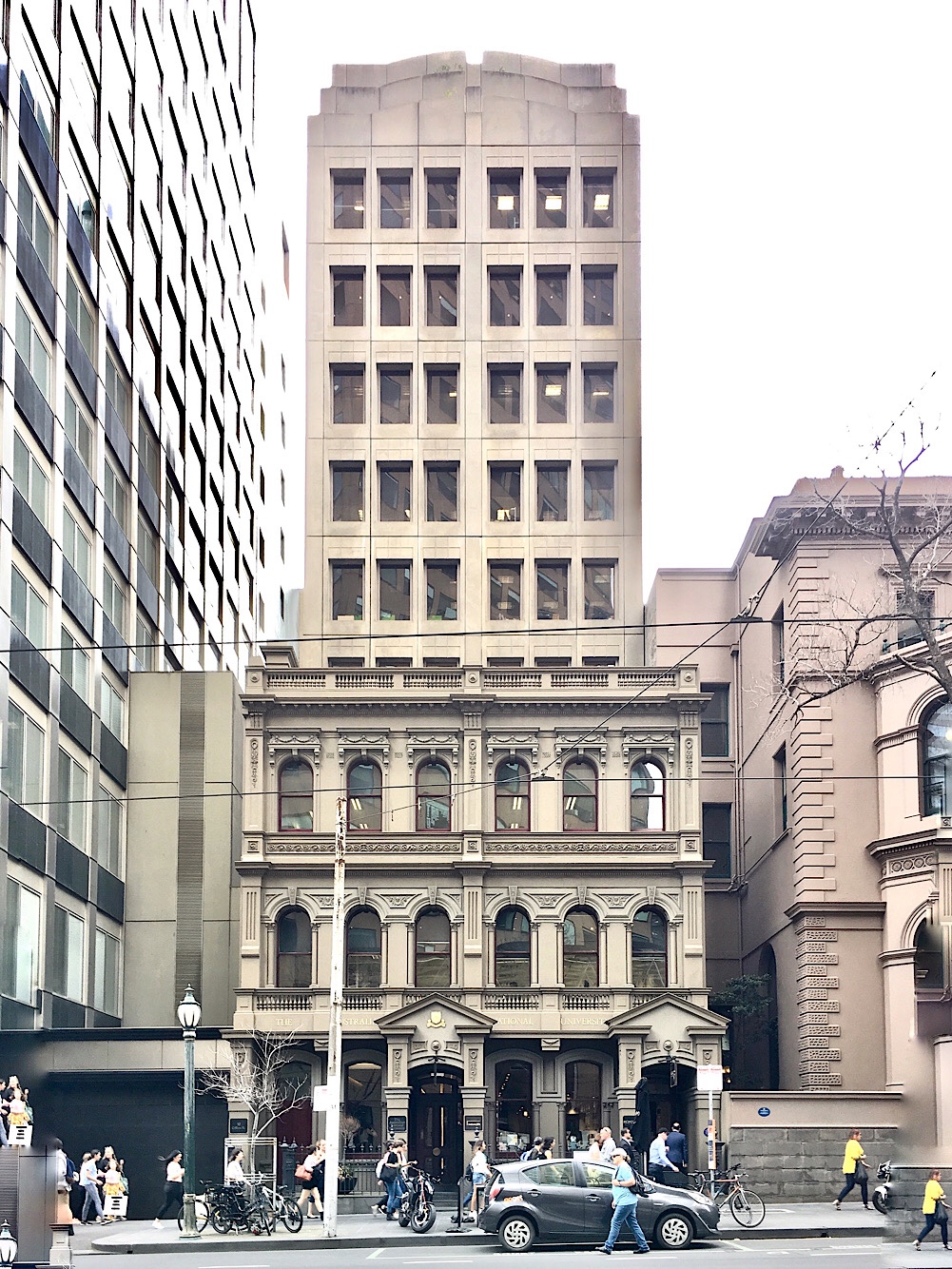 #MelvilleHouse became an example of #frontportionism, from c1989, where the front room or two deep is retained, and high rise built behind. In this case it’s about 8m deep with the tower a couple more. It would work better if the 60s reserve bank had a podium instead of an inset driveway, so you couldn’t see the side. And maybe if the tower wasn’t the same colour. I like the multiple pediments on top though, very #postmodernclassical. Developers Dexus Corp bought this recently as well as the Reserve Bank next door, which thru want to demolish, leaving the front of this I guess, and maybe they will build a podium !