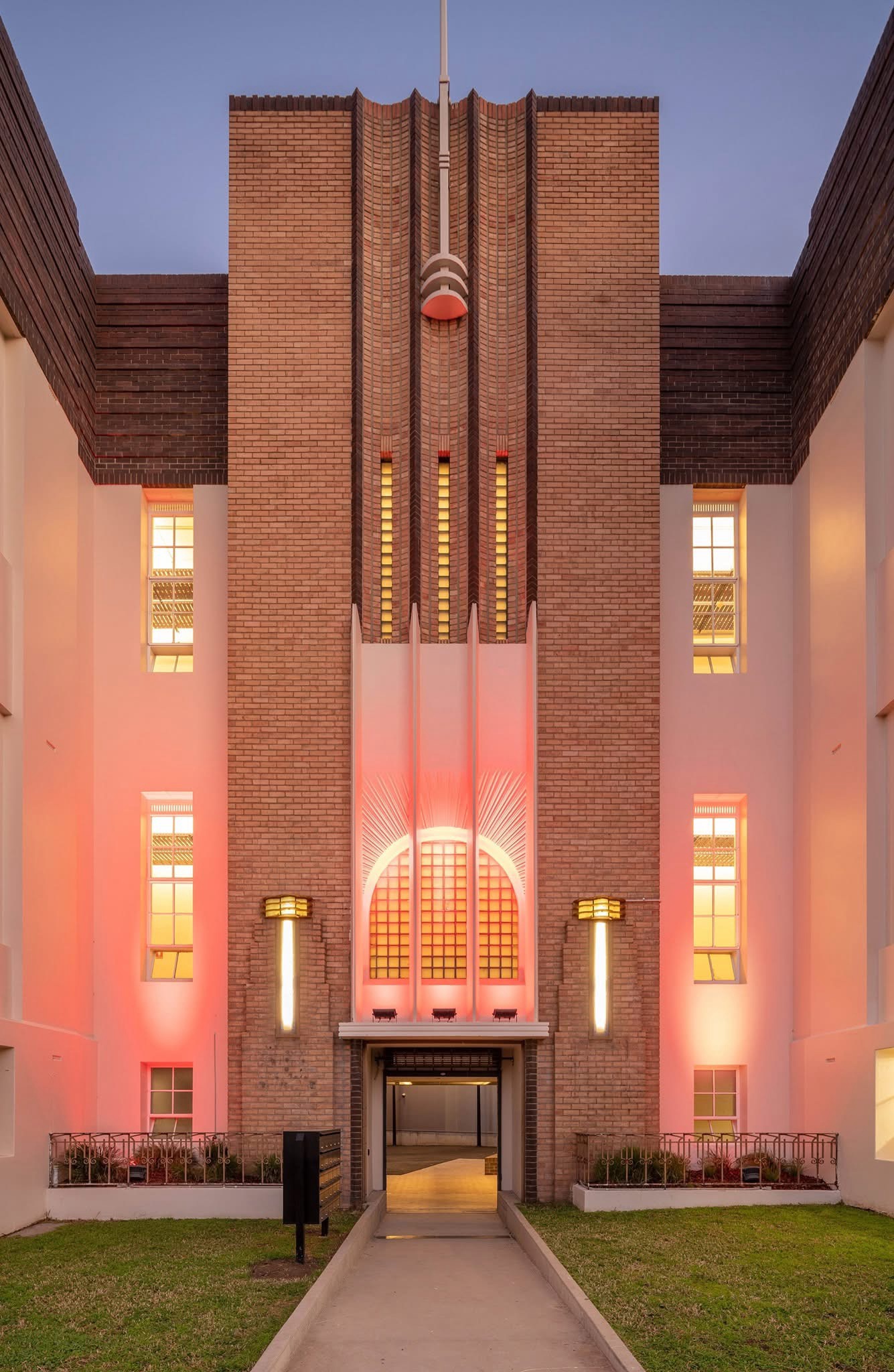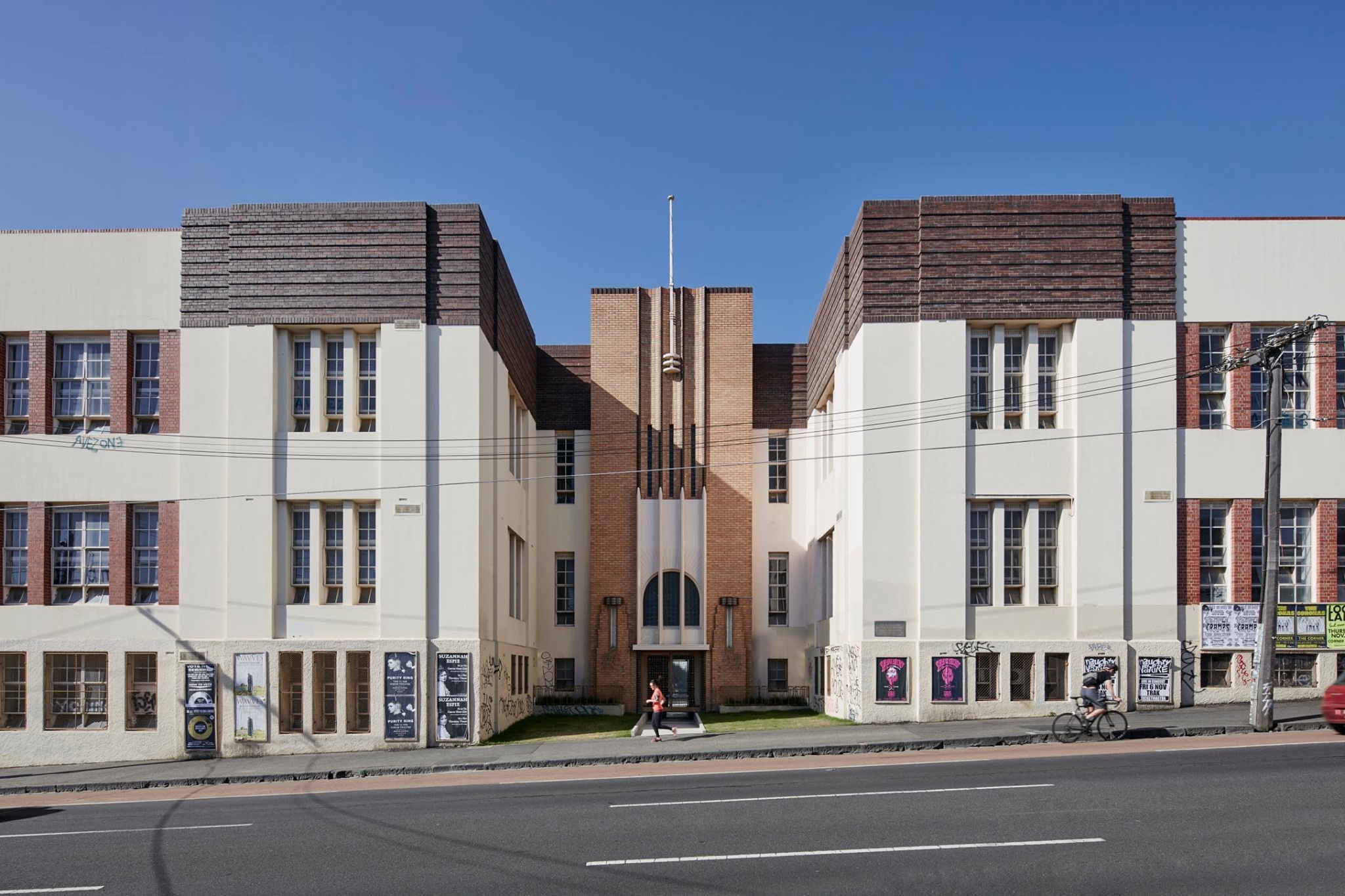 Photos of what’s now Collingwood Yards in Johnston Street I took in 2014 and 2020, plus two recent ones. Fabulous striking entry, with an arched rising sun motif, and scalloped brickwork above, a fine effort by Public Works chief architect Percy Everett, completed in 1939 as the Collingwood Technical School. It is however set back in a relatively small courtyard, so you only glimpse it in passing- it’s a curious decision, presumably something to do with the fact that it was part of an alteration of the original 1912 red brick tech school, though not sure what it looked like before. My 2014 photo was 9 years after it closed, and somehow it wasn’t turned into apartments, instead eventually becoming a non-profit arts centre, providing affordable spaces for creative industries, opening in 2021. Repair and restoration by @fieldwork_architects. I havnt been to actually see it since ! Last two pics from @collingwood_yards. And yes there’s a Kieth Haring mural on the side.
