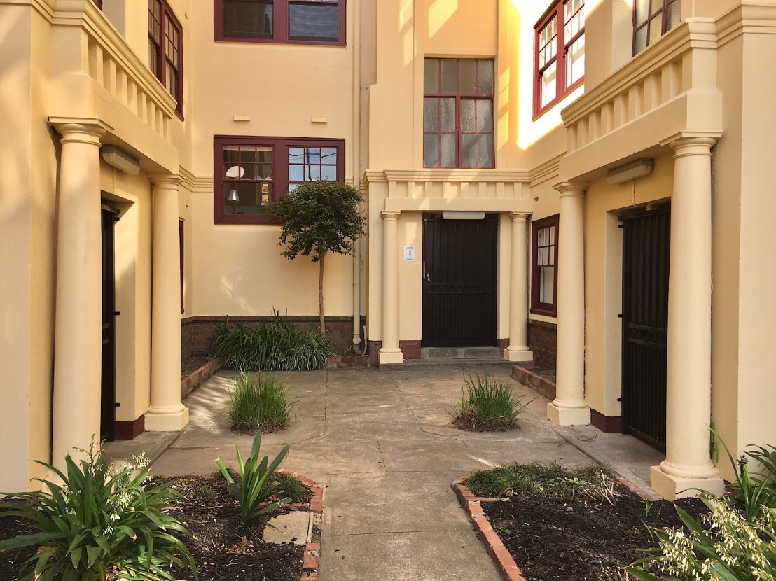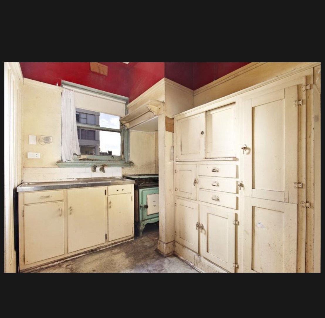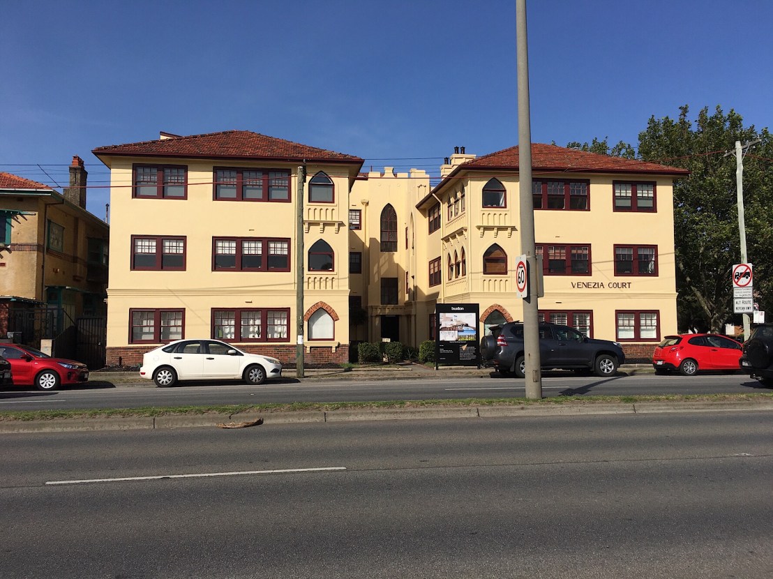 The delightfully named Venezia Court has just enough going on to justify the exotic moniker – there’s some sort of #VenetianGothic #pointedarches, and a bit of crenellation on the rear stair tower, but then it goes all classical for the entries, and there’s Art Deco ceiling roses inside. It was built in 1934, and was designed by #ArchibaldIkin, who also designed the Royal in Robe Street, amongst other flats. I found some interiors from 2011 of a single bed out the back – untouched ! Original kitchen, which had the bath in it too (!). Gone by 2016.