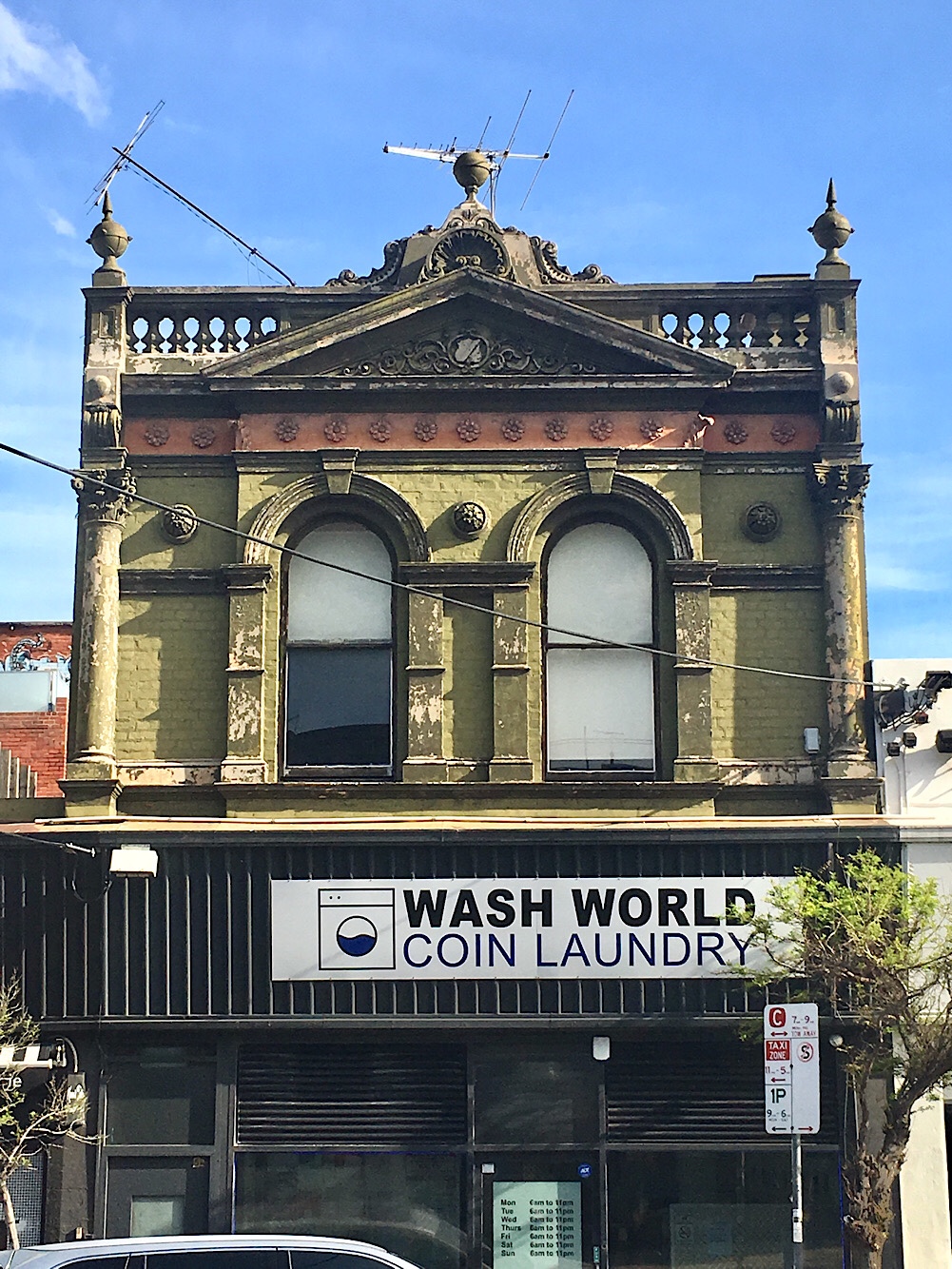 Great elaborate #shoptop in #StKilda; maybe might be #NormanHitchcock, with those brackets on top of the #columns and extra scrolls on top of the #pediment.