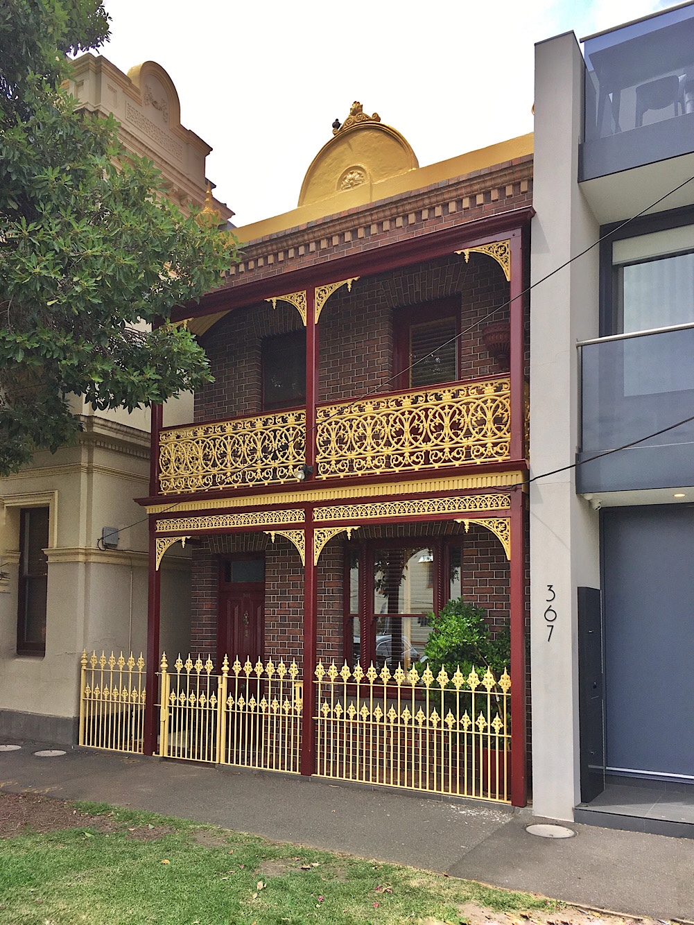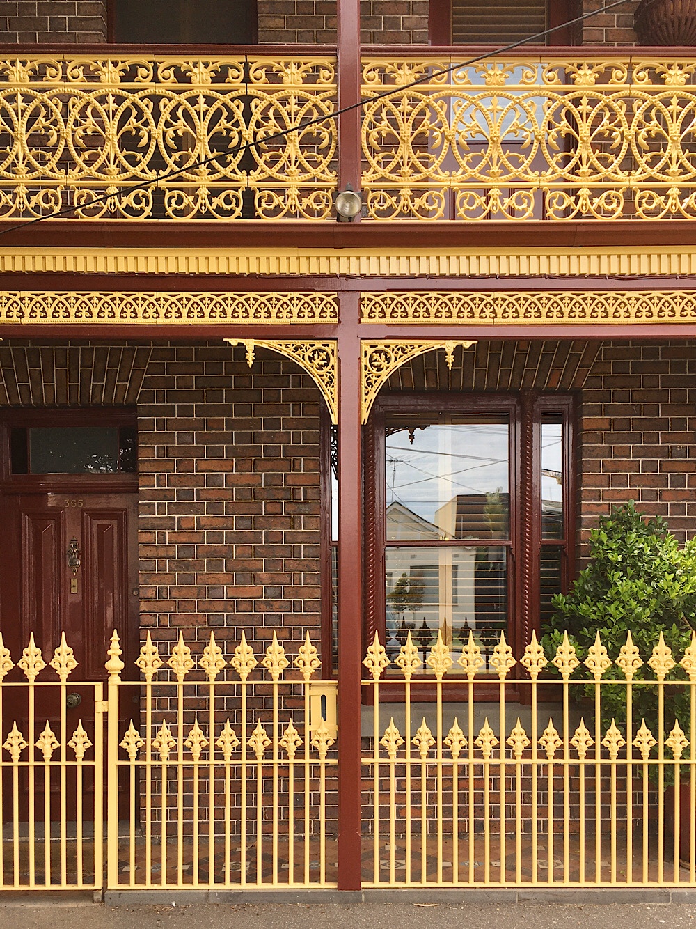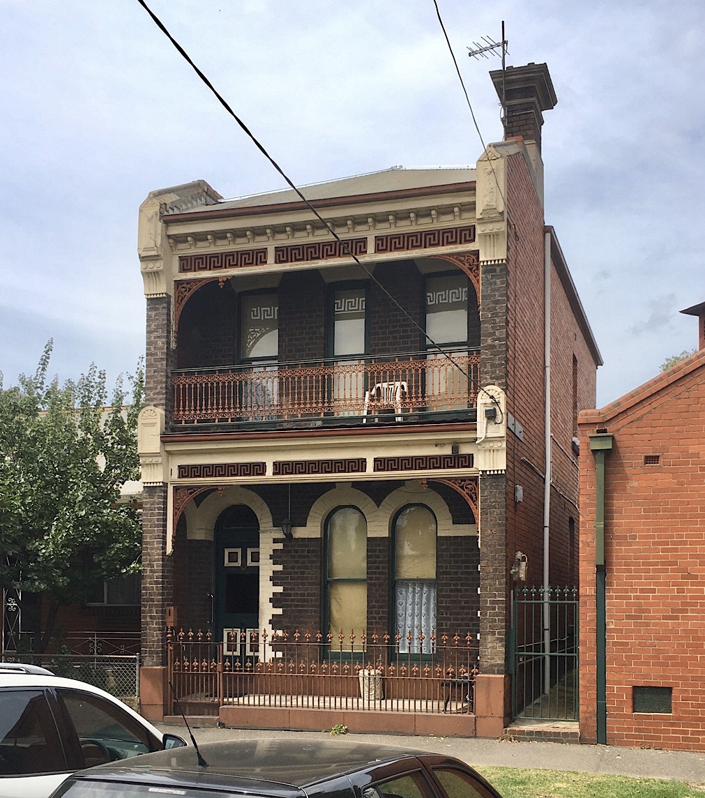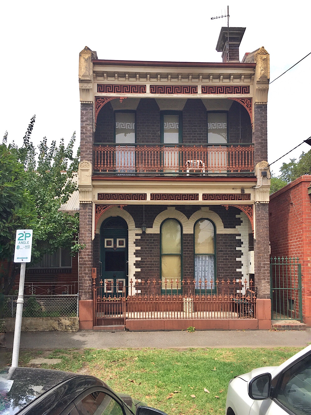 This #VictorianTerrace stood out, firstly no parapet, lots of unrelieved brown #HawthornBricks, thick wing walls in brick with abstracted details, simple #castironbalustrade with an equally restrained #greekkeymotif frieze. Solid and simple.