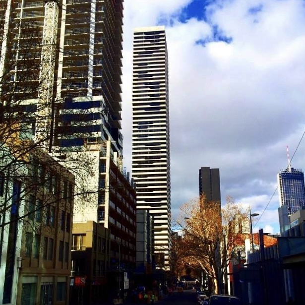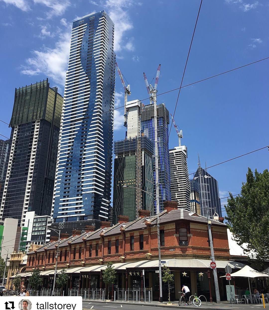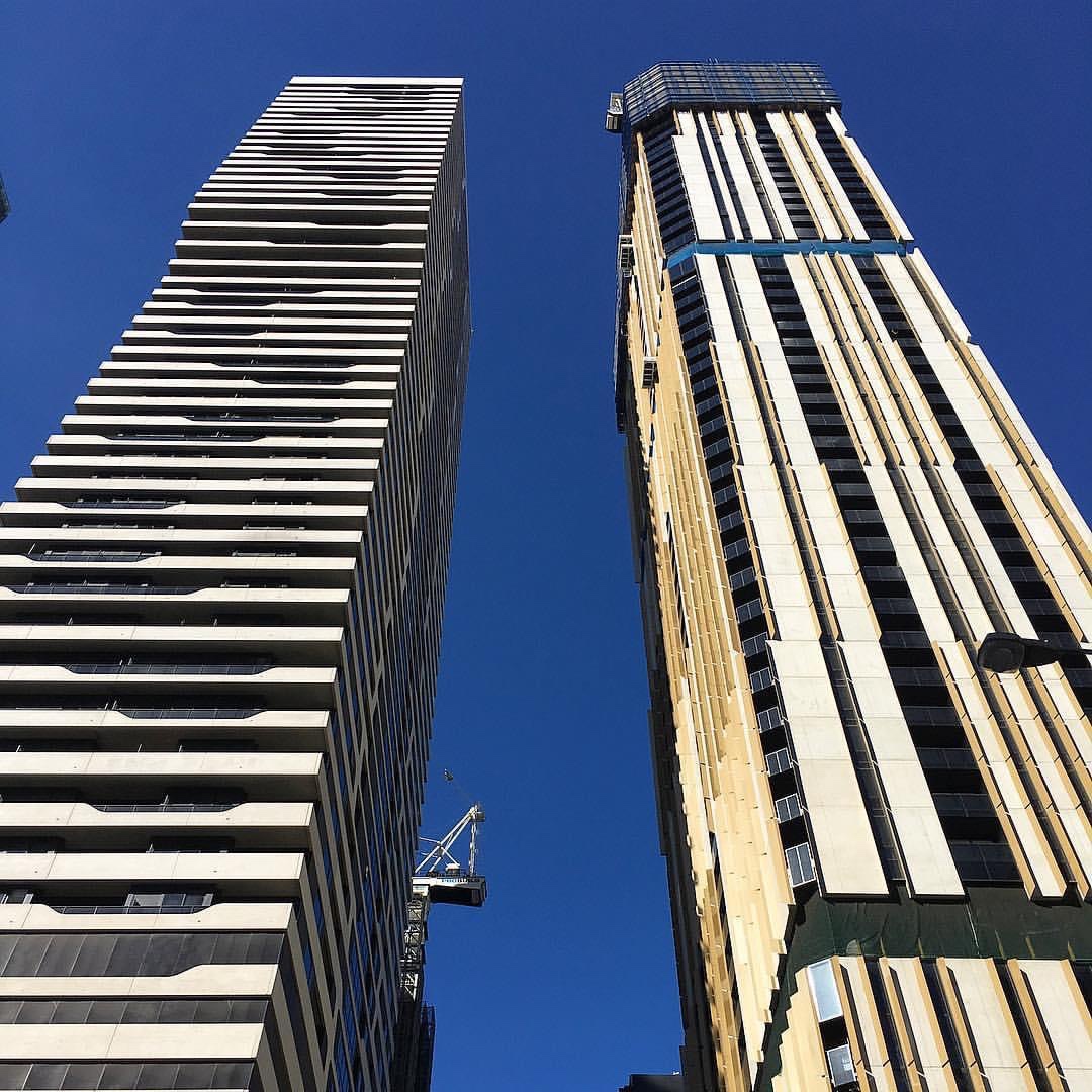 The #fivestepsisters now and and last February, all complete now. As I said last year….”soon they’ll make an uneven extremely tall #urbanwall. In order left to right : #VisionMelbourne (just finished), Peddle Thorpe, 72 floors, 474 flats. #VictoriaOne, Elenberg Fraser, 75 floors, 671 flats. #LightHouseMelbourne, Elenberg Fraser, 61 floors, 607 flats. #MY80 (finished), Hayball, 55 floors, 487 flats. #EmpireApartments, Hayball, 62 floors, 474 flats. That’s um 2713 #flats altogether.” @ Vision Apartments