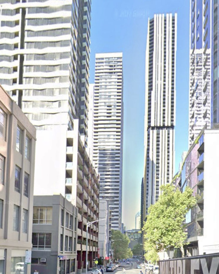 Empire #apartmenttower #elizabethstreet cnr #abeckett by #hayball. I like the super-slim proportions and the wobbly but horizontal expression BUT – it flouts all the rules, sorry ‘guidelines’ – no podium, no setbacks, poor ground level and theres more just like it coming – one behind, with a 5m gap between, one across abeckett, 2 in franklin, one a block up, and others (2nd pic recent streetview). The Minister’s officers who hand out the permits obviously dont think the guidelines are at all important. And the City of Melbourne arnt raising any objections. (Justin Madden issued the permit for this one).