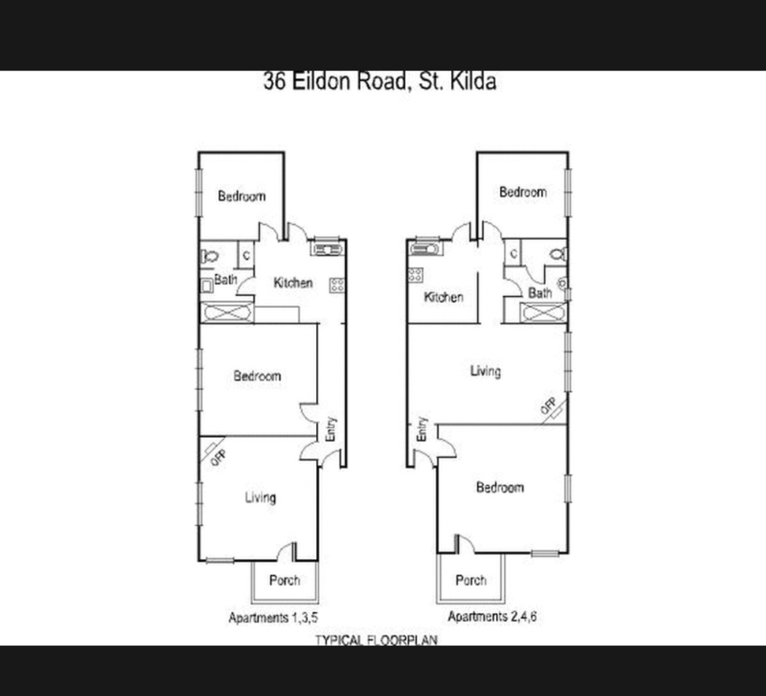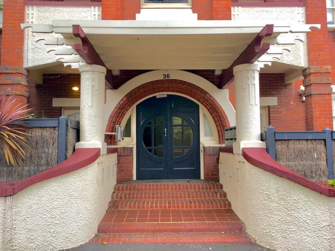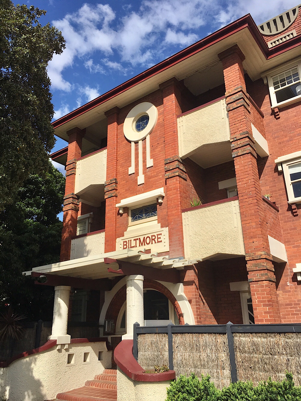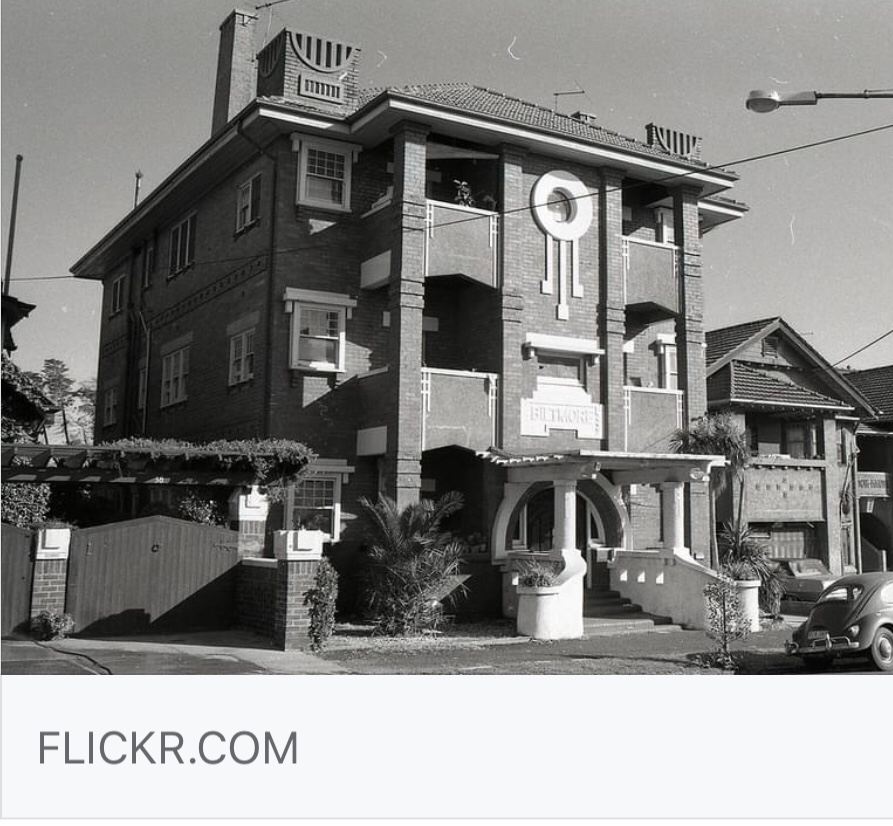 The fabulous vaguely #ArtNouveau but really Arts & Crafts plus Romanesque plus #CalBung pergola called the Biltmore in #EildonRoadStKilda, 1923, no architect known, just Dunlop Home Builders. They’re all 2 beds with a main one and a small one at the back, which opens off the kitchen so I assume for the maid, though the point of flats in the early days was that they were easy to look after. Maybe they all had the corridor originally? Still, looks like for staff or maybe possibly noisy kids. The block was only #stratatitled in 2008.