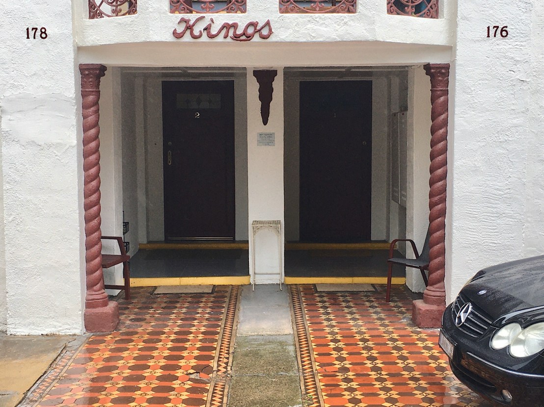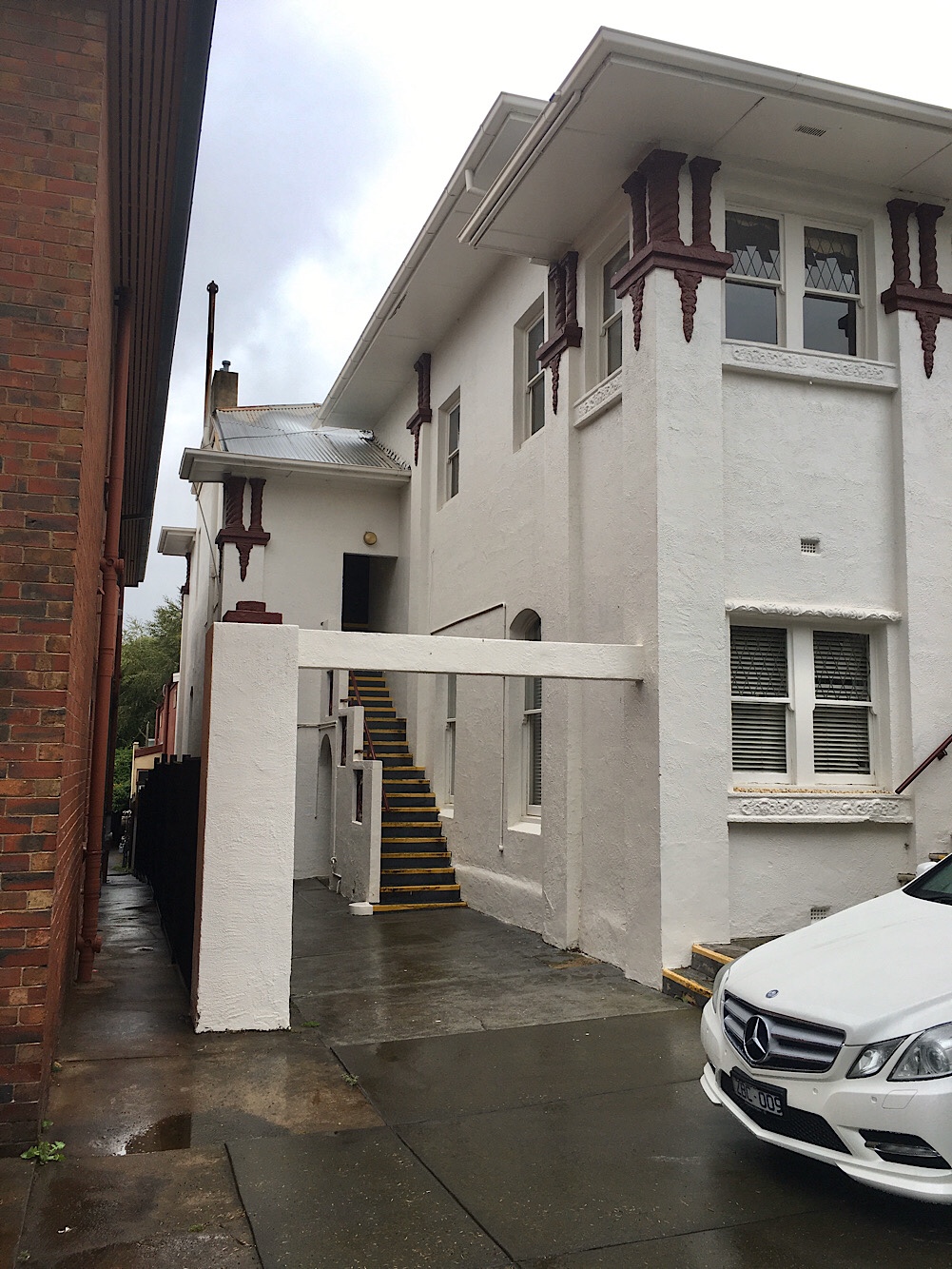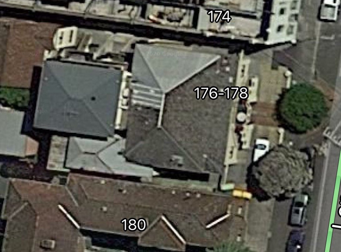 #Kingsleigh (part dropped off) interesting Spanish style #blockofflats in Lennox St Richmond, with a curious array of details, dating from 1934 – might be by #HowardLawson; but definitely it is made out of a pair of #VictorianTerraces, the #tessellatedtile paths are still there! And you can see in goog satellite the typical front and rear wings arrangement. Also explains the use of #castironlace panels, reused from the house, cos not at all usual in the 30s, but Lawson did use them at #BeverleyHillsSouthYarra