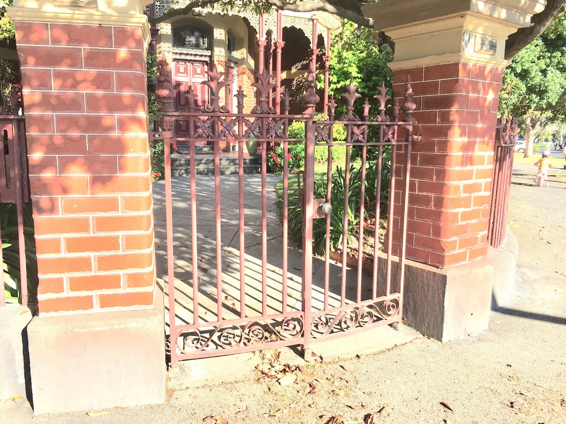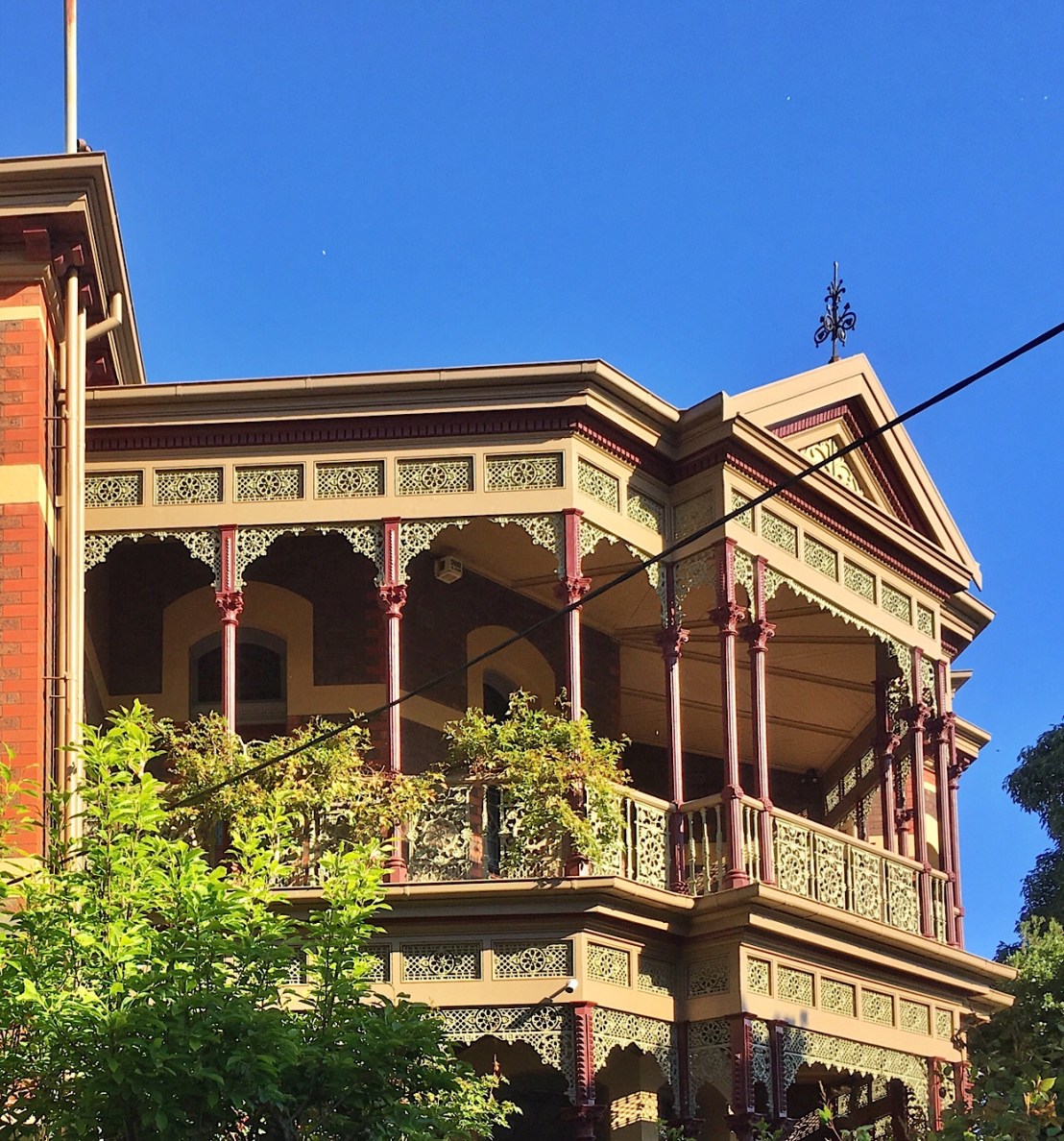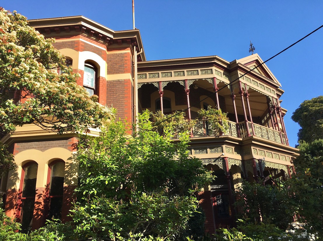 Fantastic house in #StVincentPlace #AlbertPark by #FrederickDeGaris, who did some pretty OTT Italianate stuff, but here in 1893 went for an eclectic mix, #polychromebrick like the so-called #LombardicRomanesque, with round arched windows, the diagonal planning that was later so typical for Edwardian houses, and a wonderfully lacy complex #castironverandah. And that timber porch in the side over something that might have been a garage looks great, no idea if original. Also, great restoration, very nice #colourscheme.