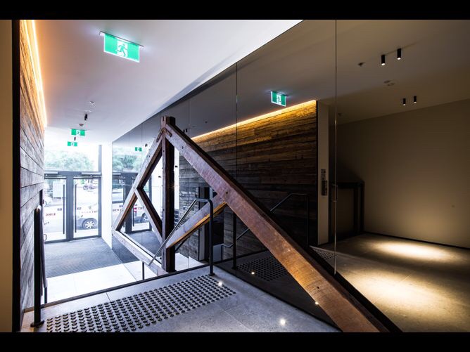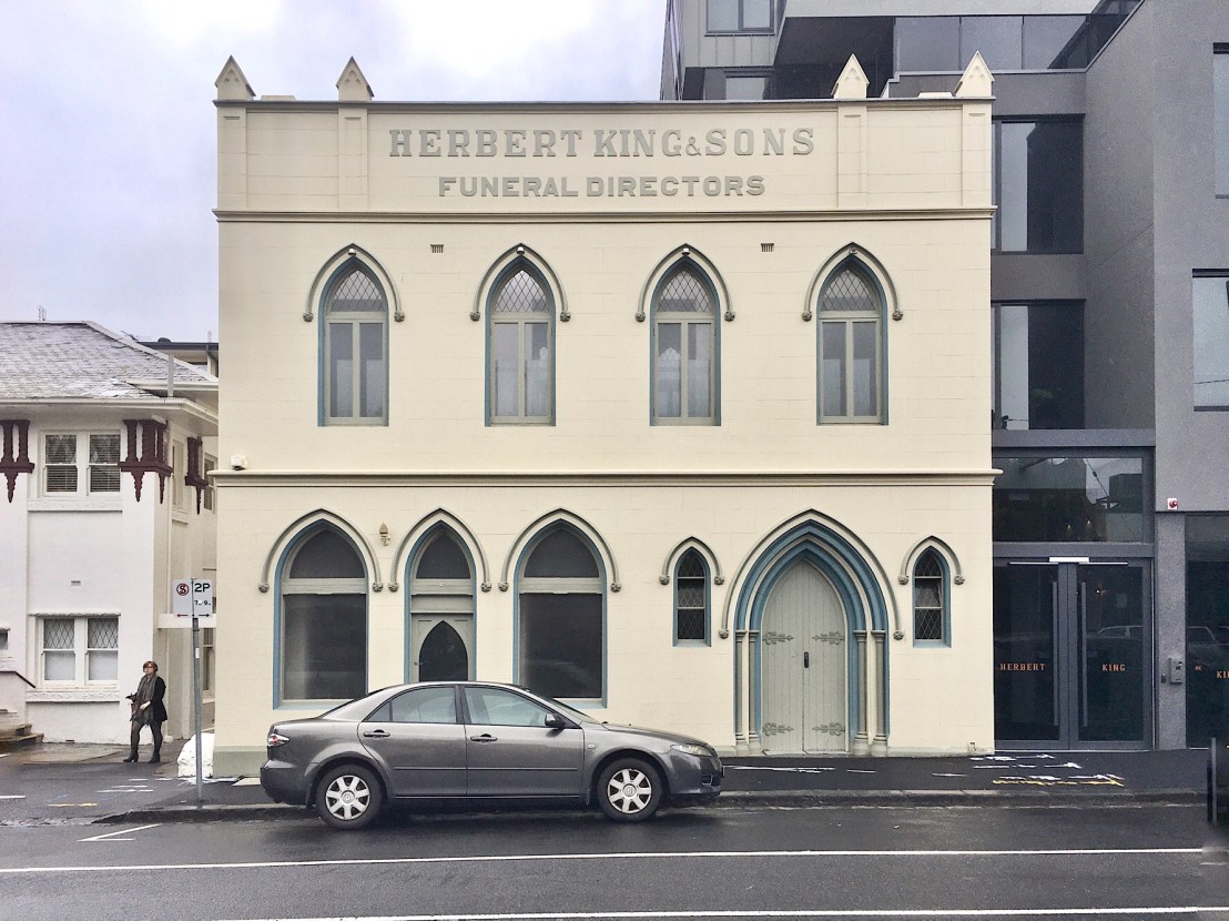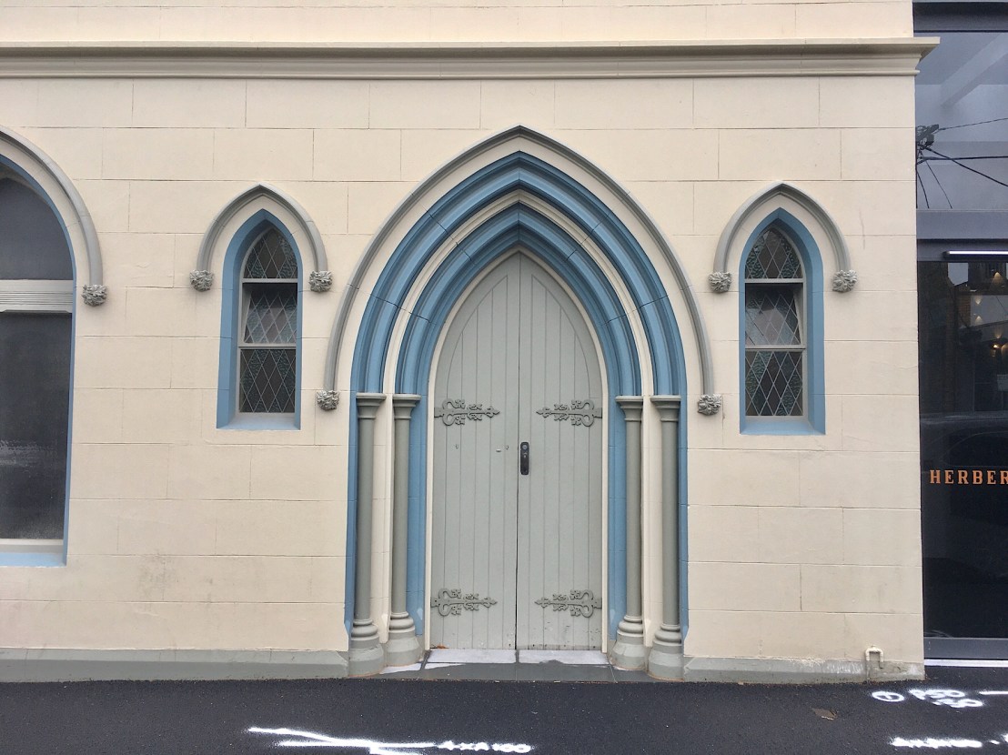 Not a bad example of heritage+high rise, I suppose it helped the original building only half the site – anyway, it’s not totally dominated by the new (which is a big hulking though, by #ChTarchitects). Not sure they’ve kept anything more than two and a bit walls, and one roof truss which sits in the foyer, but better than most. Some flats are two level and face the south brick wall, so not much light, I would have been ok with putting some windows in that wall, not a huge change, and in return kept something if the actual building not just the external walls. I wonder if that’s an office behind the ground level gothic windows ? I can’t find any info about #HerbertKing but it looks 1920s to me, and they’re still going, in Ashburton.
