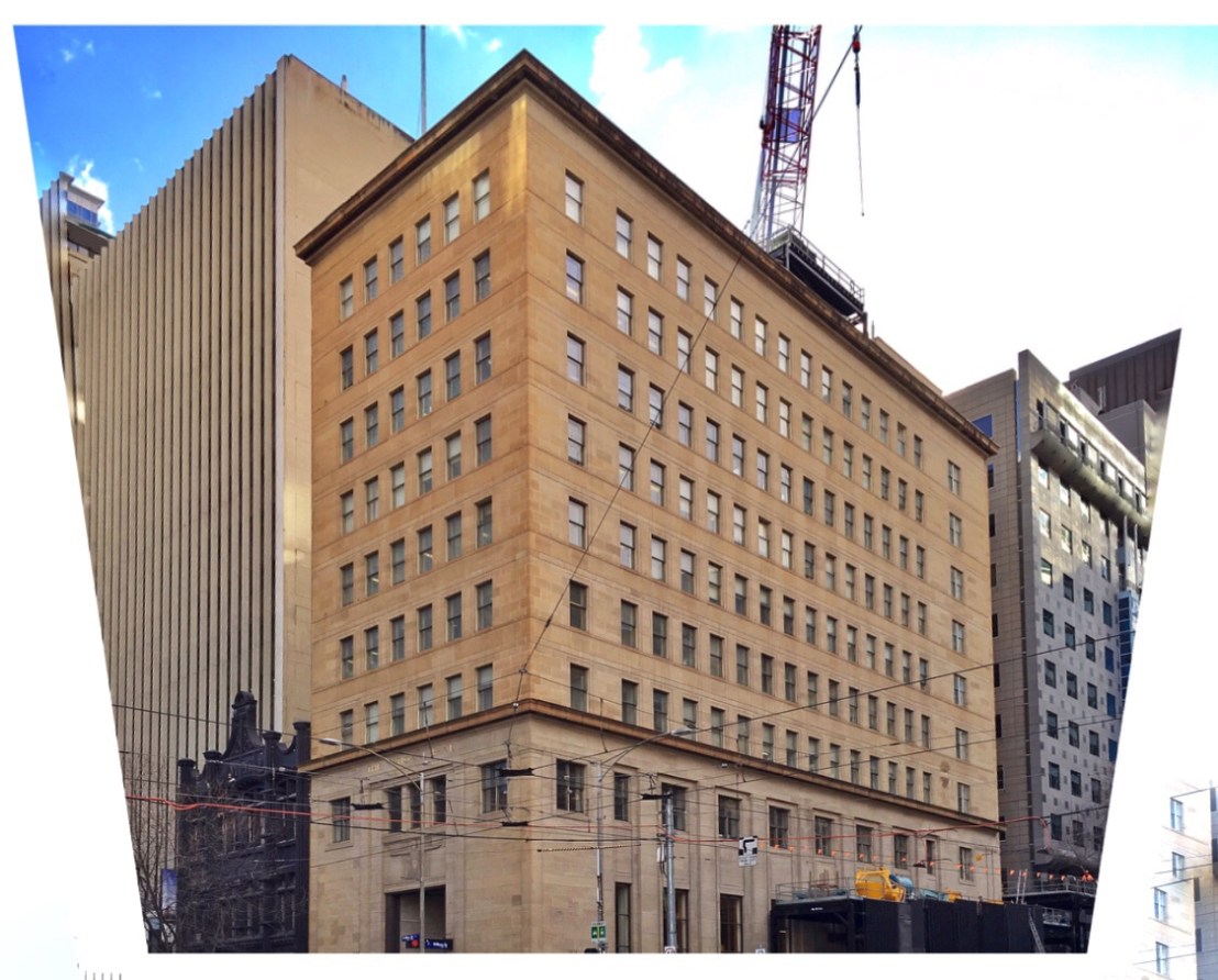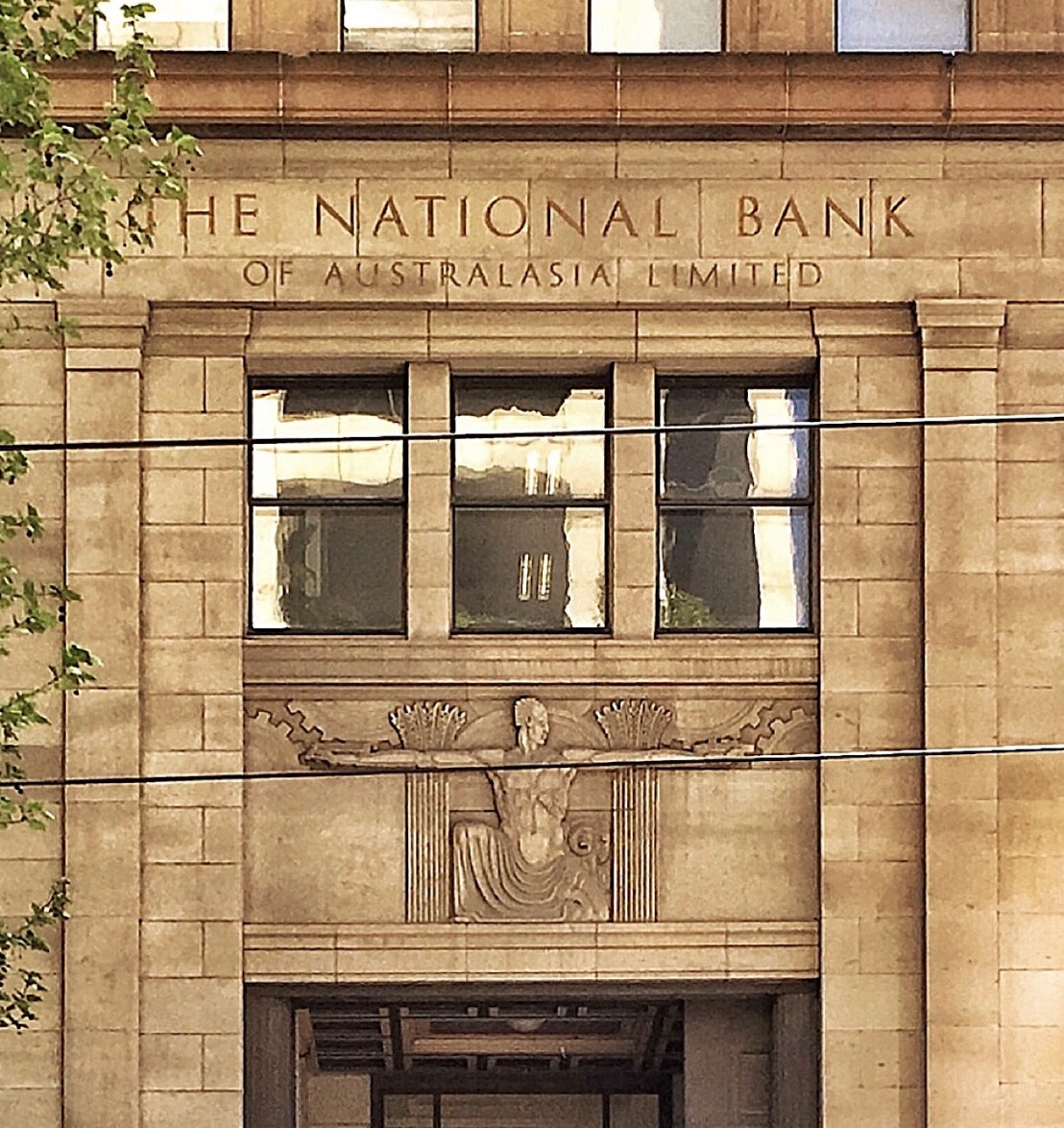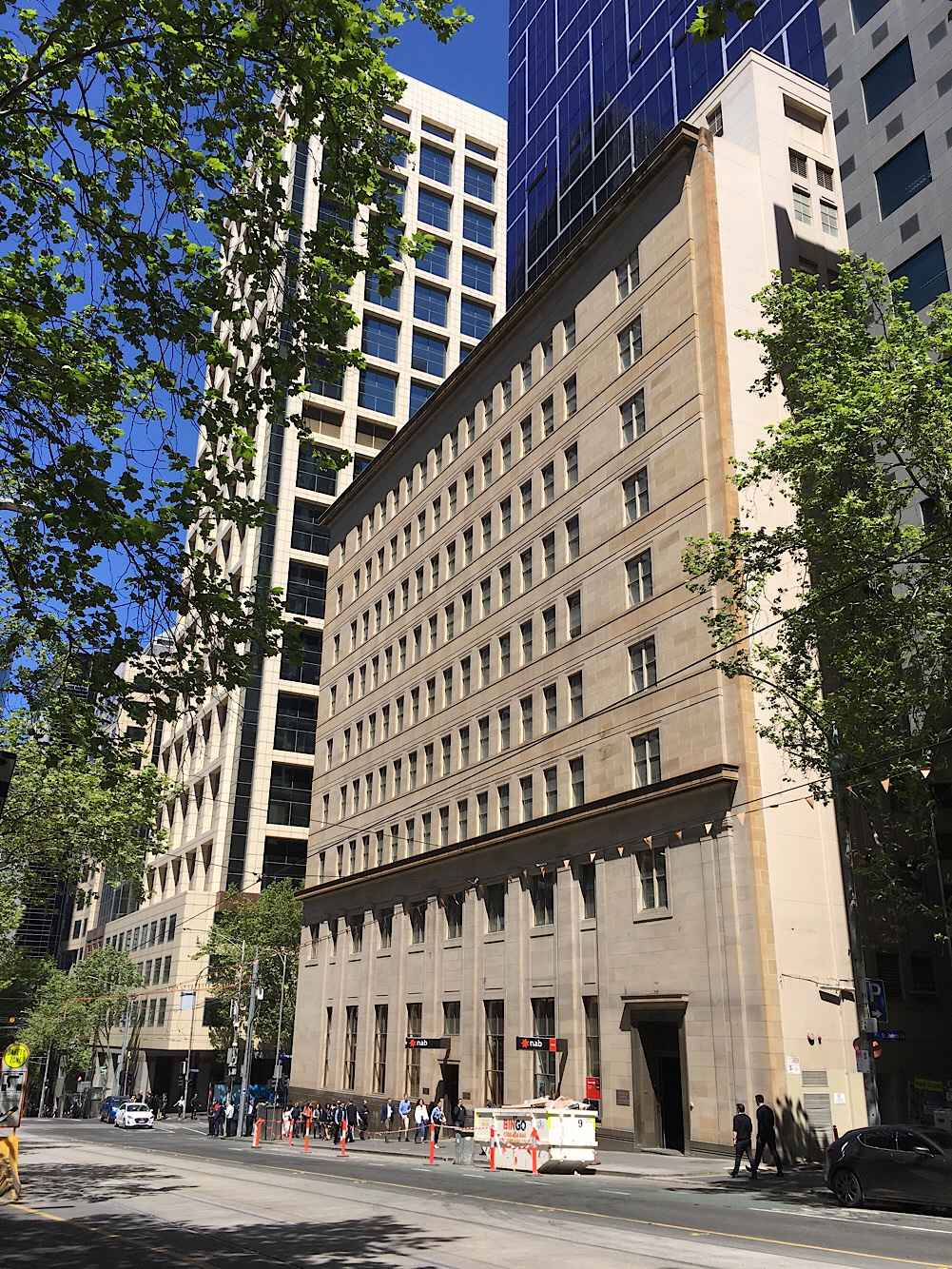 One good thing about the #CollinsHouse high rise, in Oder to gat a larger floor area by cantilevering they bought the #aireights above the 1939 #NationalBankWesternHouse, so it’s protected from any kind of high rise redevelopment in the future. Built 1939-40, and designed by #MeldrumandNoad, it’s pretty severe #strippedclassical, all in sandstone. I’ve heard of described as ‘fascist’ style, but it’s pretty typical for the time, and more Modernist than the Nazi’s would have liked. It was liked at the time, and won the last #StreetArchitectureMedal in 1942. The bank chamber is mostly intact, and is the only grand intact interwar bank in the CBD that’s still a bank.
