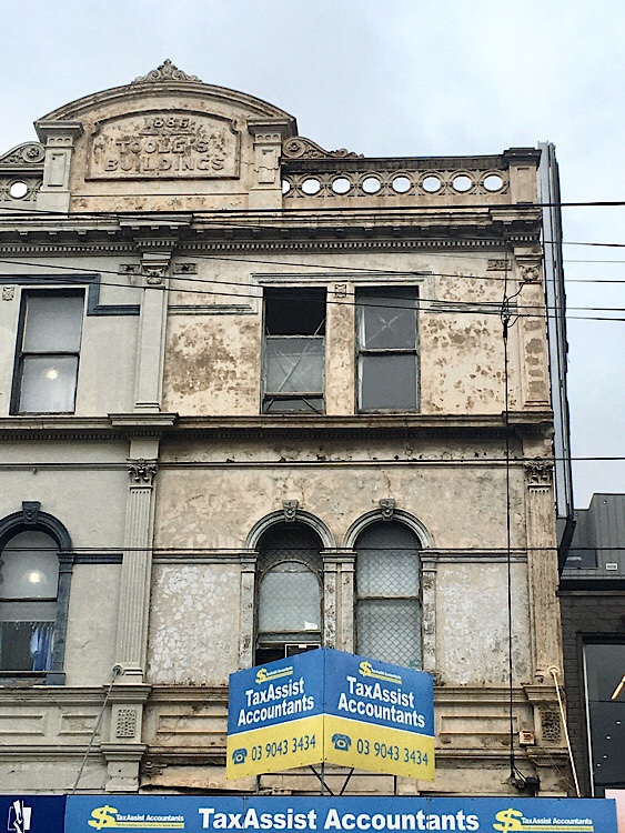 On the opposite corner is Toole’s, 1886, #BridgeRoadRichmond; the right hand part appears to be abandoned above the ground floor, and the parapet pediment isn’t centred ‘cos there was once another bay.