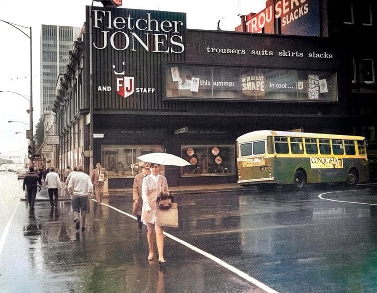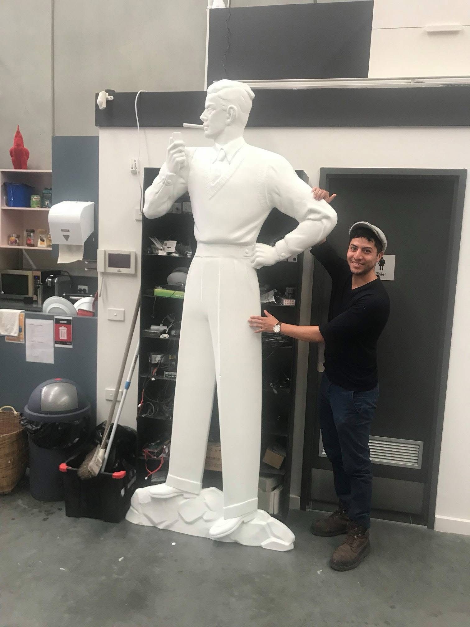 Apparently he’s called the ‘Plus 8 Man’ and I’d know this if I’d been to Warrnambool more than once, since there’s another one there, in the ex-factory gardens, complete with name. That one had been damaged and in storage for some time, but when the city store was being facaded, they went up and scanned one so they could make new one ! Plus 8 referred to the extra 8 inches of material that gave them such a full pleated look; don’t know if this was new in 1955, with the tucked in vest it looks very 30s to me. And just realised even though they reproduced the lost Queen Street facade, they didn’t include the two figures.