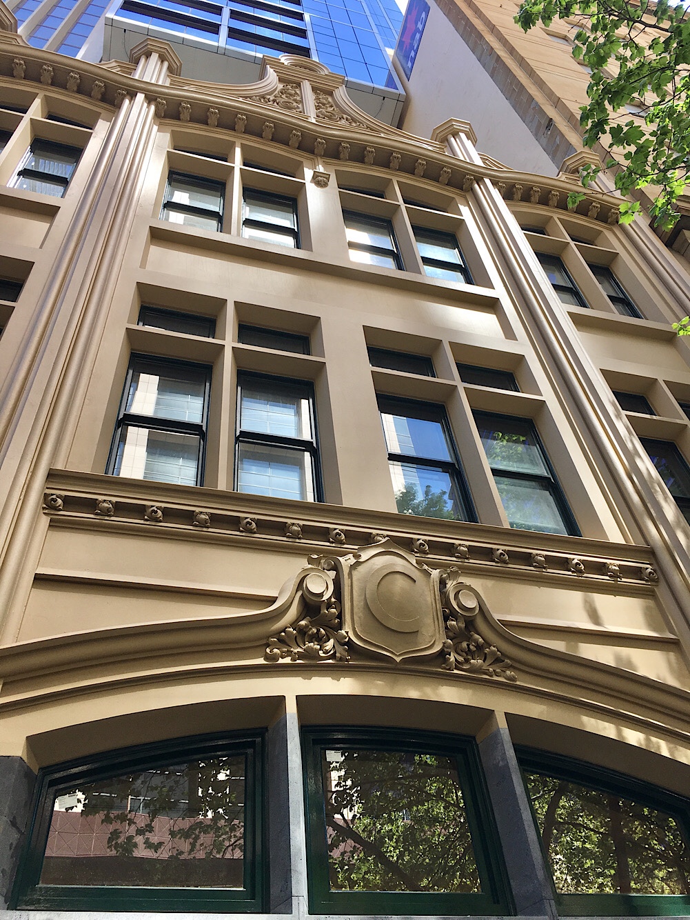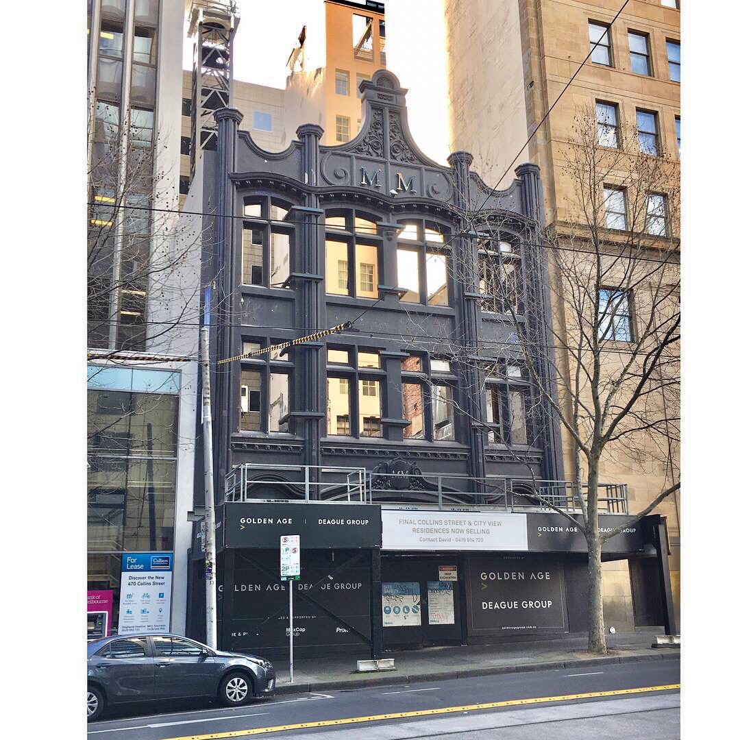 The facade of the 1908 #HuddartParker shipping co by #CharlesDEbro at 466 #CollinsStreet has been restored rather well – all the window frames lost at ground level have been reinstated (in #bluestone!), while also swapping the door to the uphill side to achieve level access; the only thing missing is reinstating the brick panels, which was on the plans but hasn’t happened. And it’s only a facade ☹️ but with a recreated chamber inside 😊