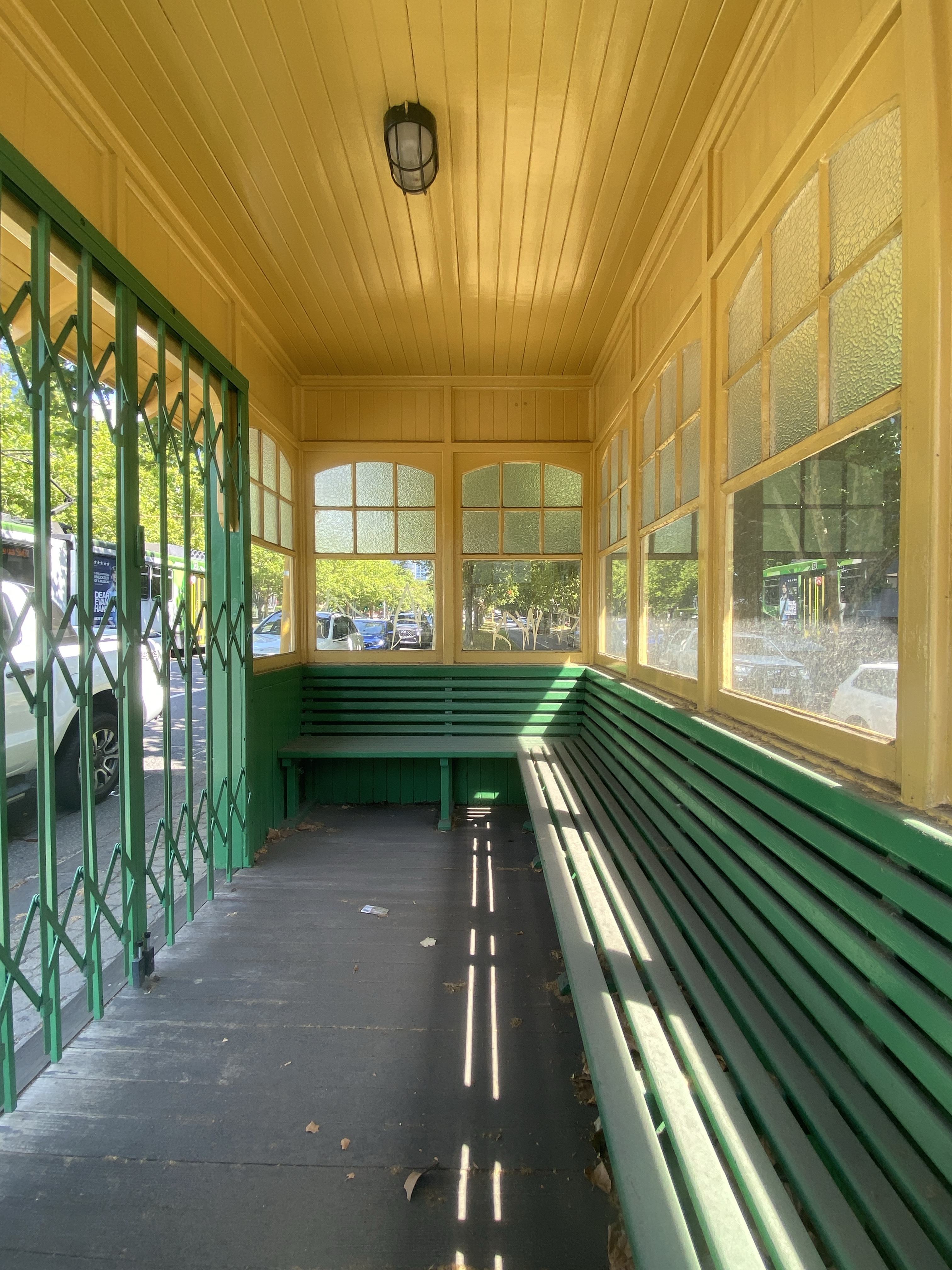 Who doesn’t ❤️ the #TramShelters about town ? This one on #StKildaRoad at #CommercialRoad was first built in 1915, designed by #LJFlannagan, for the #PrahranAndMalvernTramswaysTrust, one of the many municipal #ElectricTram systems that added to the Cable Tram system into the suburbs quite rapidly between 1906-1919. A bit surprised to read this is largely a reproduction from 2001 after someone drove a car into it – which was just after it had been restored ! (I remember the crash but thought it had just been repaired). It had survived fine for nearly 90 years, though been through some changes; originally built on the Commercial Road footpath outside the Chevron (where the electric trams met the cable tram lines on St Kilda Road), moved to St Kilda Road at some point, but with the opening on the other side, and a section removed on the tram side. When I was at the @nationaltrustvic in the 90s ‘they’ (i forget who exactly, must’ve been Victrack) decided to restore all 16 Tram Shelters using me for advice. This one was hoisted up and turned around, and the missing panels reinstated. After paint scrapes revealed many different #colourschemes (mainly different greens), I decided they should all be ‘Tramway’ #greenandcream, the colours that the #WClassTrams and that most of the shelters had been from the 1930s to 1980s. I stand by that decision, even though that was not the ‘original’ colour scheme here (might have been brown and cream?). I also chose the industrial style lights, similar to what was there, which may have been 1930s, prob not the original, if they had lights at all. Then this one was scorched by fire in Oct 2013, so they’re all painted up nicely, but all closed off now, no place for the homeless or arsonists or anyone else. First shot 2018, others 2020, and one of when it was burnt.