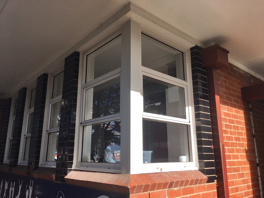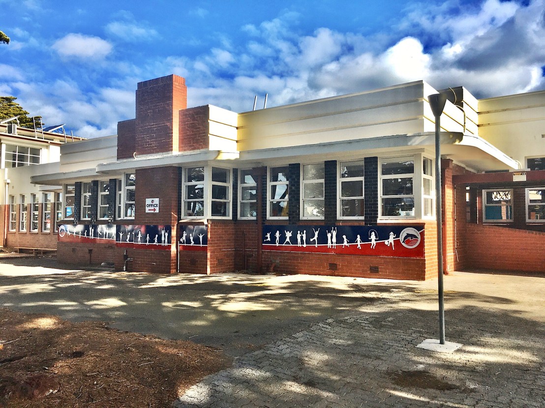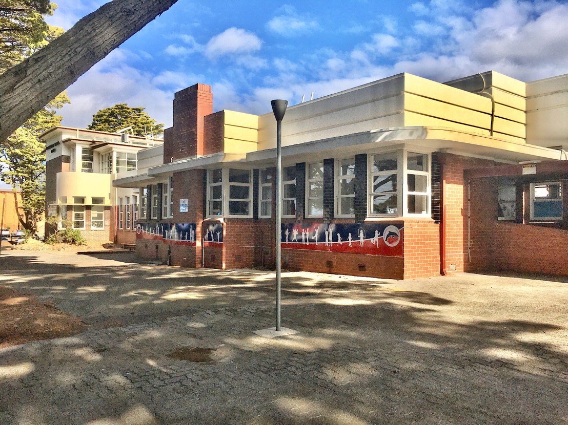 Frankston Primary School; two stages, both by #PercyEverett, Chief Architect of the #PublicWorksDepartment, and very characteristic, with that horizontal sunshade running all round and through vertical windows, and two tones of brick plus render. I thought the two storey end looked like maybe a good attempt to copy his style from the 80s or 90s, so neat, few details, but it’s 1945 (!), and was added to the earlier slightly more elaborate one storey section, built in 1938. Both parts have new aluminium window frames, chunkier than the original steel ones.