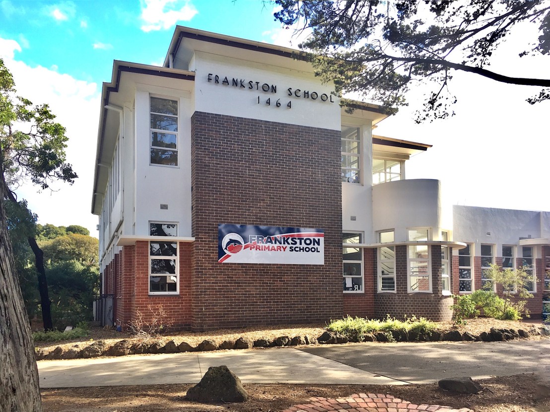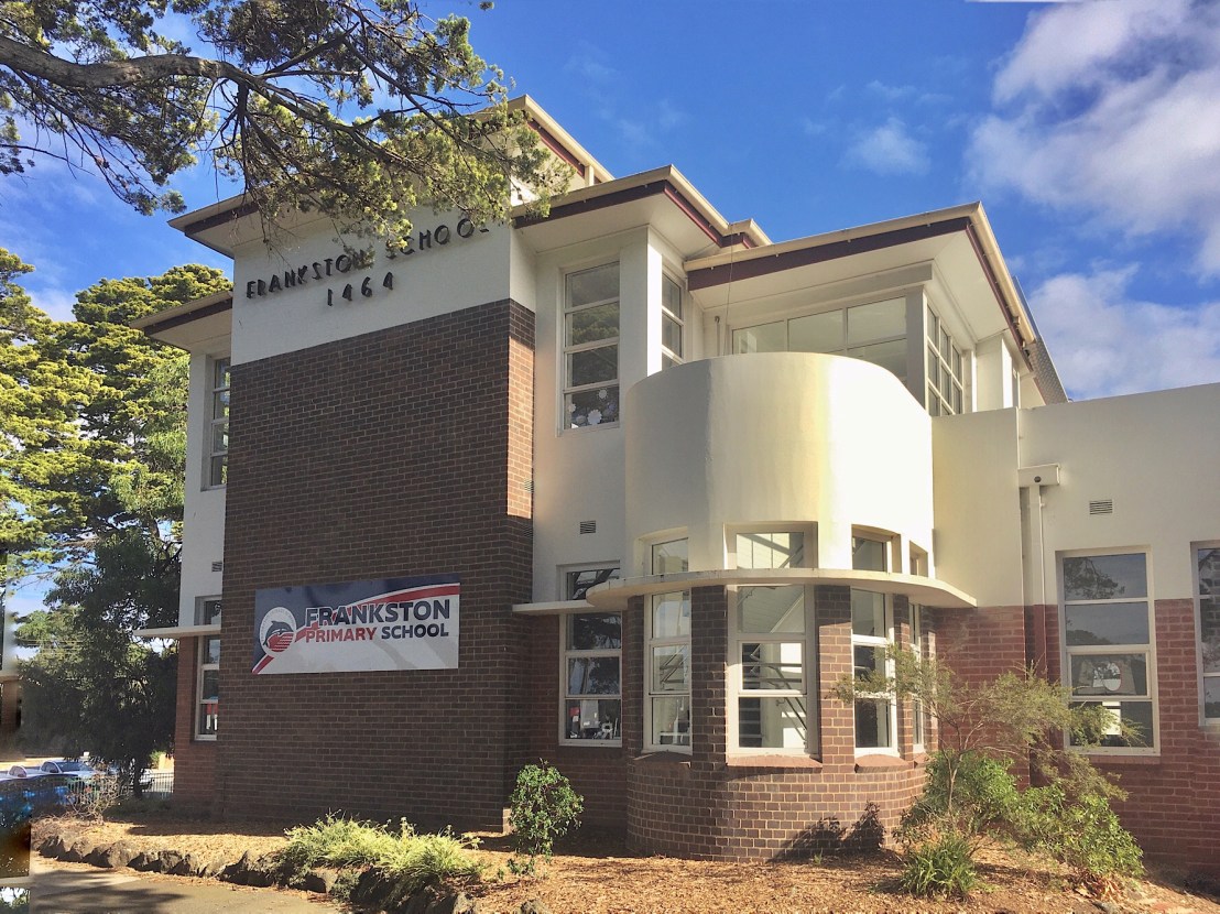#FrankstonPrimarySchooln- the sign on this cute, tall single room classroom block implies it was built in 1874 when the school was established, but, I thought, ‘it doesn’t look very 1870s, looks almost Edwardian in fact’, and turns out it was built in 1889- the original school was timber. It’s not really Edwardian, all that timber work fooled me, the #polychromebrick is very 1880s, and this was when the department was moving from their typical brown brick gothic into other styles, it’s a bit eclectic actually.