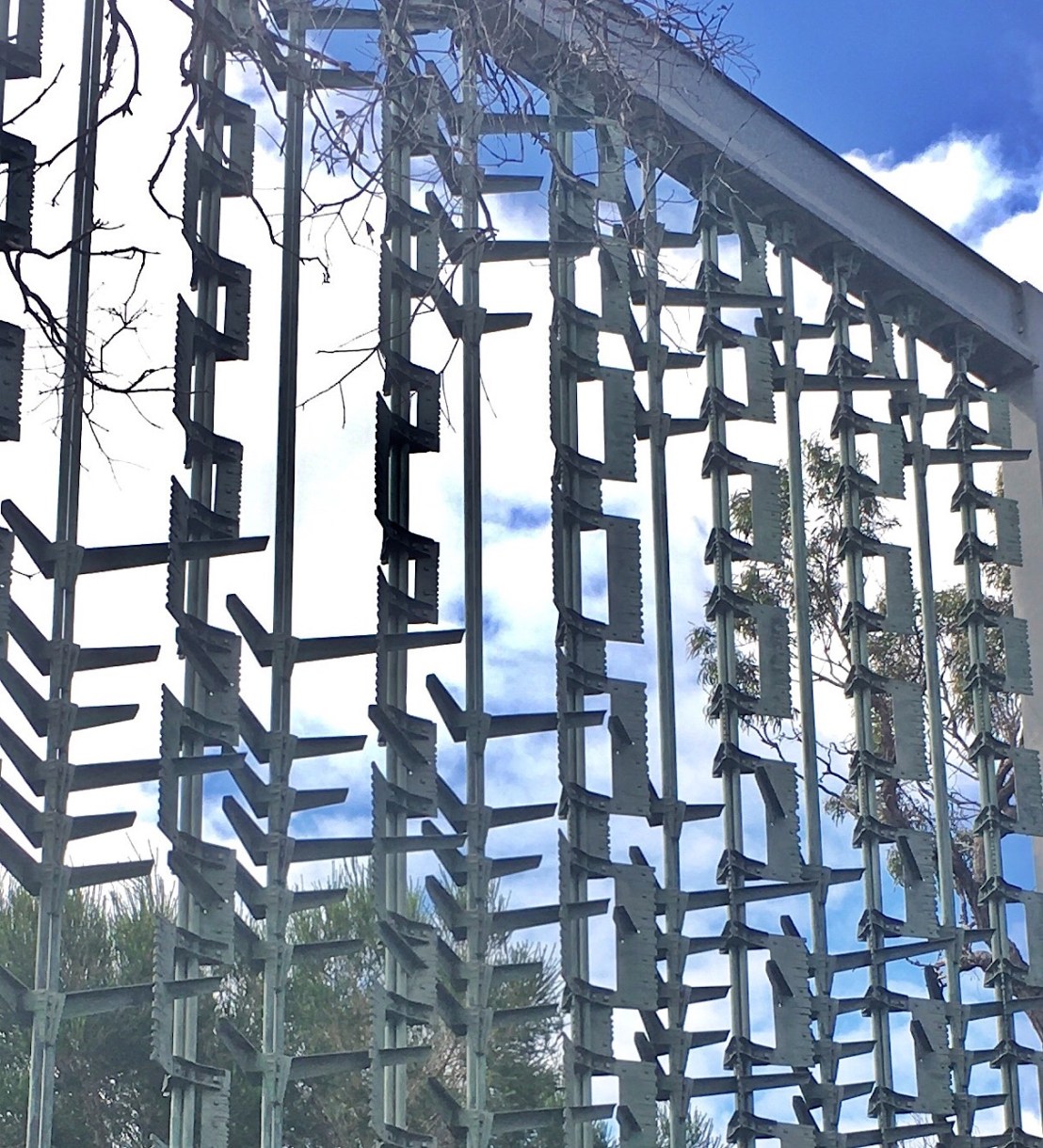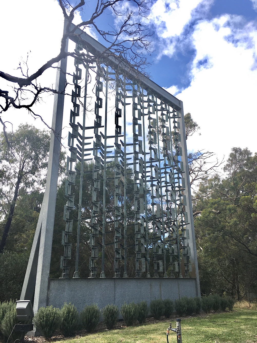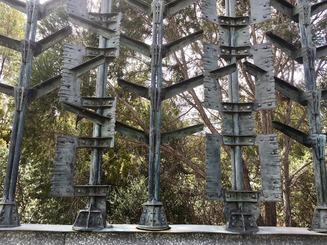 For some reason this is the thing I most wanted to see at #McClellandSculpturePark – it’s a giant screen, made by #LentonParr for the Customs House office block on the corner of William Street and Flinders Street in 1967 – and it’s great ! Placed where it has a strong presence but the sun is always behind it, so close-ups are best. Very textured, it’s all hmm flaps and blades, maybe something to do with electricity since it was designed to screen a #substation, but maybe not. Also, it’s symmetrical, hard to tell until you get up close. Moved here in 1996 when the building was sold and done over. That makes 4 relocated works here that I found and I know there’s more.