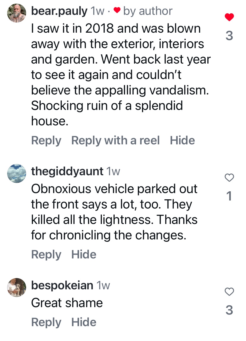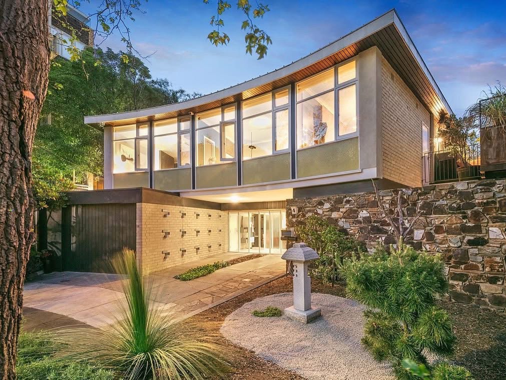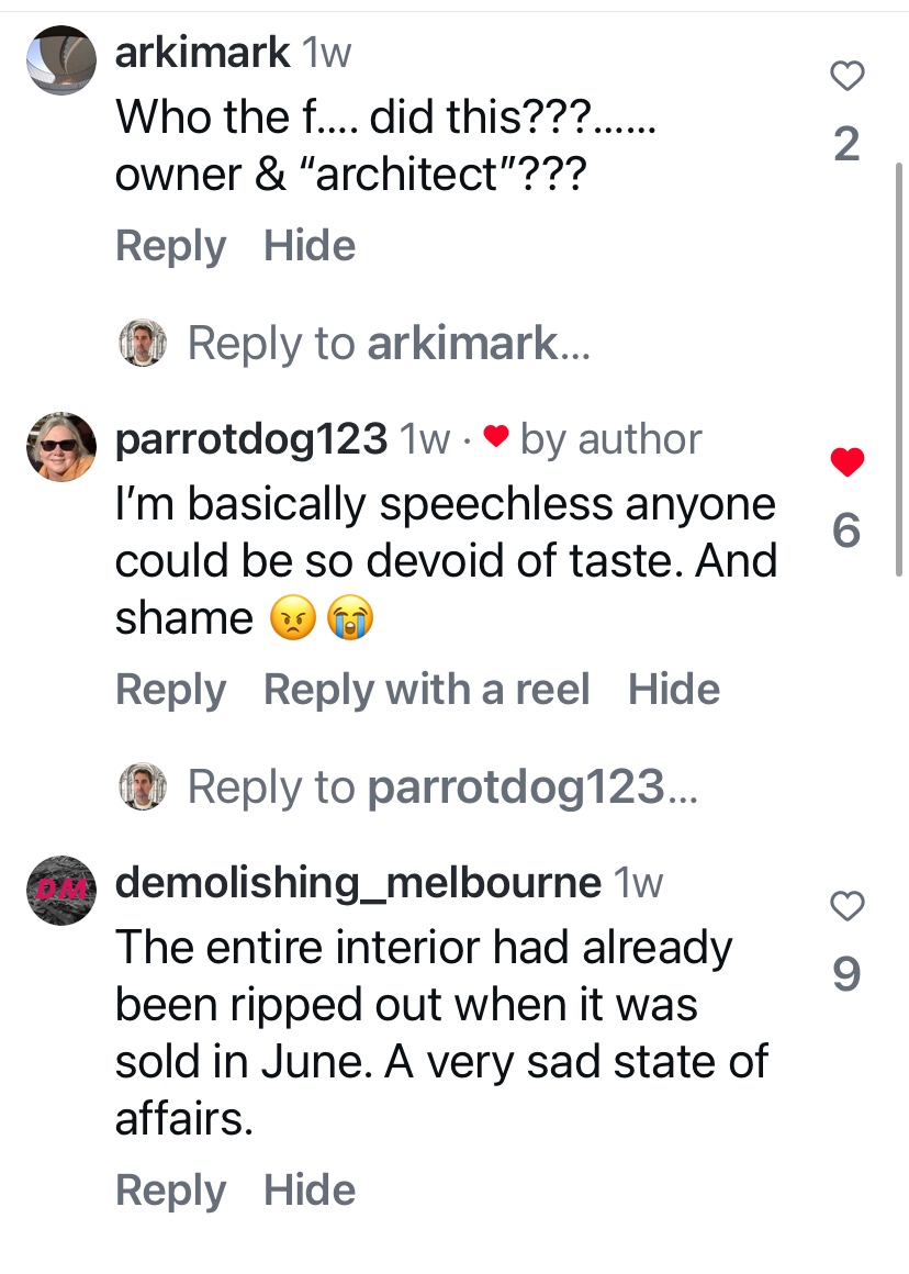 Posted this fab house in Toorak in 2018, and this year was annoyed that it wasn’t included in the (short) list of modernist places in a heritage review – but now I can see why ! It was sold in 2020, looking very intact (pics 4-9), but was sold again in June this year with the photo of the front showing it was partly ruined (presumably rendering). There weren’t any photos of the interior this time, but they did put up images of an approved plan that destroys it even more. Update : it’s been gutted actually, so there’s almost nothing left.