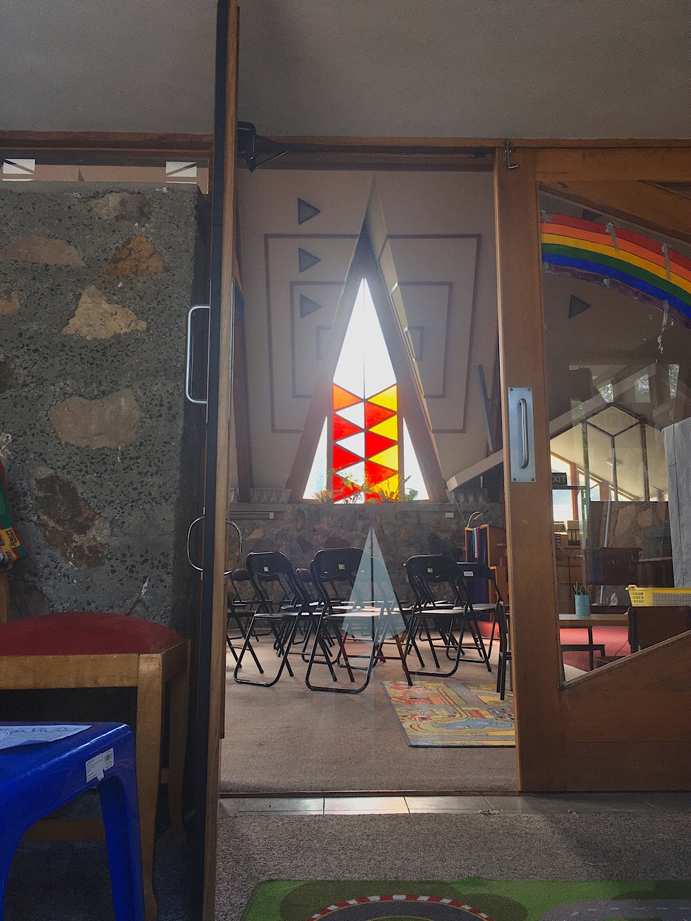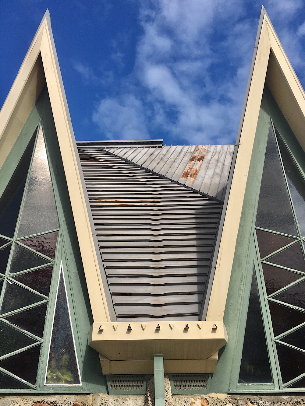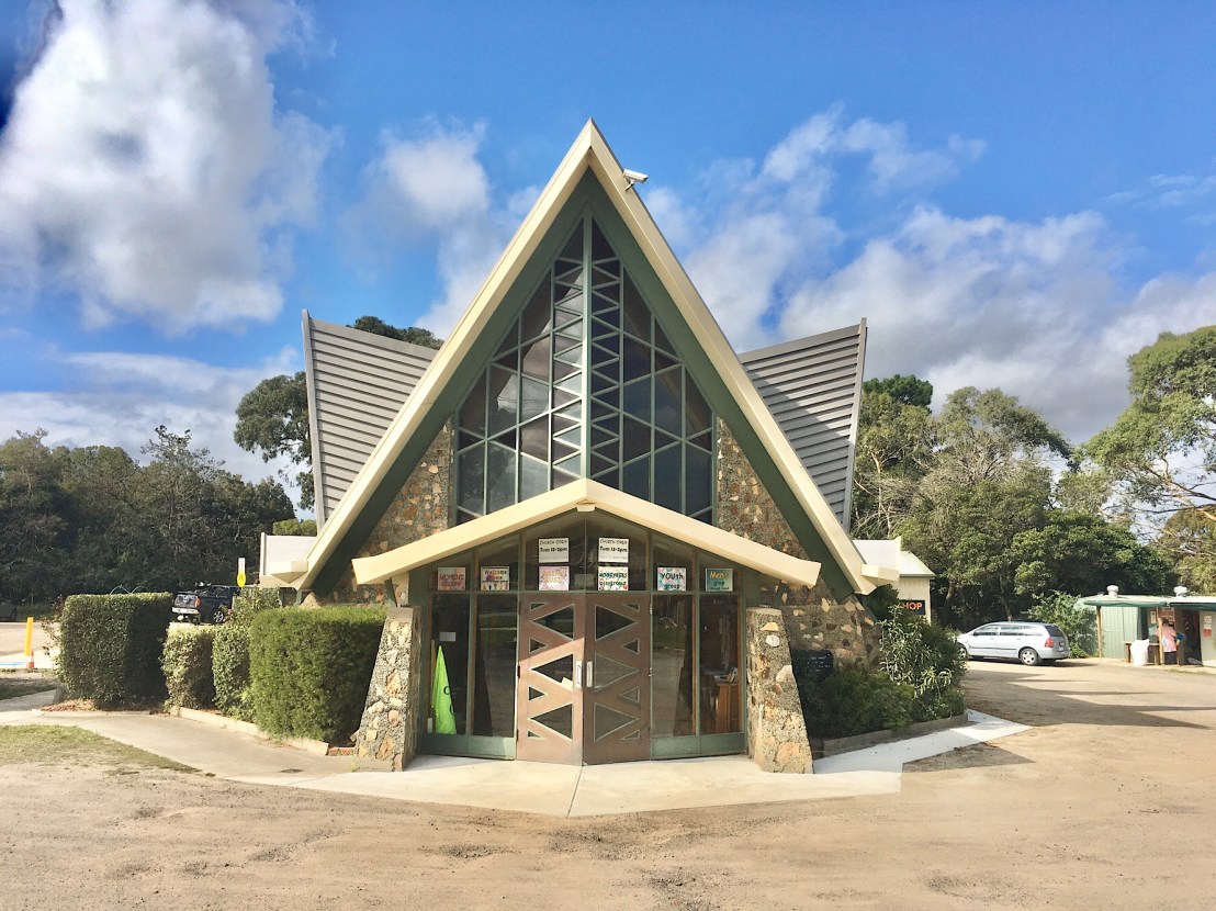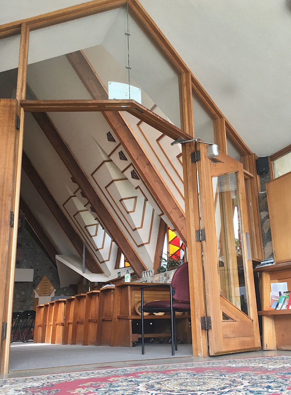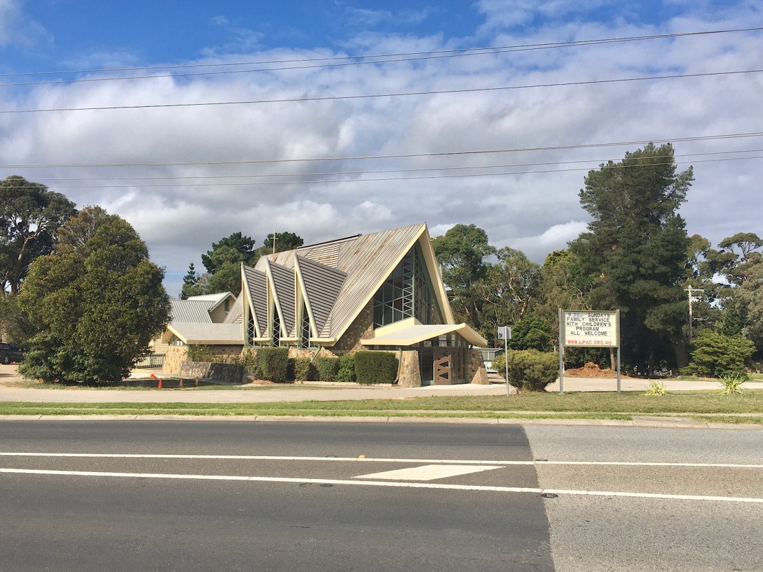 Another one that doesn’t disappoint! The #Langwarrin-Pearcedale Anglican Church, built in 1963, and designed by #WystanWiddows and David Caldwell. So pointy, angular, an A Frame, but souped up ! Even the door and the windows continue the angular theme. It’s not big but dominates this dusty intersection, set at 45*. You gotta wonder at how adventurous the congregation must have been, they said, ‘let’s go for it!’. Widdow’s churches are clearly influenced by #OrganicArchitecture, namely Frank Lloyd Wright, that stonework is straight from #TaliesenWest, especially his 1951 Unitarian Meeting House in Wisconsin, but this is a great interpretation.