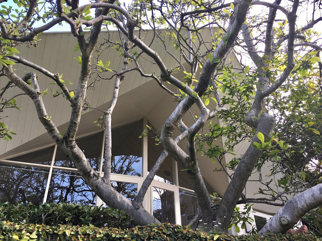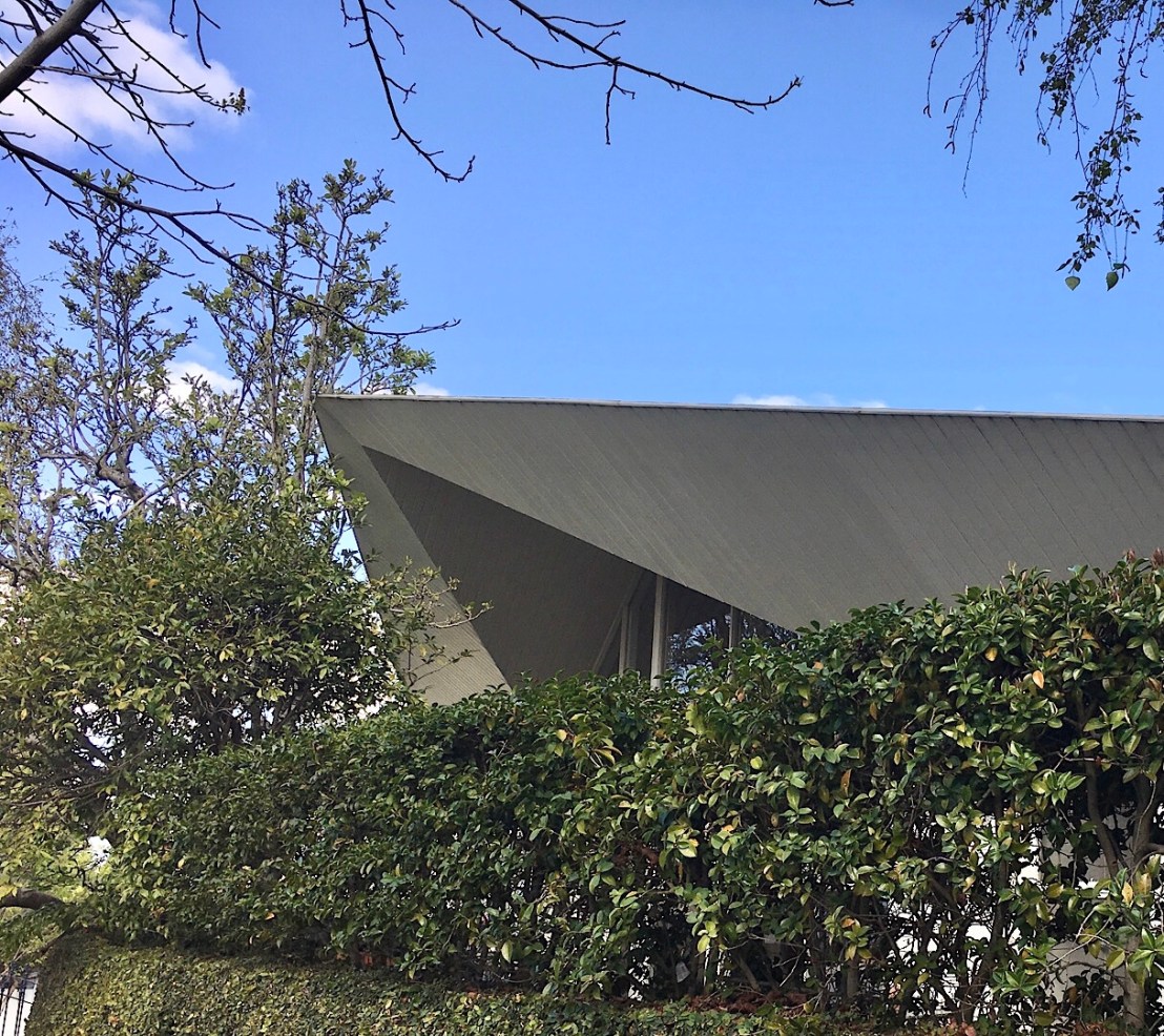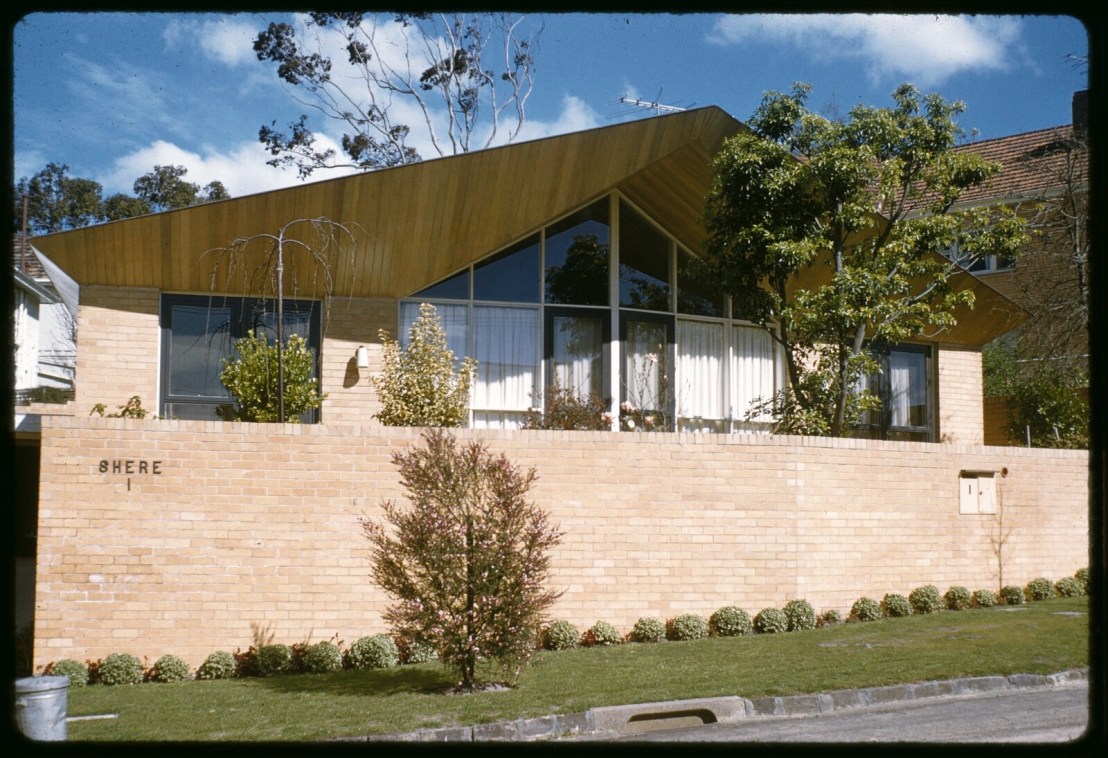 I posted this in 2019 as ‘a lesser known #RobinBoyd’ at 1 #TheodoreCourt #Toorak, 1958. But a recent heritage review by @extentheritage states it was called Shere, and it’s by Roy Grounds, though they don’t say how they know – but they did find the sketch design at @rmitdesignarchives ! The first photo is c1958 from @library_vic., because trees. You can see it’s intact but the bricks rendered, ivy on the garden wall, and the timber painted. It’s a bit crazy, with that pointy prow, but it does a good job of #sunshading. It was sold late last year, the inside is even better and more intact ! The angular shapes in timber continue inside, opening up and out to that big window. It’s a small house really for a small plot, and he’s stuck to his wedge shaped geometries to the point that entry to the main bed is through the ensuite, but never mind. And that fireplace- it’s the NGV entrance, which Grounds designed a few years later! The kitchen is/was partly intact too, and curiously large. It already had interim heritage listing, which it seems the previous owners didn’t oppose, and the permanent one is just waiting on the Minister to approve. But it doesn’t include the interior, even though in this case exterior and interior are designed as one.