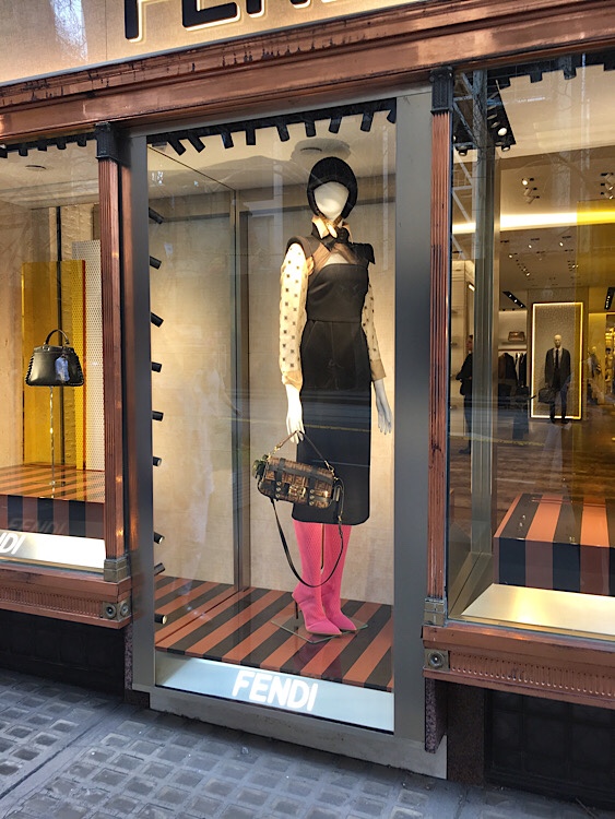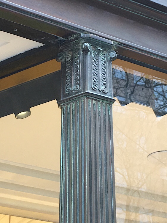 The 1929 #AthenaeumClub building has some of those elegant #shopwindows only found in the #ParisEnd of #CollinsStreet; designed by #CedricBallantyne in that 1920s stylised vaguely ArtDeco classical, in copper, though oddly one is polished, the other isn’t. Fendi has taken over two shopfronts, and has a neat solution for extra display by infilling the second door.