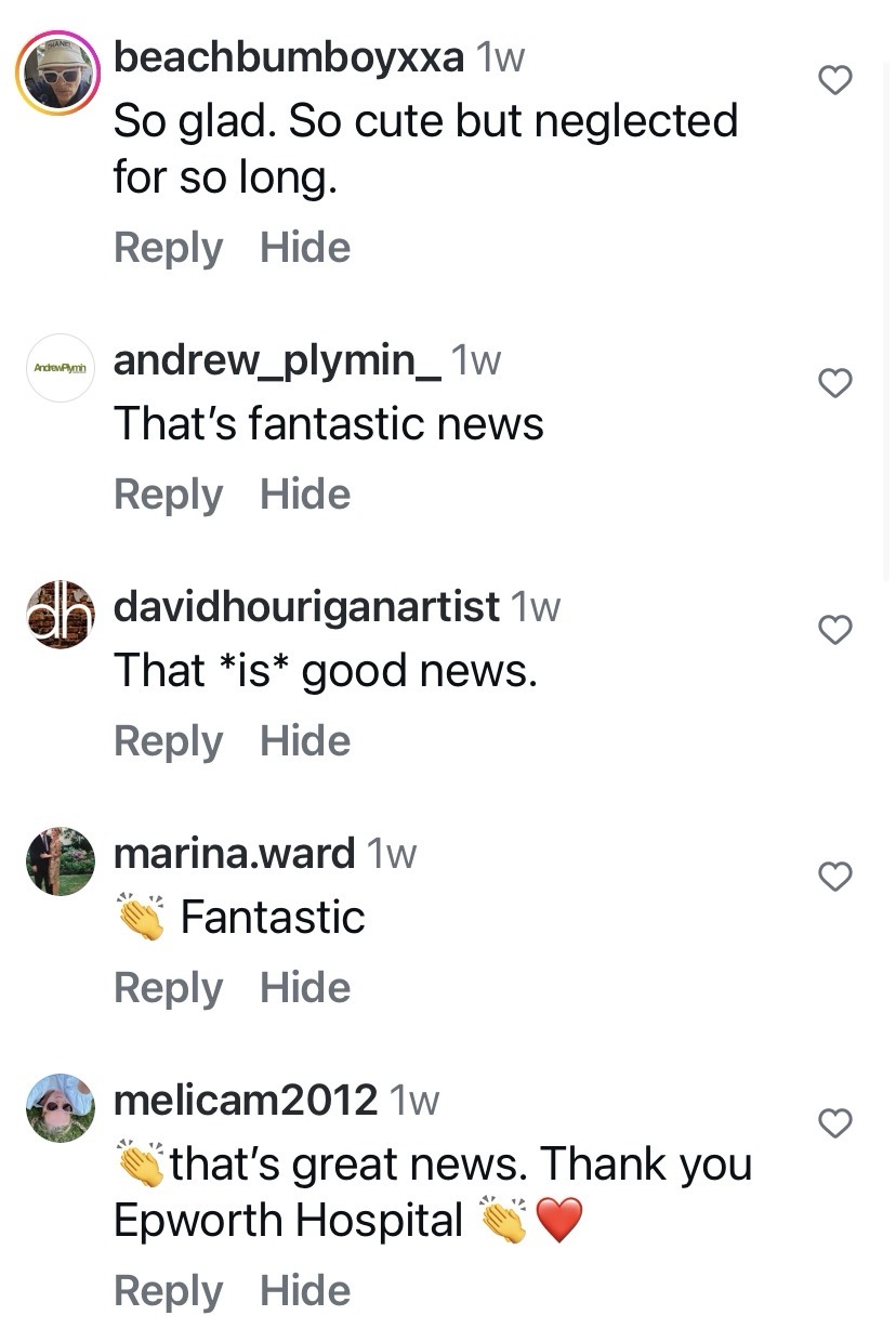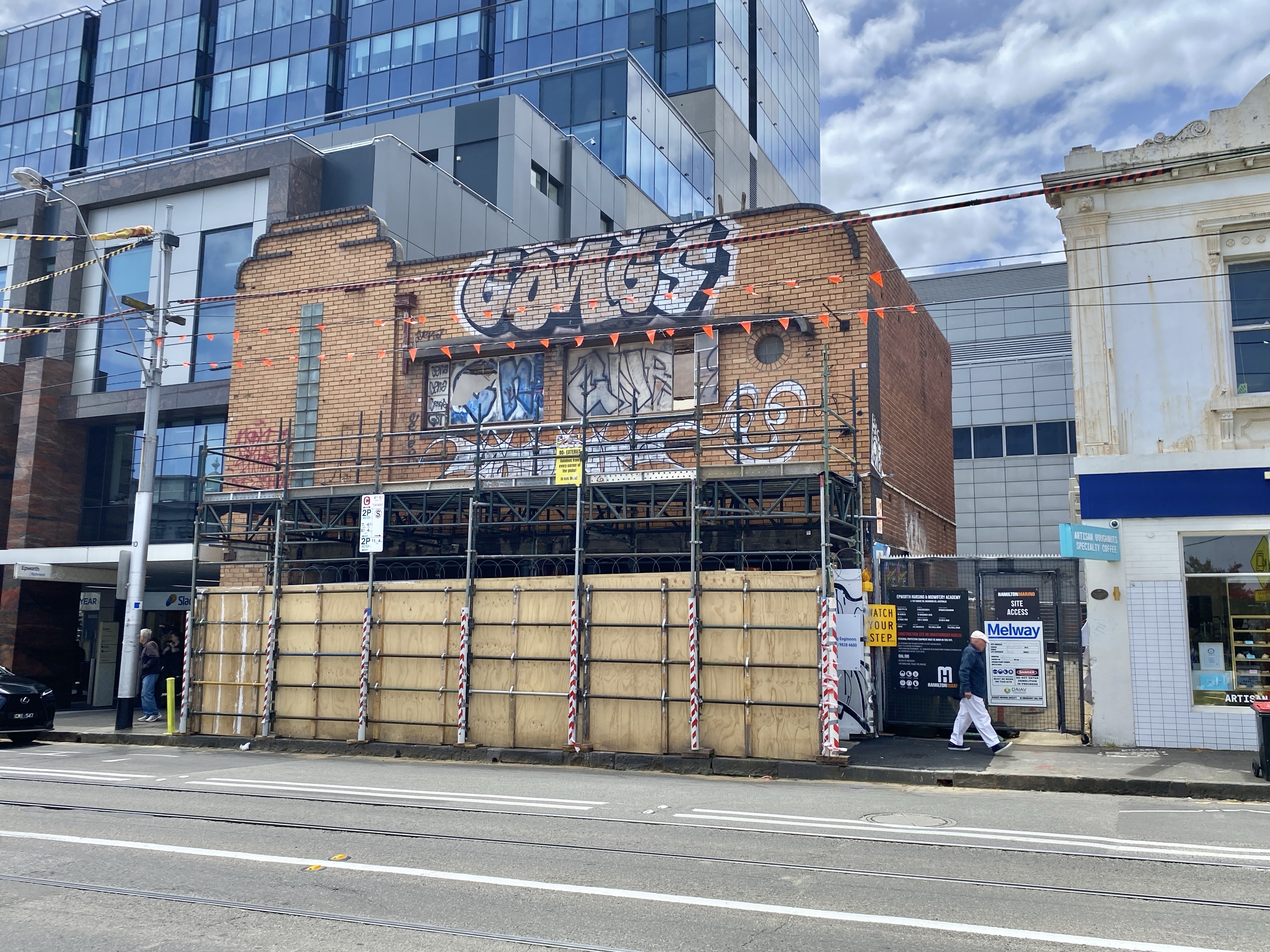 Pleased to discover this cute little Deco facade on Bridge Road next to the Epworth is going to get restored as part of a new home for the hospitals nursing and midwifery school, the Brooke’s Academy. The Epworth bought it in 2022, but its sported that big graffiti since 2019. For a long time I thought the left half had been demolished, but no, seems it was always like this; and it was built in 1941 for Grynberg Drapers, with two flats upstairs, each accessed from inside each of the two shops.