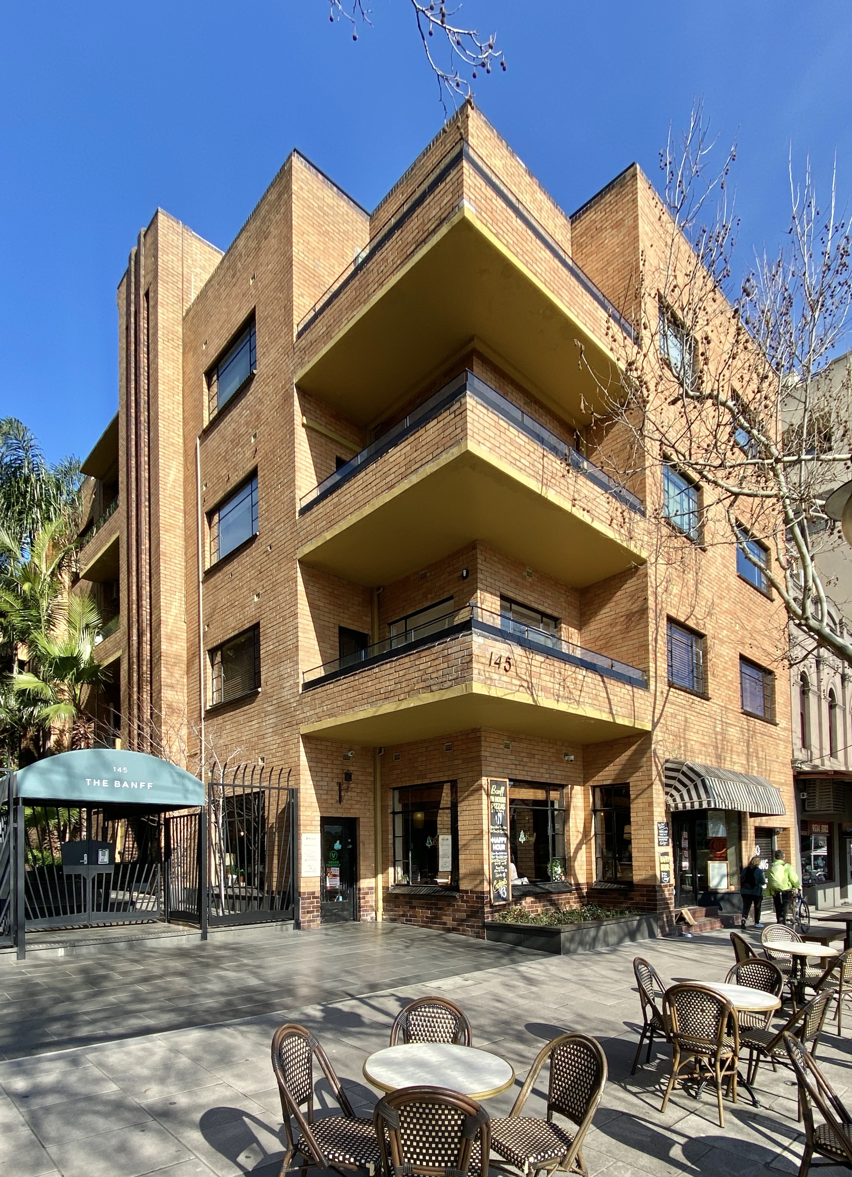 The flats called #Banff in #FitzroyStreetStKilda, very interesting #creambrick, almost #Bauhaus lines (side wall more decorative). Built 1940, architects S & MC Nelson, who I’ve never heard of. It was all painted off white for maybe decades, but the smart body corporate stripped it all off about 15 years ago and it still looks great. More recently they’ve added the glass balustrades, new standards I suppose. The front flats very spacious, great views, the ones behind, not so much, but access via the lush garden is nice. And in a real innovation for 1940 it includes built in car parking ! Only pre WW2 example I know of. And it’s always had a Cafe as well. Photos 22 August 2019.