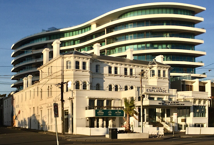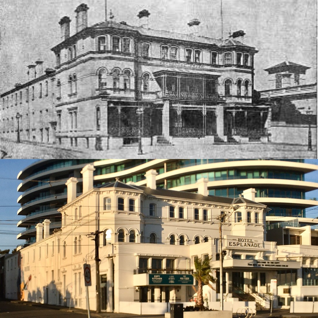 Pretty good match up I think ! #EsplanadeHotelStKilda, as it was from 1878-1920, and now. It was built initially to be three grand terraces, but before it was completed had become an hotel, the Esplanade. It replaced a hotel, so why the terrace idea I don’t know; maybe the market for leasing giant terraces judy wasn’t there. The architects were #SmithAndJohnson. It became the premier hotel in St Kilda, though by 1886 the additions to The George made it bigger and grander. The alterations in 1920 were by #GibbsAndFinlay, and it pretty much hasn’t changed since then, except the unfortunate loss of rear wings for the #FenderKatsalidis apartments. I guess by 1 June I won’t be able to take a photo without people in it.