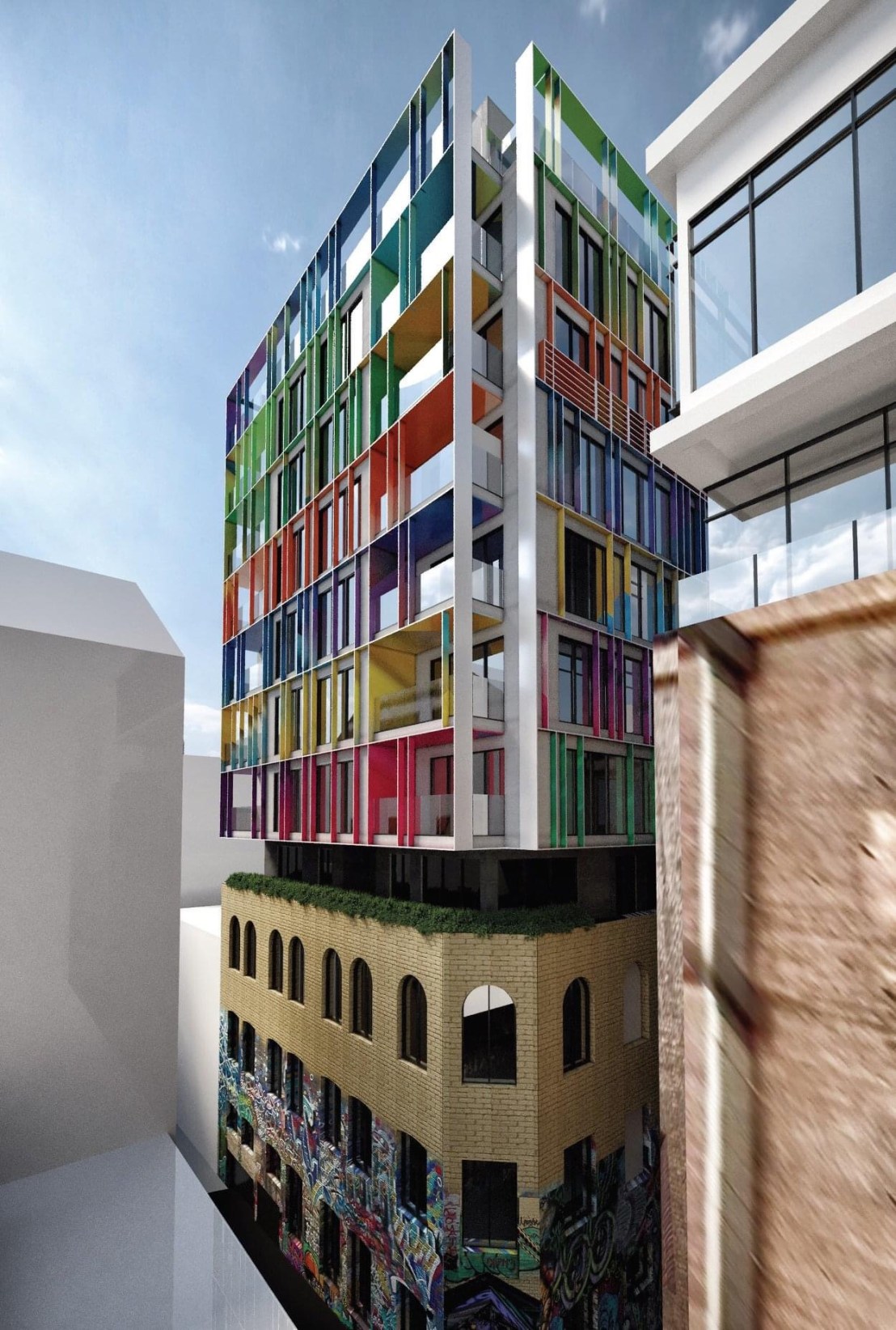 ‘The proposal references the colourful graffiti art of #HosierLane, and adds to the vibrancy’ @bharchitects ….😂☹️ #gentrification at work. After @melbourne_heritage_action complained last year they’ve come back with ….a 0.5m setback, which of course makes no difference whatsoever. And I’m all for colour, but this is just childish. Preferably don’t do anything at all, or if you are going to gut an old warehouse for a bunch of small apartments, at least set it back enough you won’t see it in the long views, which would only be another 1m I reckon. And maybe try white or grey.