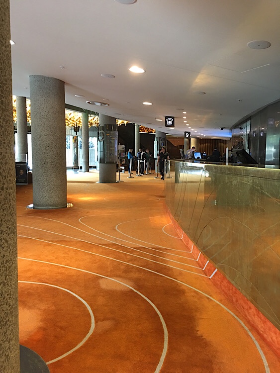 The interior of #HamerHall is an odd combo of late 70s #SirRoyGrounds #brutalist #bushhammeredconcrete, with 1980 #JohnTruscott glam #goldleaf, #smokedglass, and leather walls, with a 2012 overlay by @armarchitecture of orange carpet, brass and angled escalators- and it works !