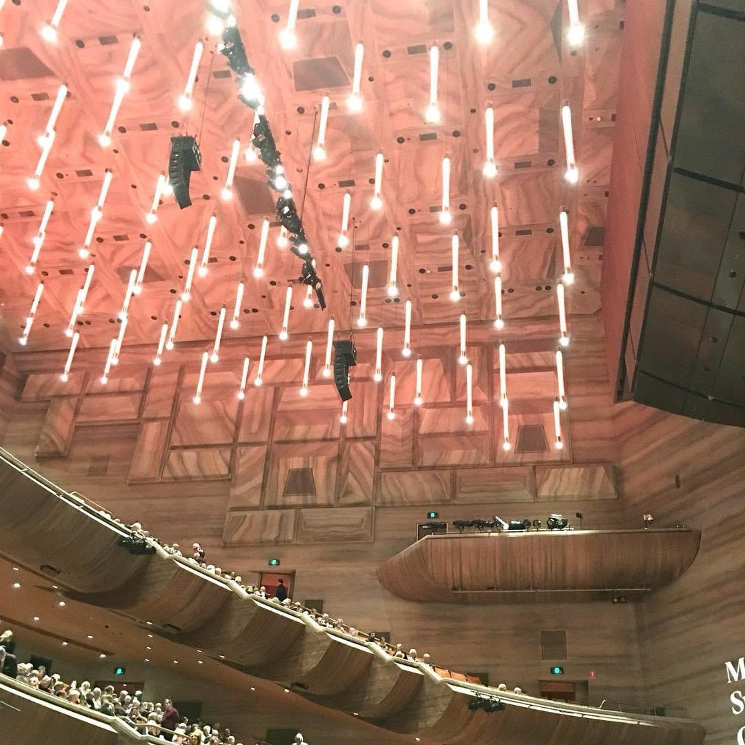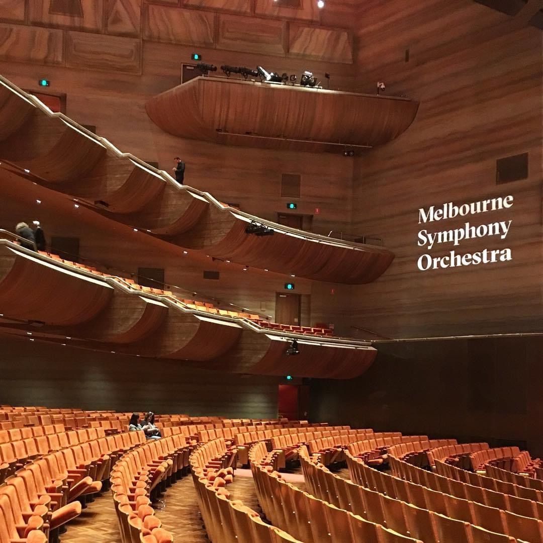 I was told that originally the budget for the #HamerHall refurb in 2011 didn’t stretch to repainting the #JohnTruscott mineral layers effect on the required acoustic layer that was going to be added to the walls, but in retrospect they wouldn’t have just left it white, would they ? Love the orange seats and the #stalactite lights too. Full orchestra and big choir for #VerdisRequiem (thanks Grant). @ Hamer Hall Arts Centre Melbourne