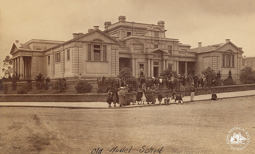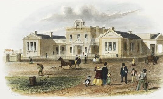 If you go round the back of the College of Surgeons in Spring Street, and look into the sunken courtyard, you’ll see these random bits of #columns, which were discovered when they were digging it out in 2004 for new wings – they’re all that’s left of the the ‘model school’ that was built there in 1854, designed by #FMWhite. It was rather a complex design, and was either built more elaborately than the drawing, or was soon added to, as seen in the photo from the 1860s. It had porticos on both sides providing separate entrances for boys and girls (and they look like the source of the fragments) while the front part housed the government school administration, and teacher training. It was a state supported school meant to be a ‘model’ for others. After 1905 it became a state high school, one of the first, with the boys moving out to Melb Boys High in 1927, leaving the girls in a deteriorating building, condemned in 1930, when they went to government house, then to Macrob in 1934. The school was demolished in 1933, and somehow the College of Surgeons got this prime site (at least they havnt tried to sell it off !)..