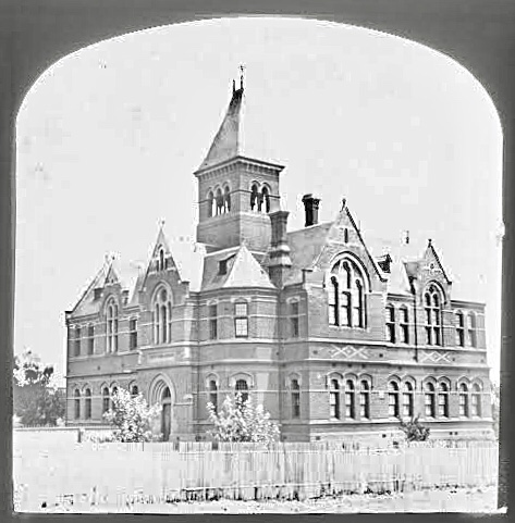 #StKildaParkPrimarySchool, possibly the most compactly vertical of the many late 19thC #primaryschools built in Victoria after the ‘free and compulsory’ 1872 Education Act. All the schools were #GothicRevival, mostly in #polychromebrick, getting more elaborate into the 1880s, by which time they’re all said to be designed by #HenryBastow, chief architect of the education department (though many might be by others in the department, and they all combine various elements of the many designs that won a big competition in 1872). The huge first floor #gothicwindow is the dominating feature here, though originally the tower was more prominent, it’s roof is now lower, and there’s trees and the bowls club in the way. Great to see all the Gothic #pointedarch windows are intact – many were replaced with larger square widows around WW1 – these ones just had the sills lowered.
