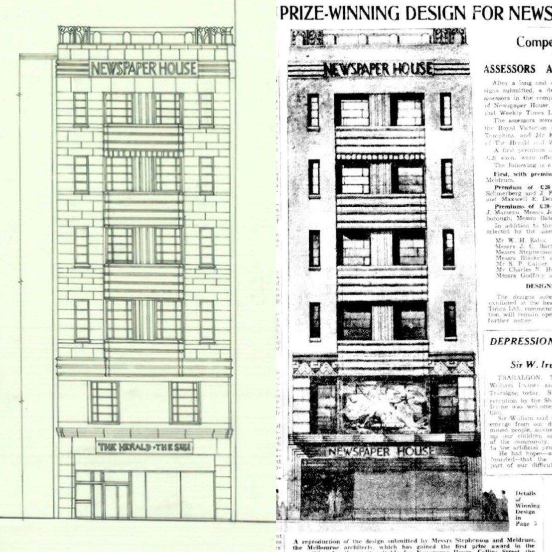 The prize winning design of #NewspaperHouse by #StephensonAndMeldrum vs what was built; all the same except the first two levels, notably the mosaic by #NapierWaller expanded from just a central panel to one that ran right across, and the shopfront is simpler, without the frame. Overall it’s a cautious move towards Art Deco, with a traditional base middle and top, and I guess stylised forms, but without the fluidity of later Deco, or the zippy ornament of early Deco. Interestingly the sign at the top isn’t just incised stone, it’s mainly #neon.