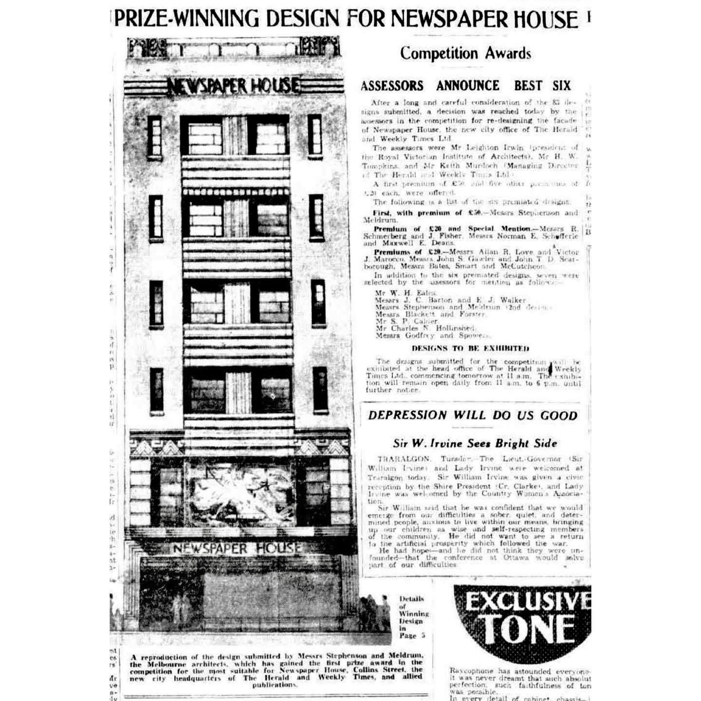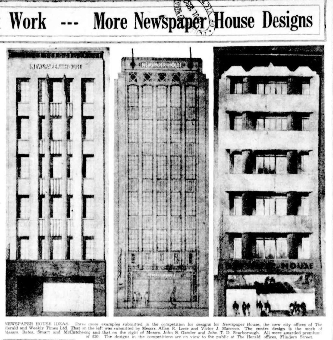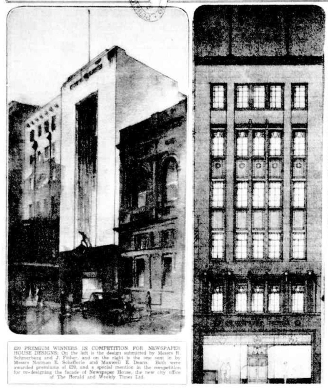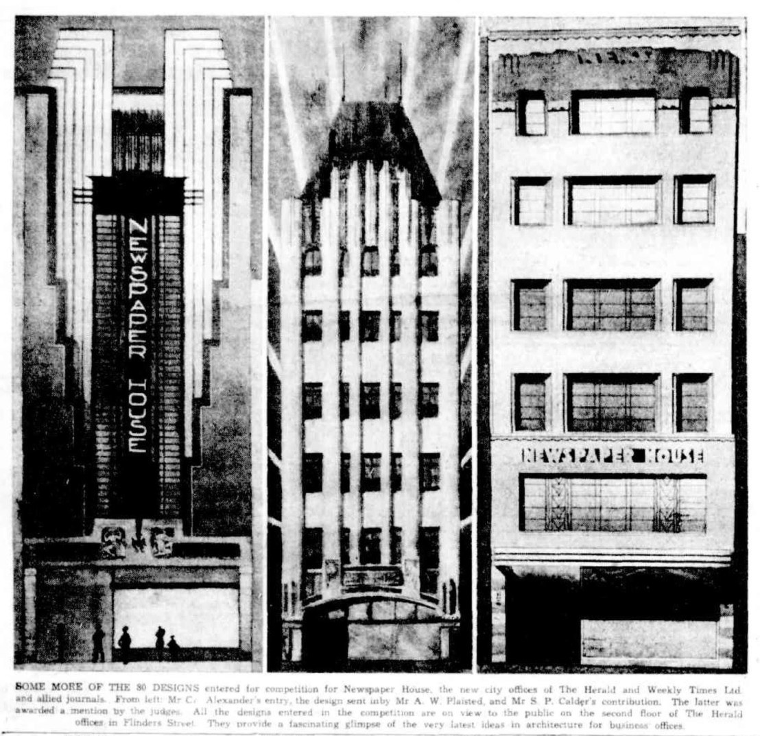 This is #NewspaperHouse, built in 1932-33 for the Herald as their city office as it is, and as it might have been; there was a competition, with 8 entries published, mostly quite conservative but all Art Deco more or less, showing how it had taken hold after first emerging in 1929-30. There were some big names and some unknown ones. The winner was #StephensonAndMeldrum, with a blocky stolid design, the best bit being the Napier Waller mosaic; they soon went on to do a lot of streamlined hospitals. The fabbo zippy zigzaggy confection is by C Alexander (who was he ?), next to that is #ArthurPlaisted (gothicy!), and next to that #StuartCalder (boring); next page Love & Marocco (boring) #BatesSmartMcCutcheon (deco Gothic), then John Gawler with John Scarborough (interesting). Equal second went to Schmerberg & Fisher (very stylish, but who were they?) and #NormanSchefferle & Maxwell Dean (looks like simplified Tudor ?). So much talent. 1st pic 2024.