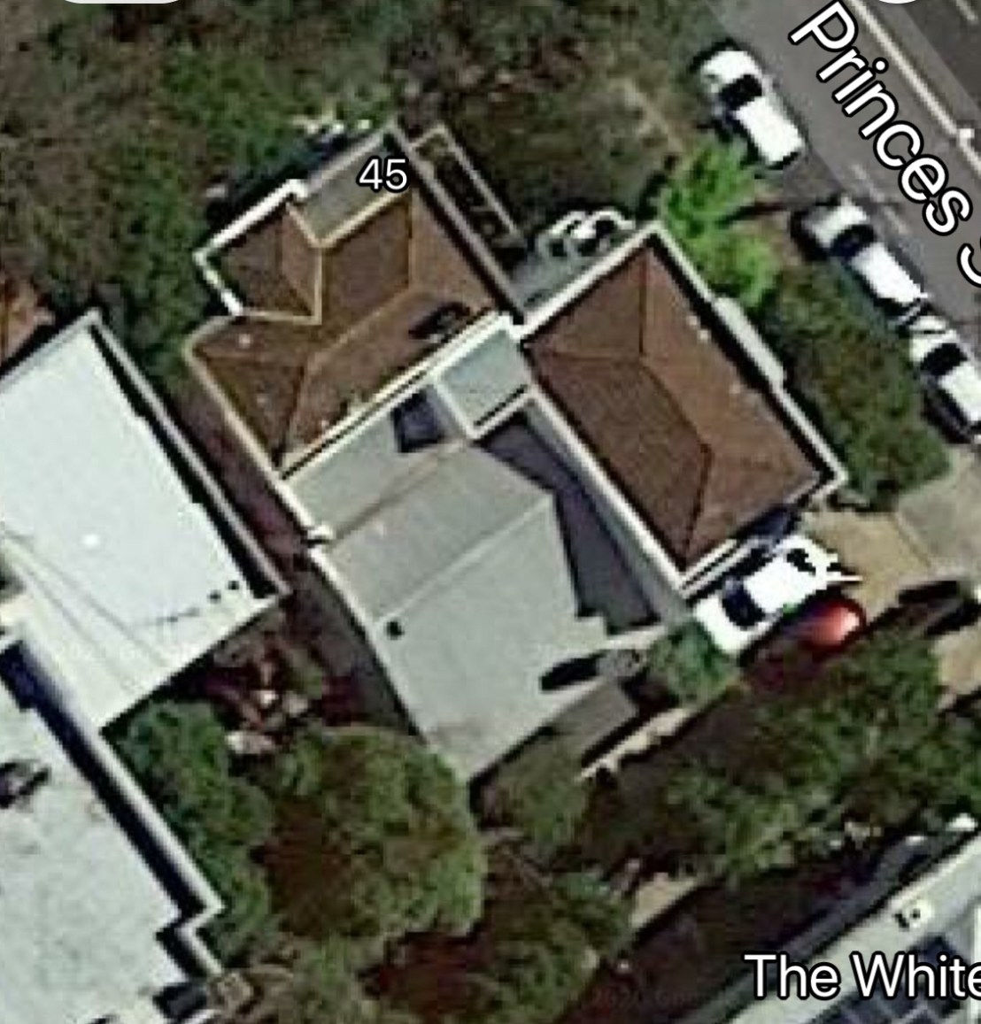 New photos 2025 – one tree removed from the side, other trees now bigger. The fence is good too – the lower part is original and unpainted, the ironwork is 1990s and in style.