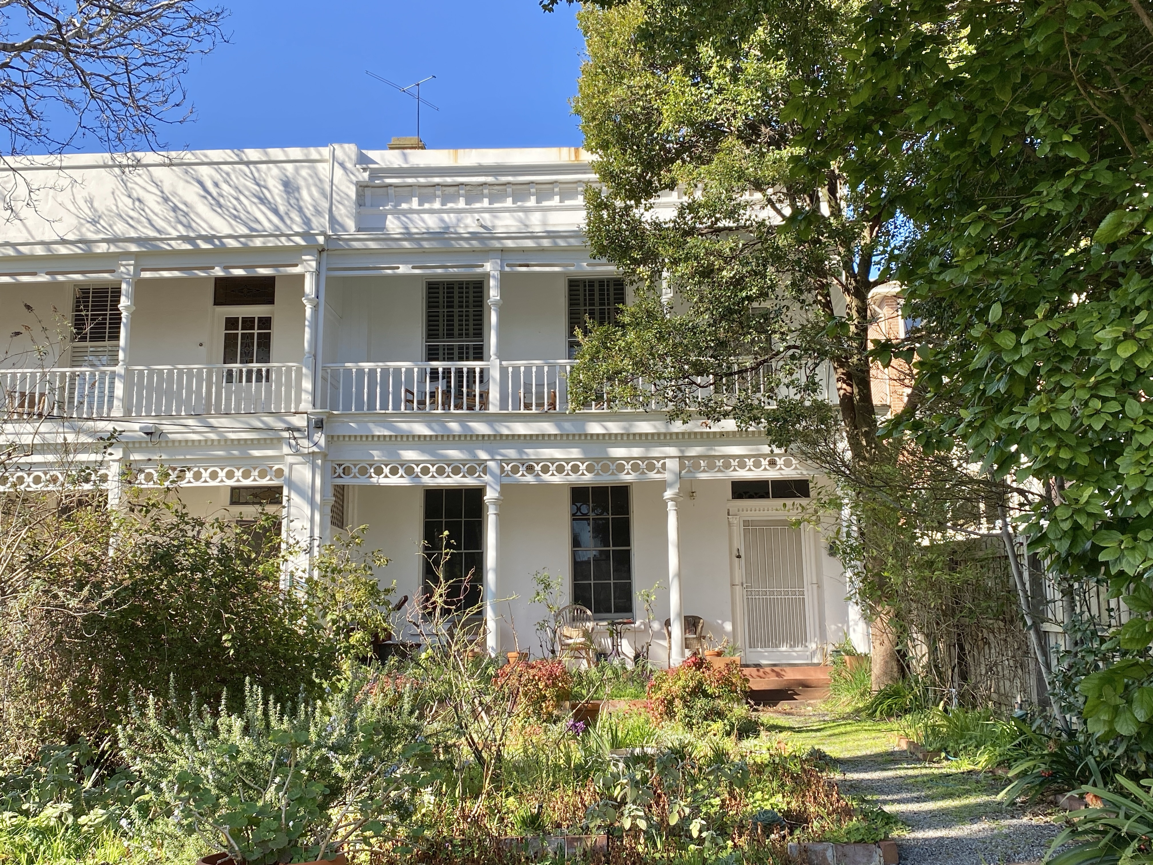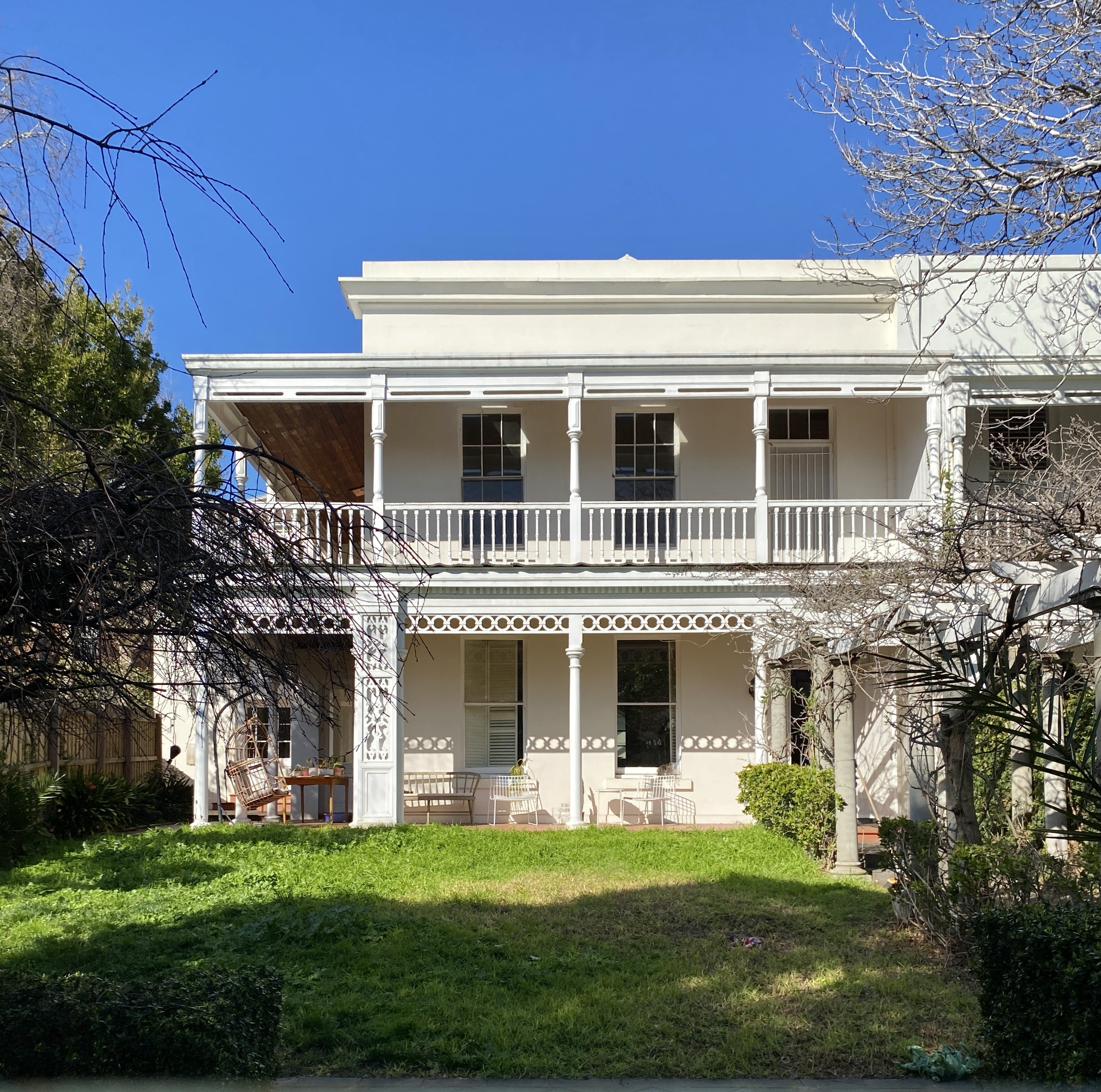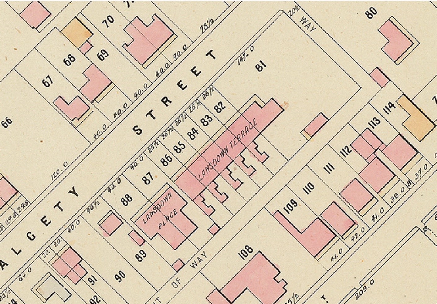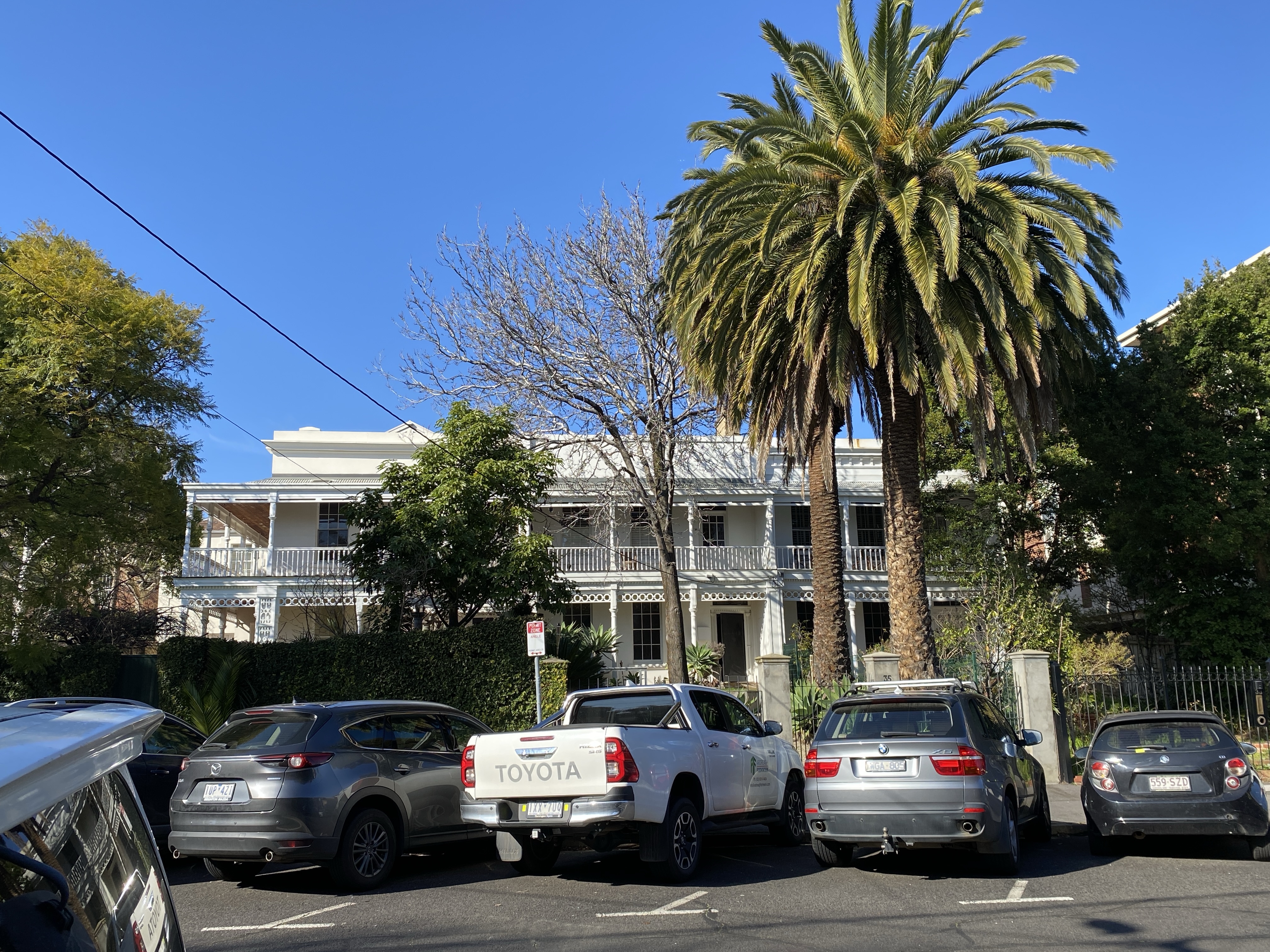 There’s these grand terraces across the road from my place in Dalgety Street St Kilda, with huge front gardens, and I’m a bit surprised to learn they’re 1858 ! Called Lansdowne Terrace, they still have their original very simple elegant timber verandahs. There were 6, but three were demolished c1970 for some boring flats ☹️. The northern end one, no 35, was much bigger, more like a mansion, with a return verandah and 15 rooms, including a dining room big enough for 50 (!), and folding doors between the drawing room and breakfast room to create a ballroom. It was on a block the size of the other 5 put together, complete with a coach house at the rear (still there), green house and dairy. Early tenants of the terrace included successful traders and solicitors. The big gardens of no 35 were subdivided in c1917, leaving the coach house accessed from the lane. The 1998 St Kilda heritage study notes that no 35 was already renovated but the other two were in poor condition, with filled in verandahs, but they look fine now, and in fact the southern one is the most unaltered, namely the parapet looks more original than the other two. Found a real estate pic from 2010 of no 35 showing off great art and furniture, while across the street, there’s a block of low rent studio flats, and a boarding house, the extremes that you still find in St Kilda, though a lot more luxury homes and very few cheap ones now. Info from ‘St Kilda Movers Shakers and Money Makers’, plan is from 1873.