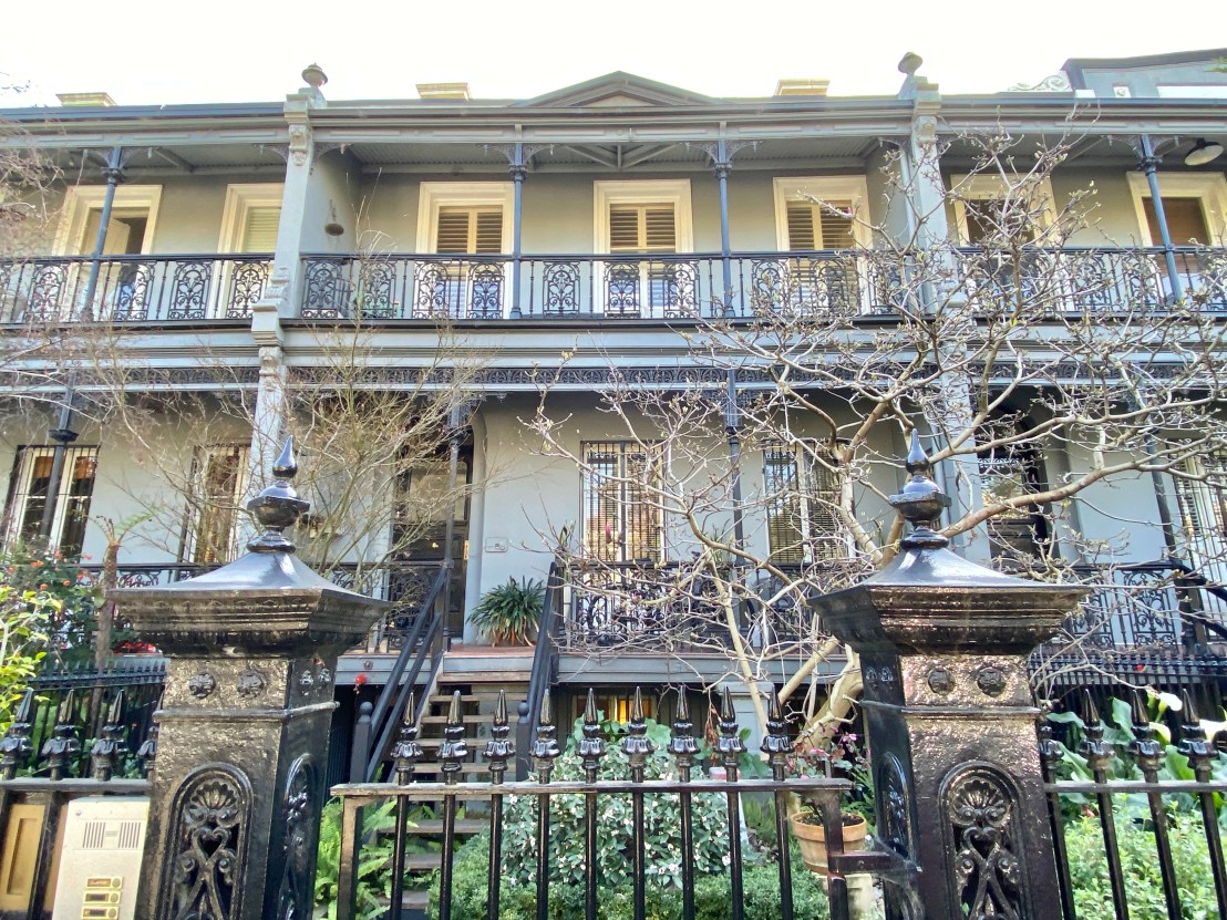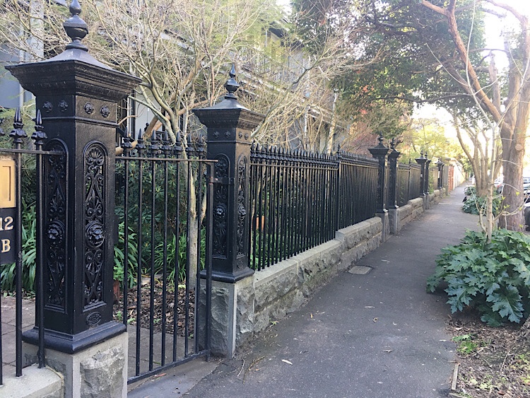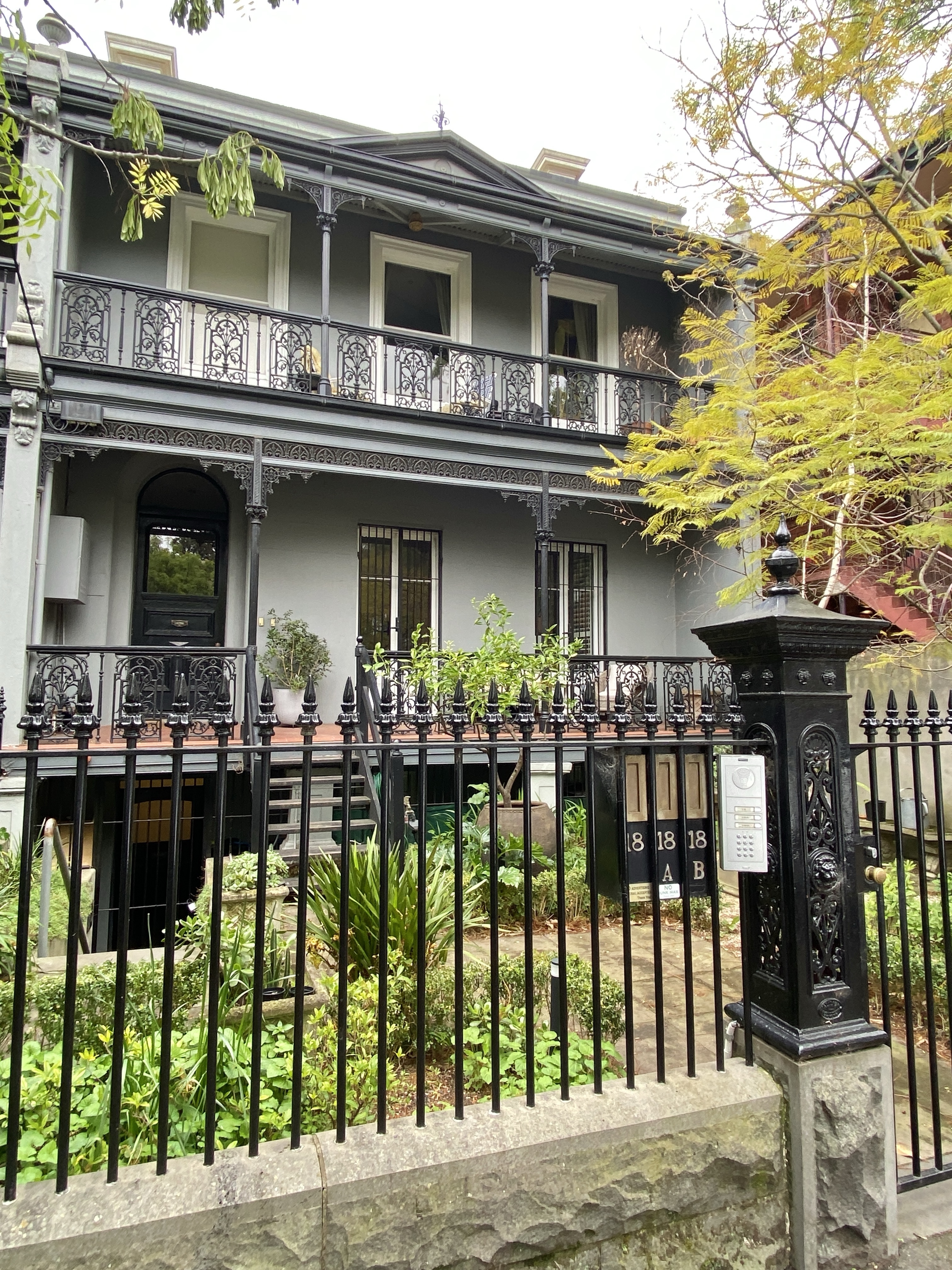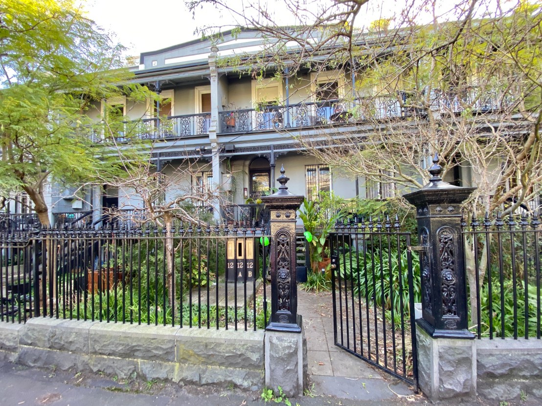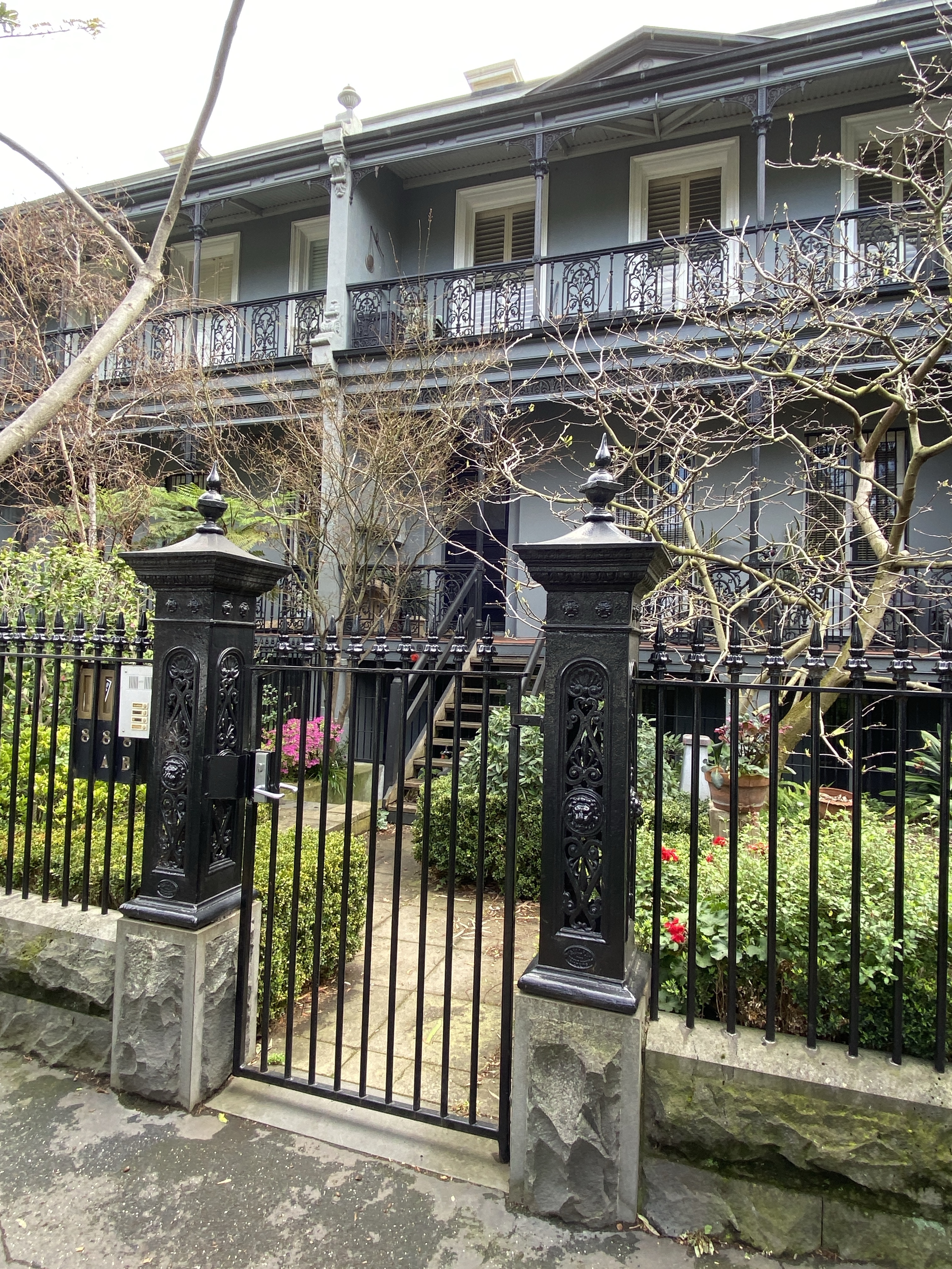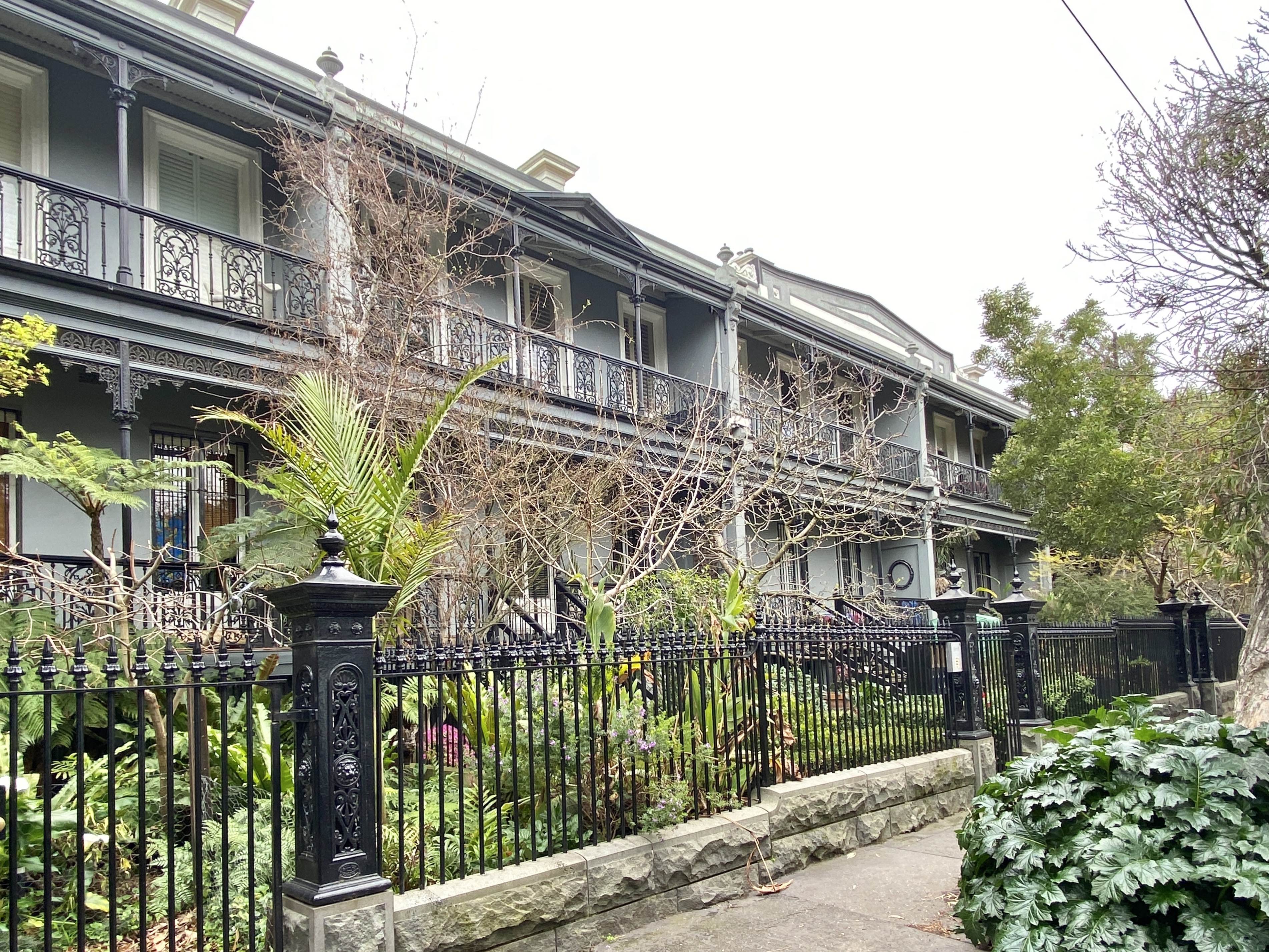 The wonderful #castironfence with fine bluestone plinth was created about 1990, I know cos I remember it happening ! (and the Heritage Victoria listing says ‘recently refurbished’ in 1991). In fact I heard it cost so much that some owners couldn’t afford their share and had to sell up. They did a very good job, it’s very much what they would have built in the 1880s, when the verandahs were added.