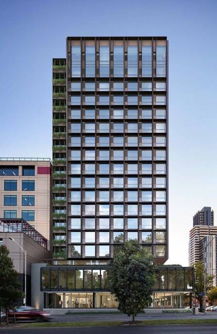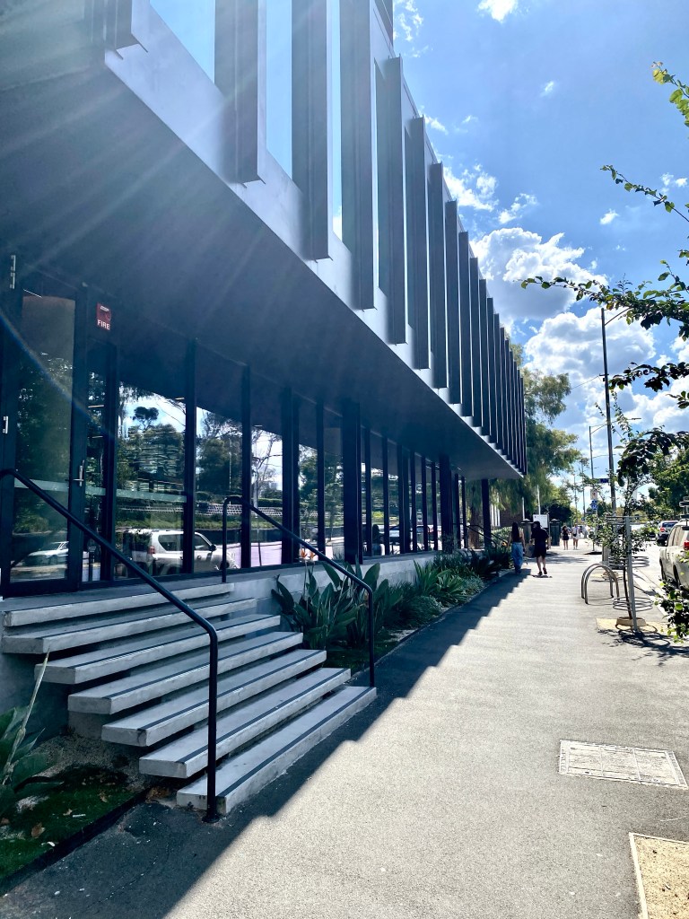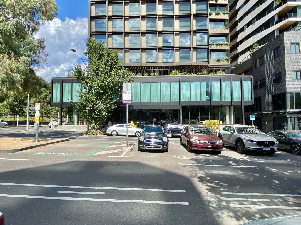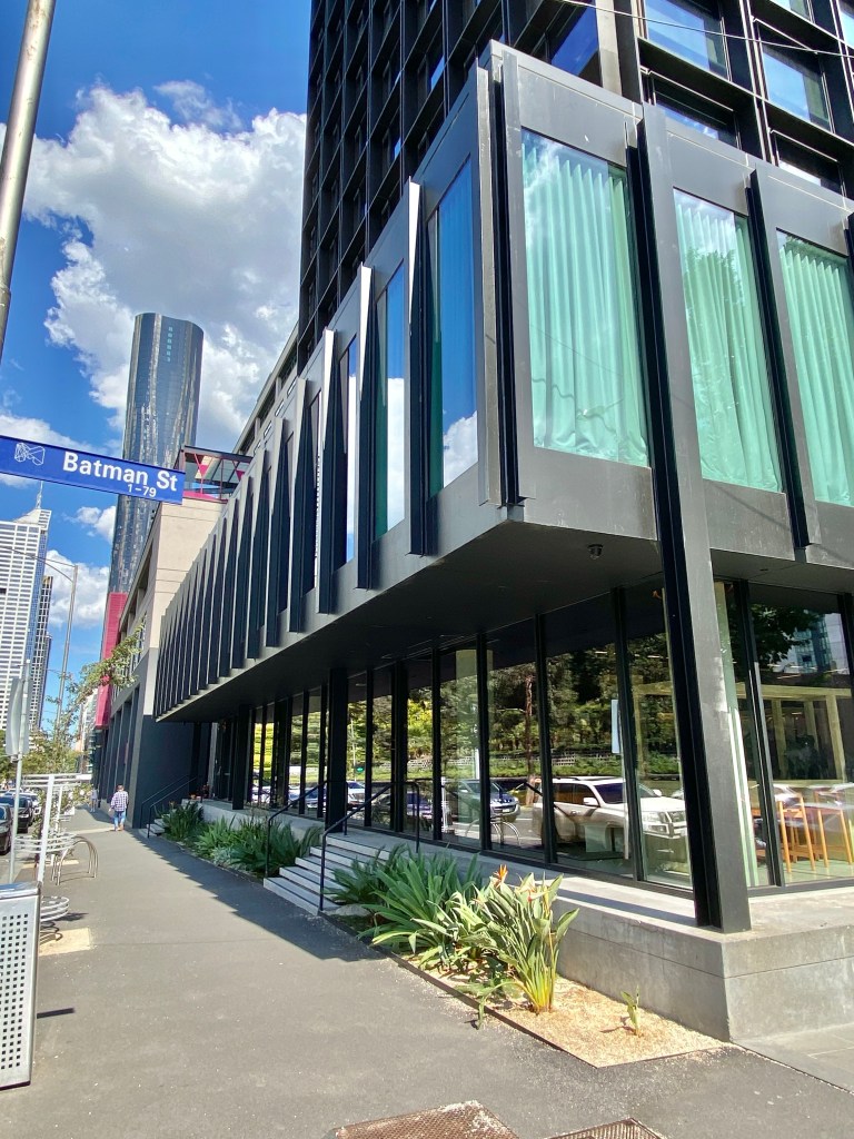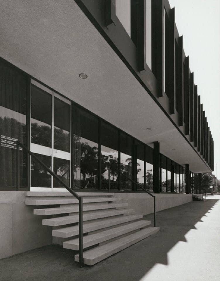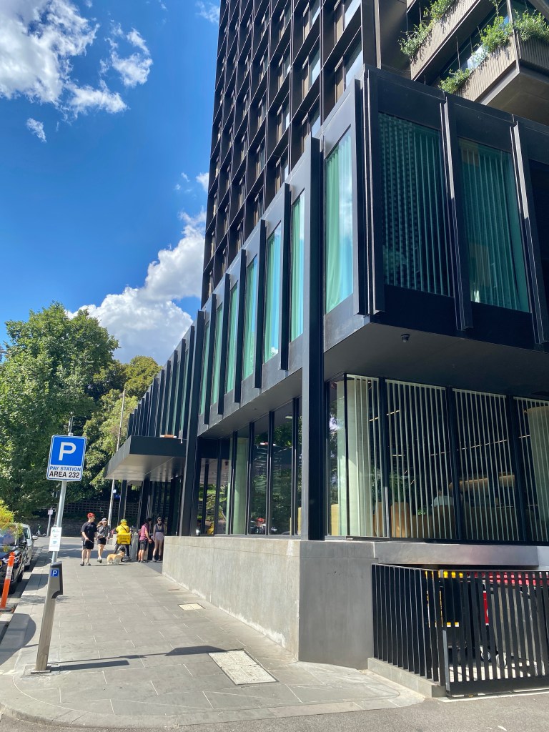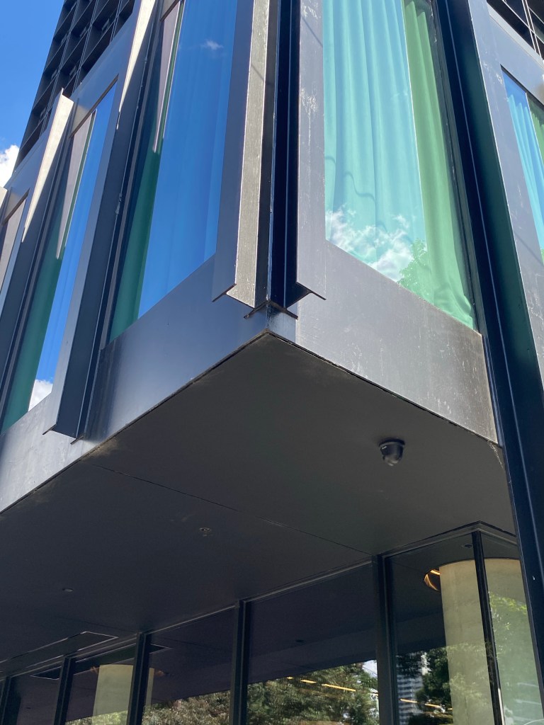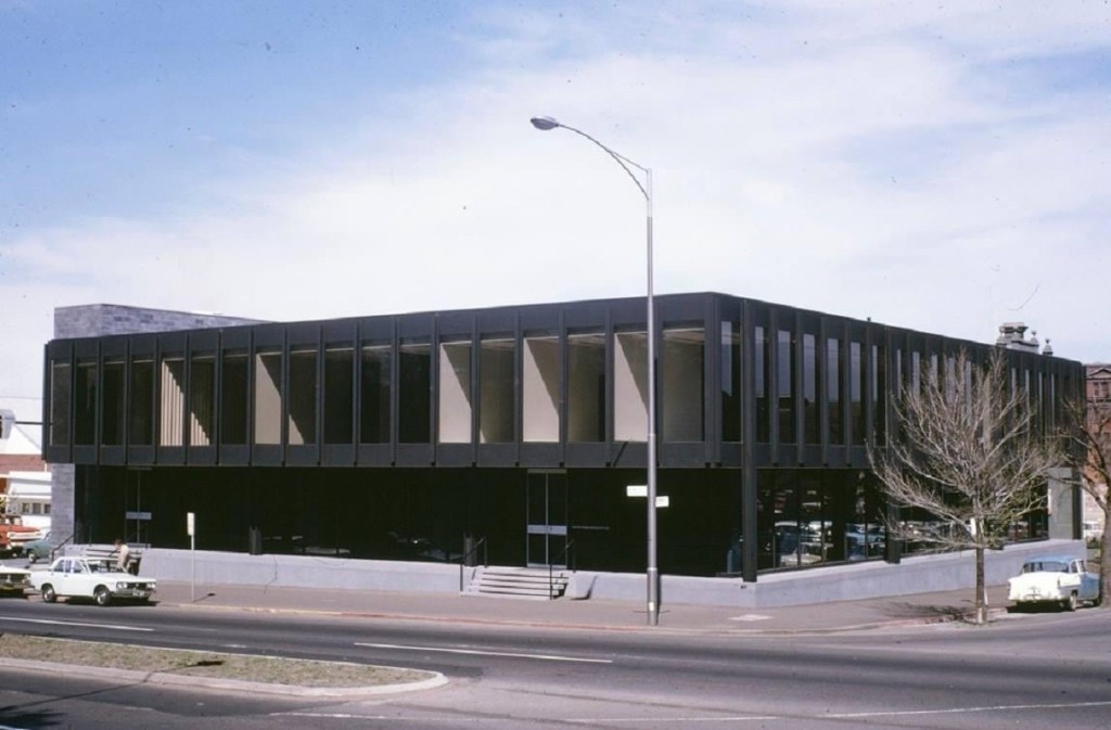 The first example in Melbourne of modernist facadism, with a hotel tower built on top, completed in 2022. Designed by Bates Smart it’s done in a similar style, perhaps confusing the two, but it’s well set back, making a satisfying whole, and from right in front it’s much the same (except the entry was moved). Pity they didn’t keep the nice cantilevered stair inside.
