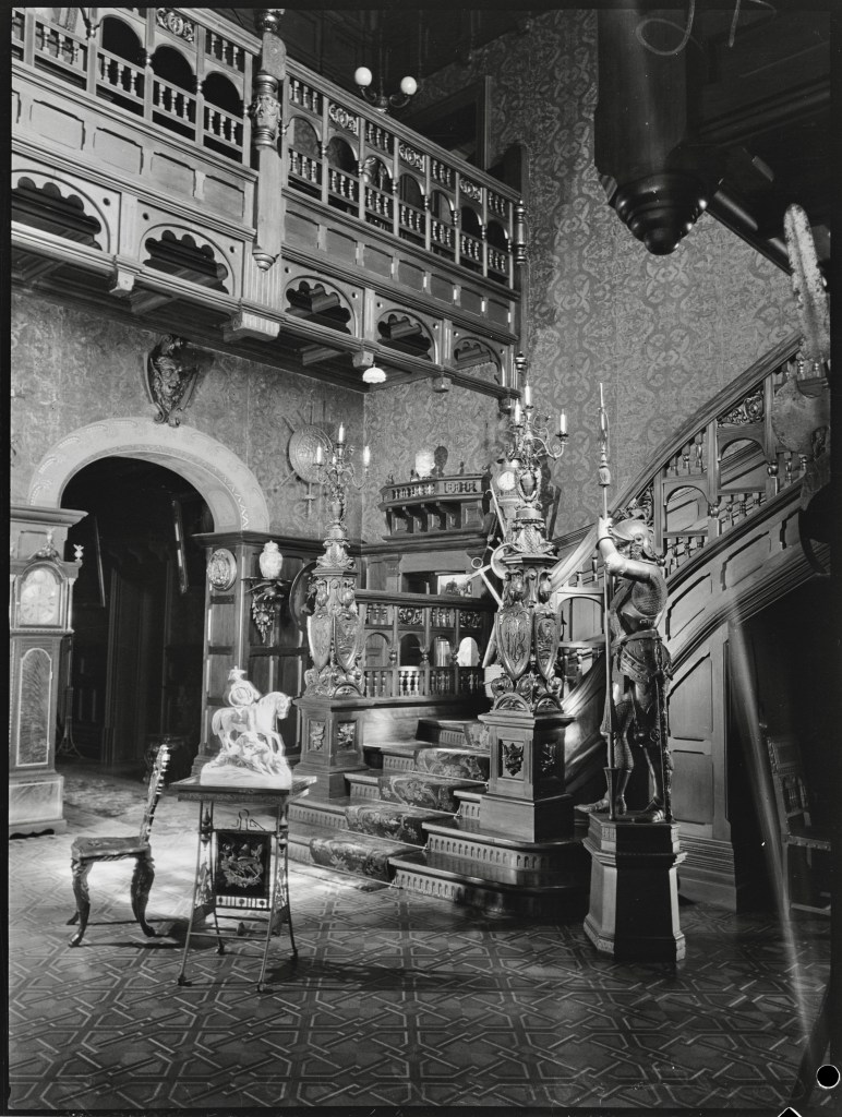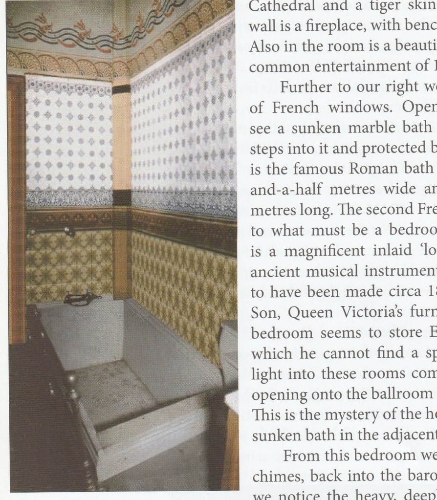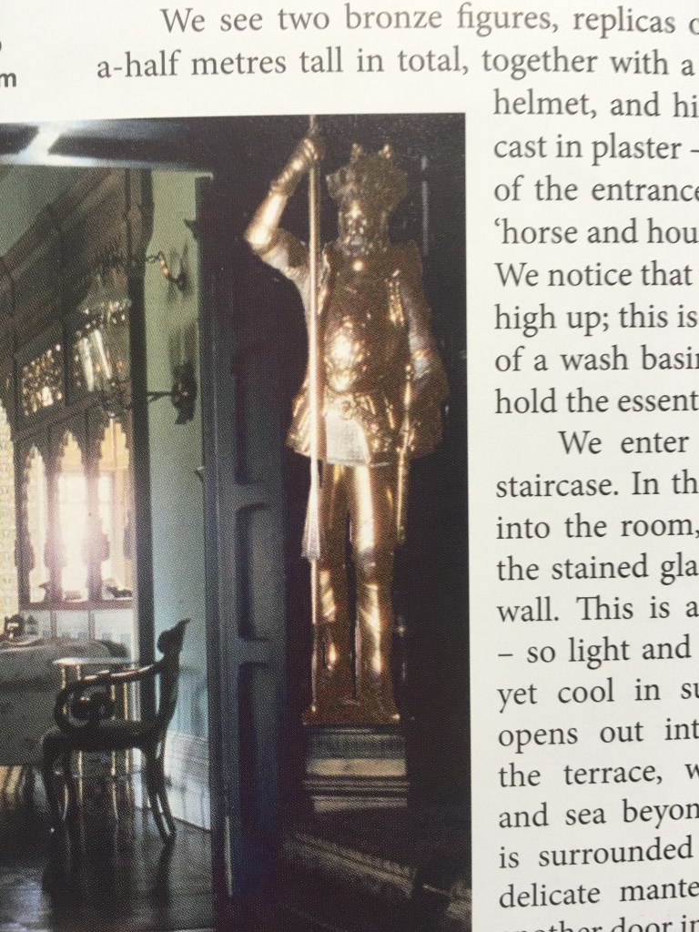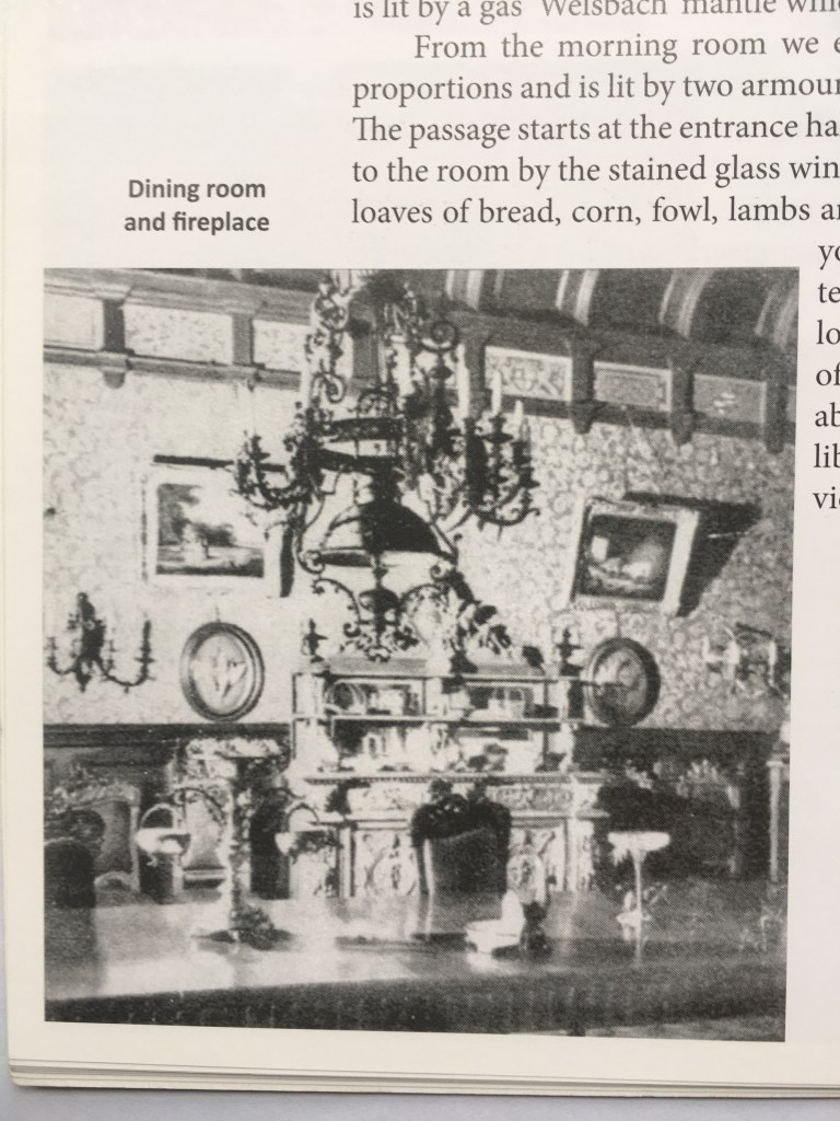 The interiors were much more elaborate than the exterior : the hall was very much in the very baronial style, complete with carved or bronze knights (main image is a photoshopped amalgam of more than one image). The conservatory was fully tiled, there were lots of #stainedglasswindows (some now at Trinity College), and a curious marble Roman bath, off a windowless bedroom downstairs. It must have been very dark, most of the main rooms have only or mainly stained glass windows, often in nooks.