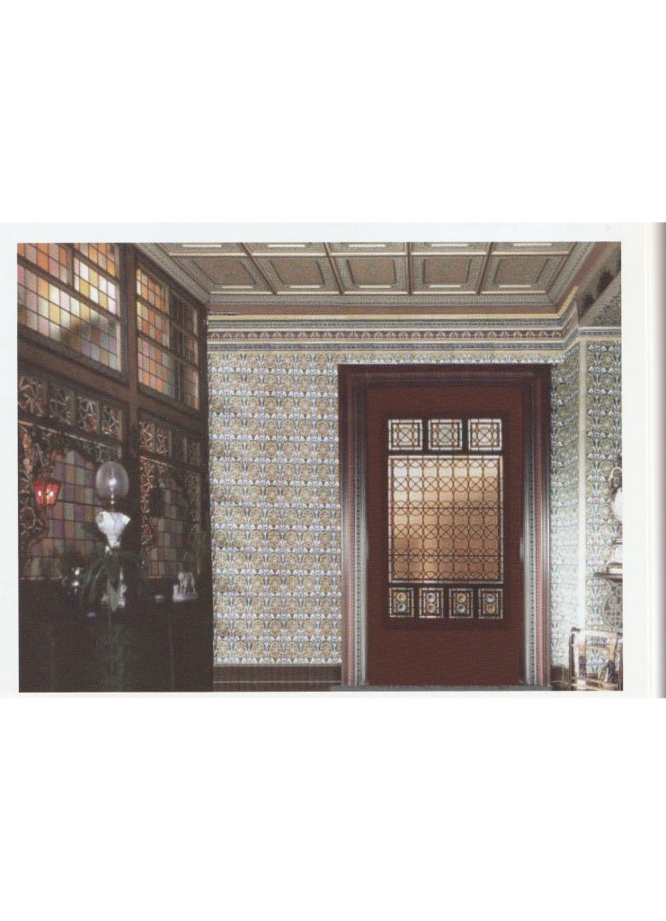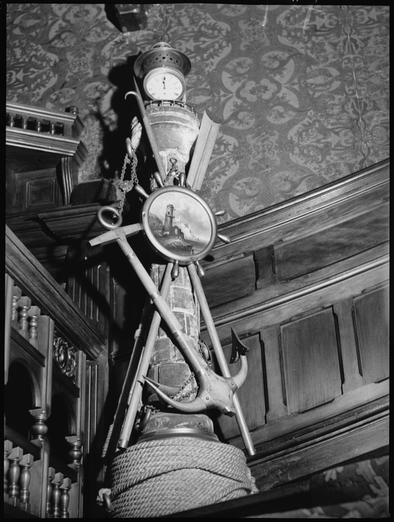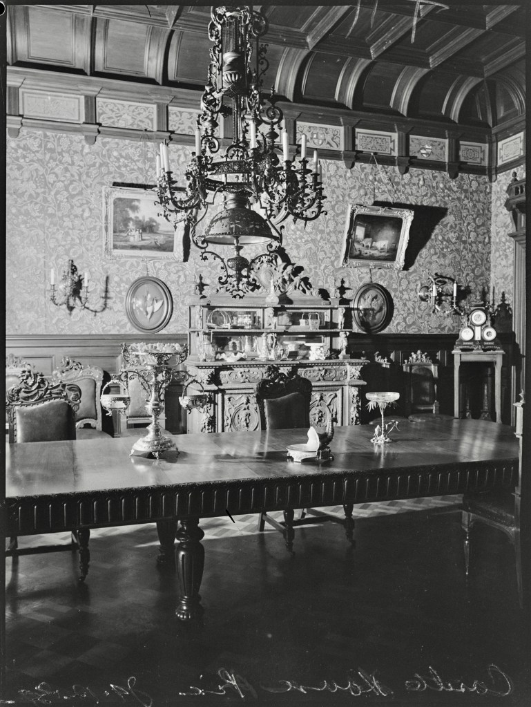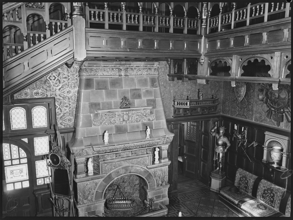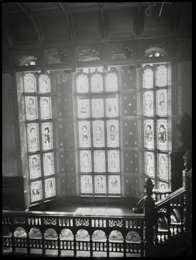 The interiors were much more elaborate than the exterior : the hall was very much in the very baronial style, complete with carved or bronze knights (main image is a photoshopped amalgam of more than one image). The conservatory was fully tiled, there were lots of #stainedglasswindows (some now at Trinity College), and a curious marble Roman bath, off a windowless bedroom downstairs. It must have been very dark, most of the main rooms have only or mainly stained glass windows, often in nooks.