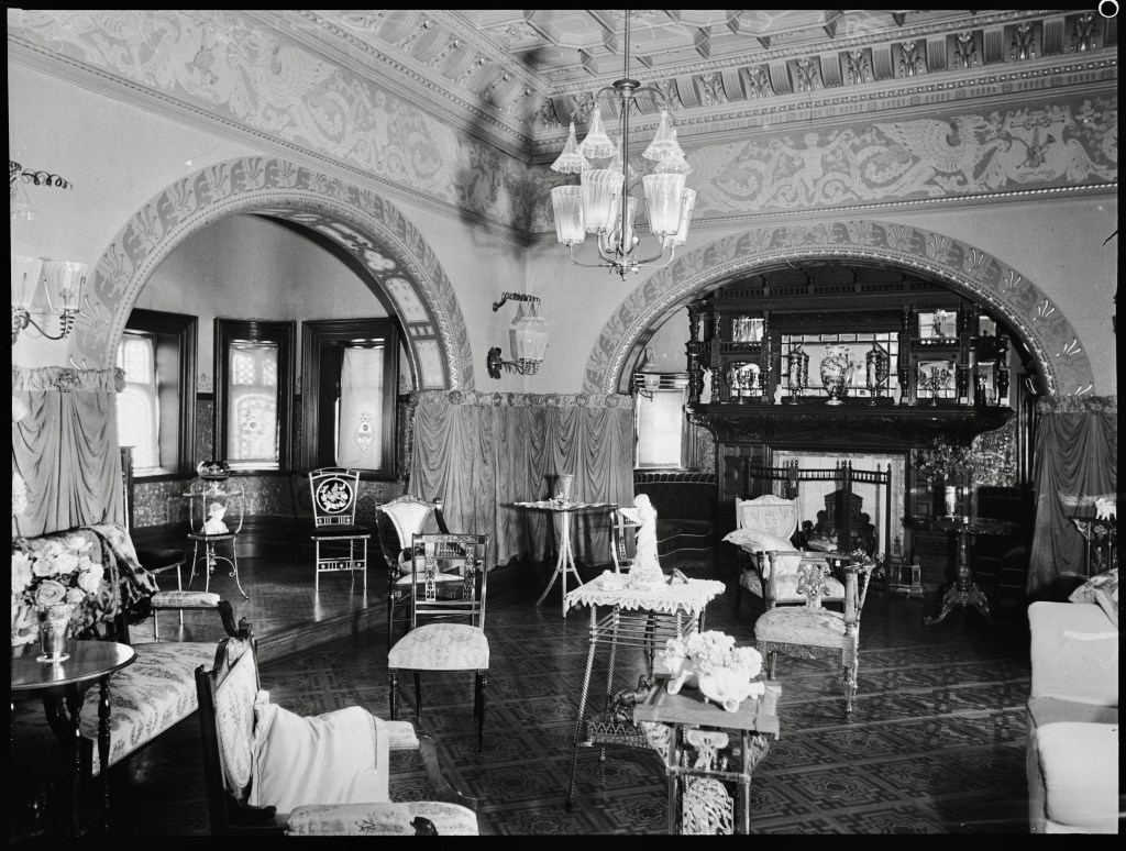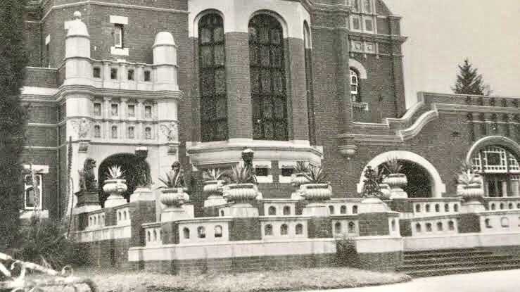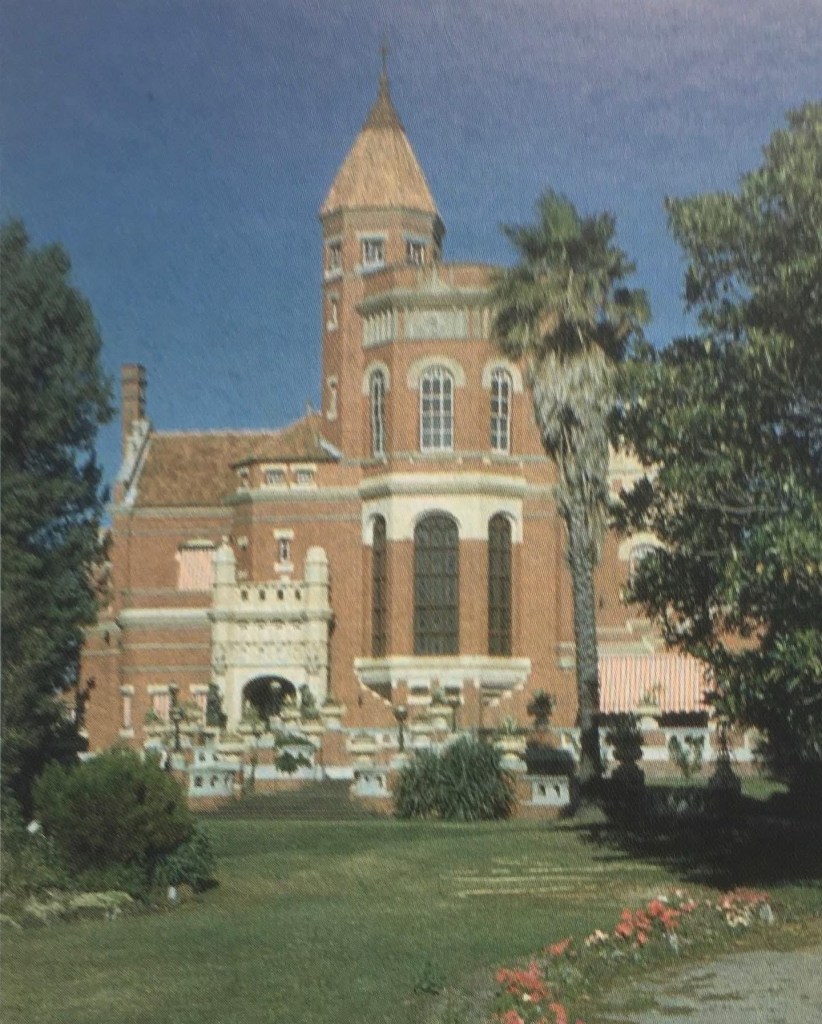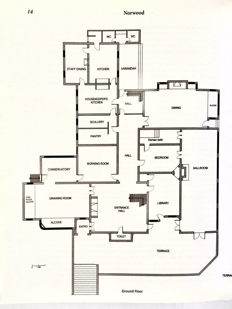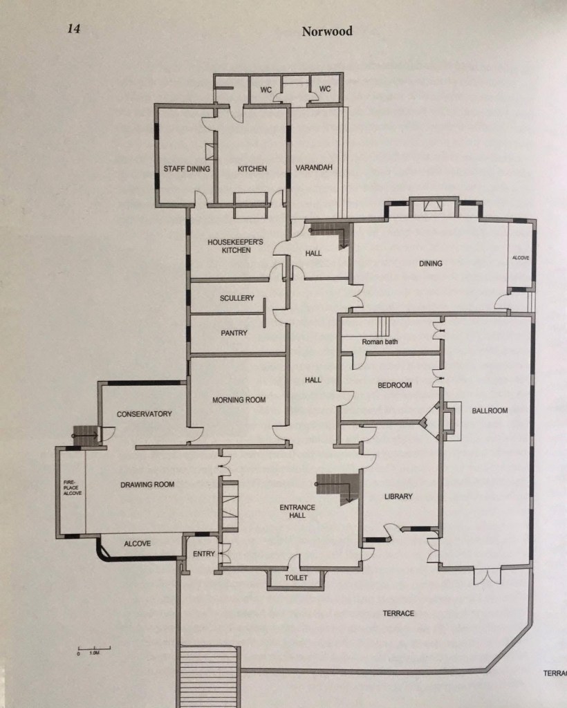 Norwood, Brighton, 1891-2, demolished 1955 – definitely the most weird and wonderful mansion of the #LandBoom era. The exterior was a mashup of Queen Anne and Tudor, but inside! The hall was very much in the baronial style, complete with bronzed knights and a tiled fireplace, the drawing room low Romanesque arches, fireplace ‘nook’, and elaborate marquetry floor and coffered ceiling, the dining room with coved timber driving and giant wrought something chandelier ! The conservatory was fully tiled, there were lots of #stainedglasswindows (eight of the main Shakespeare set now at Trinity College), and a curious marble Roman bath, off a windowless bedroom downstairs. And a ballroom that you could only bet up from a terrace or a bedroom – either it was added during construction or the plan is guesswork.