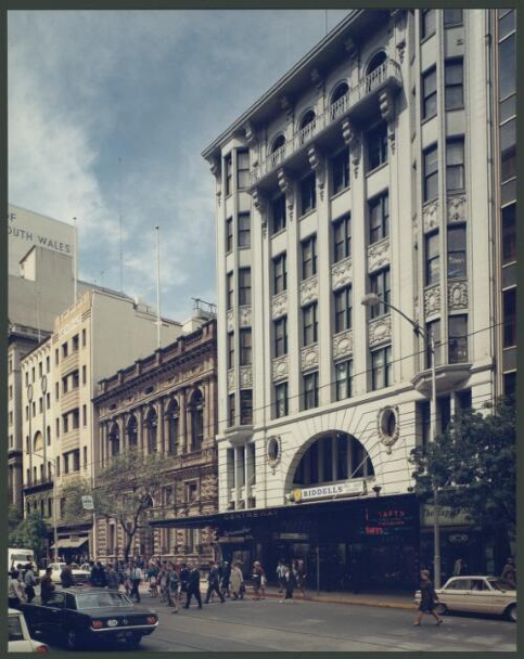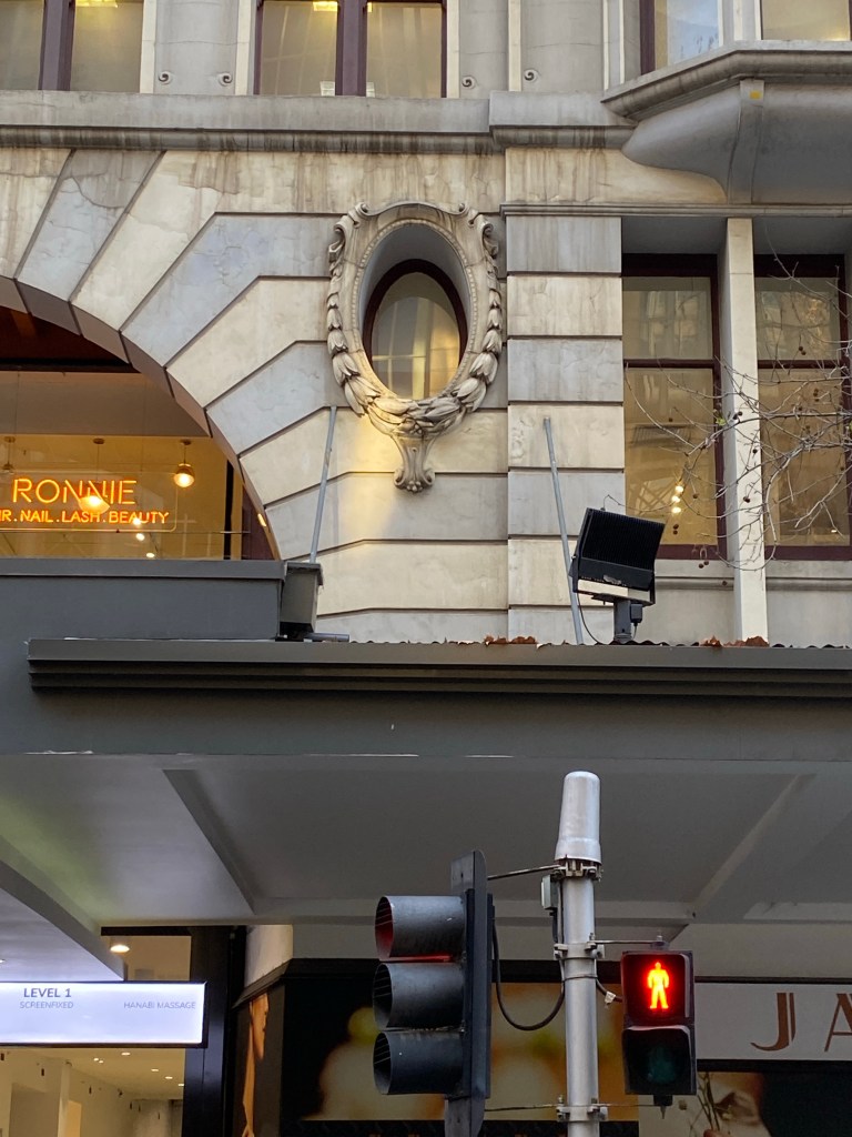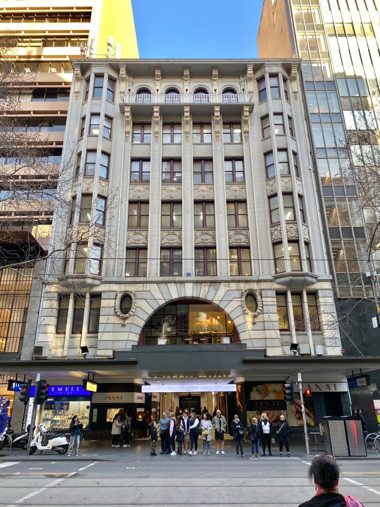 The Centreway Arcade facade is an interesting bit of late Edwardian era architecture; designed by the prolific Tompkins & Tompkins in 1911, it’s a bit American ‘Beaux Arts’, with a strongly modelled base level, then just vertical fill up to a big cornice. The details are a bit fruity, with a lots of scrolls around the oval windows, and the panels between the upper windows, which contemporary US designers might have just left plain. It was also an early example of a fully steel framed structure, another US idea (where it had been common since the 1890s). Looking a bit dirty now. It’s too painful to talk about the recently destroyed postmodern arcade, but I will note that before that, the original was a quite plain one, as seen in a photo by Graeme Butler from the mid 1980s.