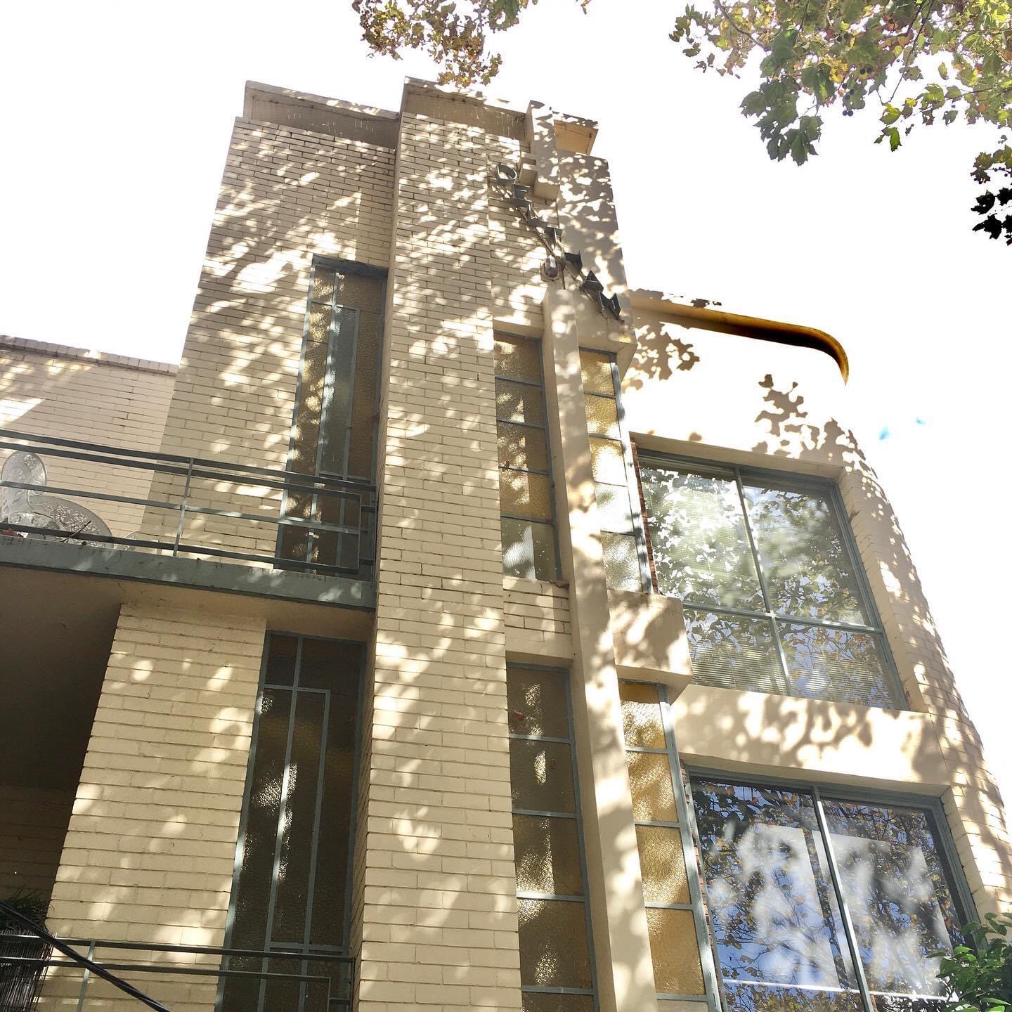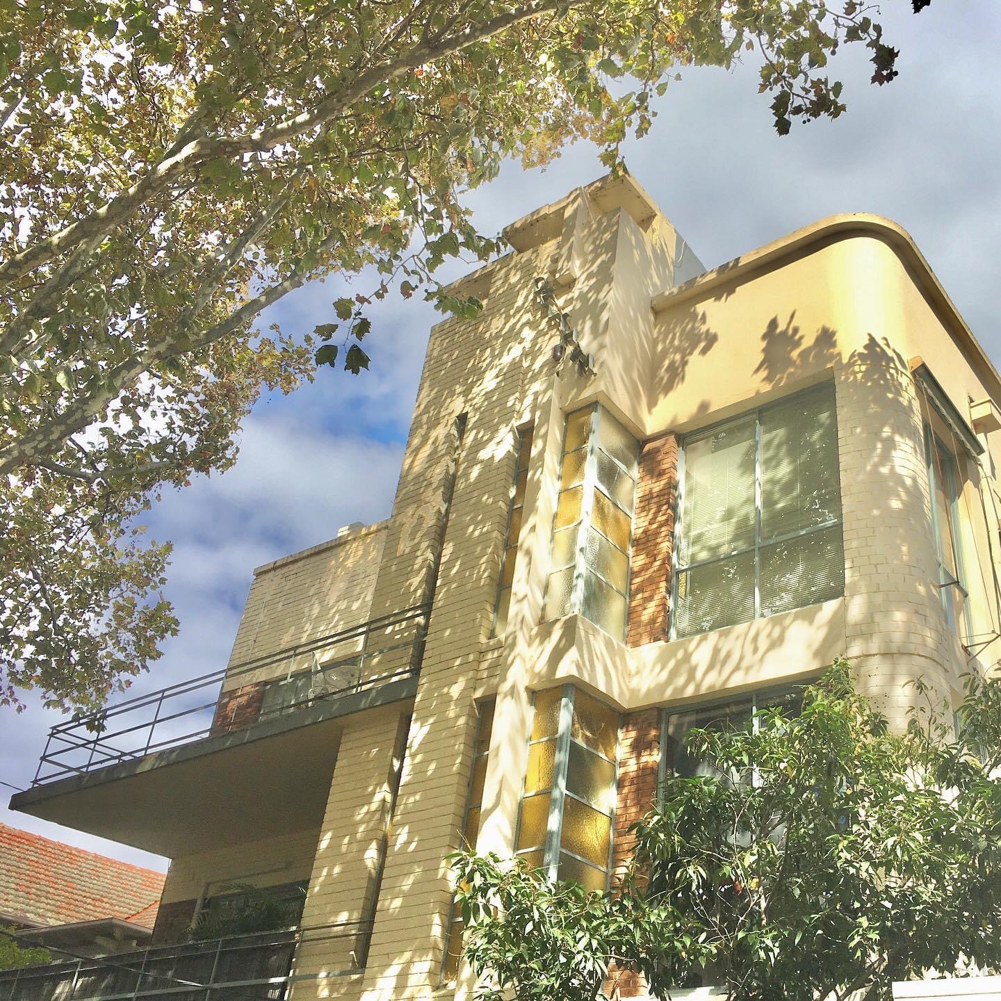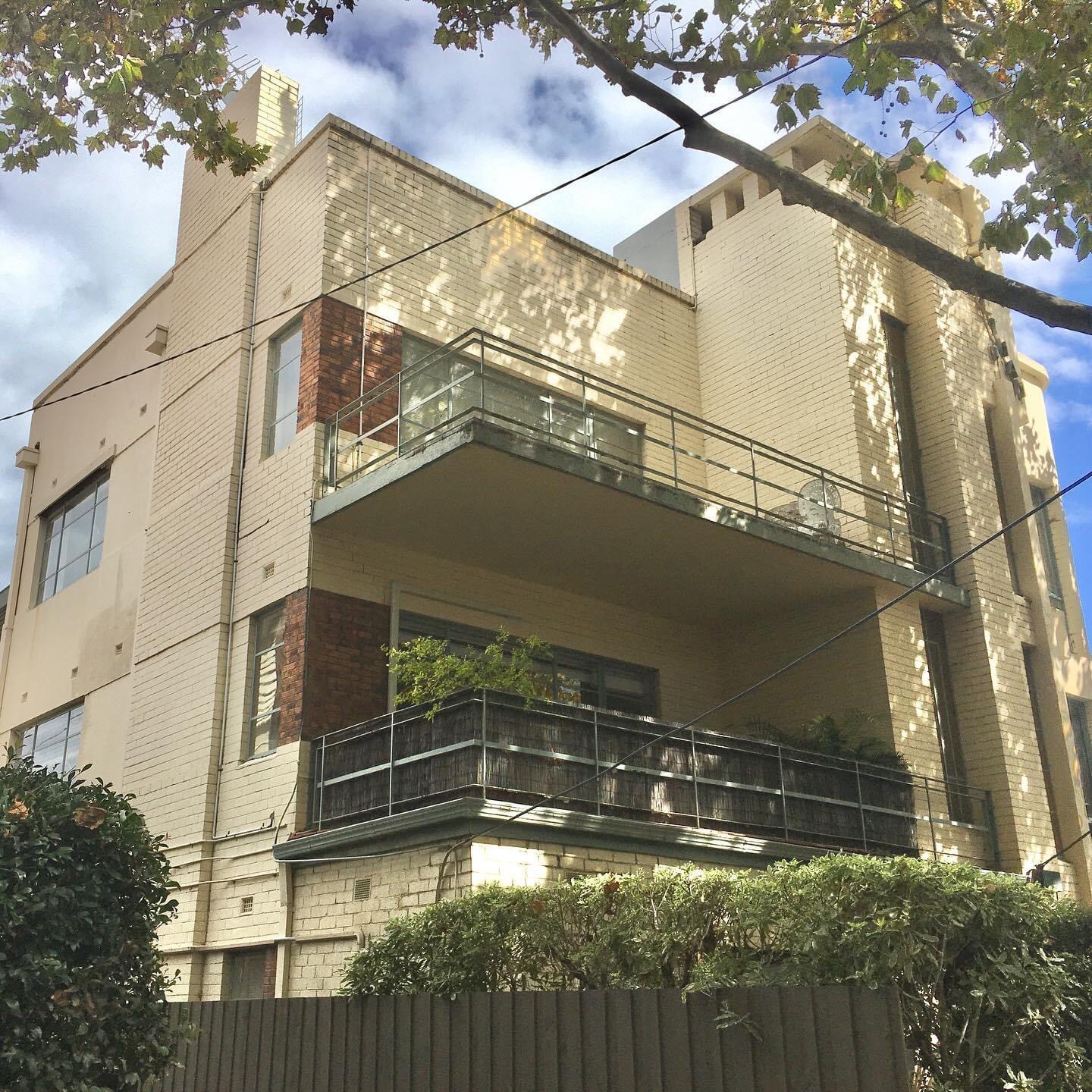 Deltham, 1936, #EsmondDorney, Meredith St, Elwood; not great shots with all the shadows, but you get the picture. Dorney’s Art Deco was quite distinctive, he liked curves in his plans (here is the stairwell), and the top has complex rectangular stuff going on. The top floor front flat sold in 2017 for $1.2 mill (😮).