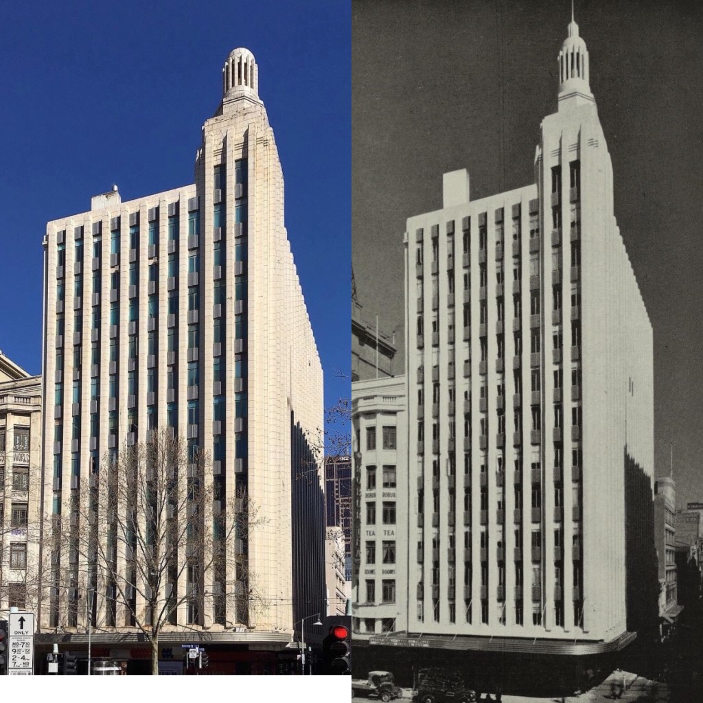 The Century Building, Swanston Street, then and now, #MarcusBarlow, 1938-40. It was very modern, no extraneous decoration, with white tiles (sadly not best quality, now rather cracked) and aluminium window frames. It was taken over by the Air Force as soon as it was finished in 1940 – my grandmothers best friend worked here as a ‘tracer’ drawing up airplanes. Added to the Heritage Register in 2010. Old photo from Jack Cato, 1949, photo of tower from behind VHD. And no, there’s nothing in the tower, always just for show, and the only way in is via the roof.