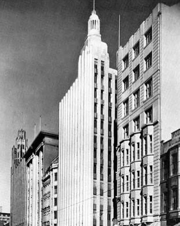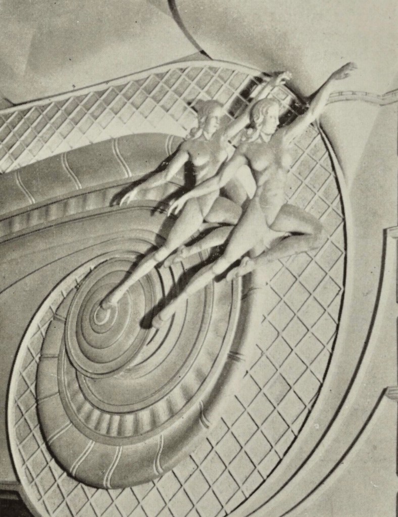 Sometimes #ArtDeco was a bit …out there ! A couple of leaping nude spirits was a feature of the very swirly decor of the #newsreeltheatre in the basement. The design is credited to both #MarcusBarlow and cinema specialists #TaylorAndSoilleux (who also did the Rivoli, and other equally wild cinemas now gone, so I’d say it was them). Looks like only something of the ceiling survives in the current nightclub down there. It sat 500, the largest newsreel cinema in the CBD, of which there were 4 or 5 in 1940, and stayed a cinema till 1985. The photos are from a FB group #melbournetheatres, but they often don’t say where from- presumably a theatre magazine. Obviously inspired by the #OdeonLeicesterSquare, completed 1937 (last 2 images). The decoration there was lost and then partly recreated; this is the original.