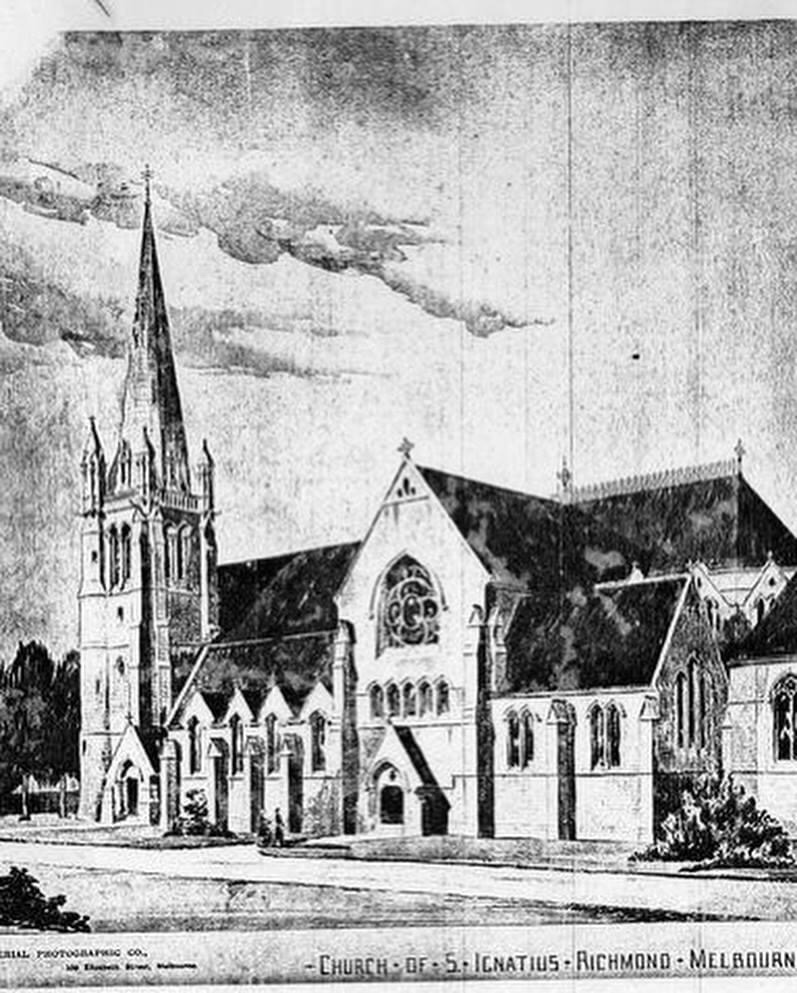St Ignatius Richmond, one of the largest (along with St Mary North Melb) and with that spire certainly the most prominent of any Melbourne church apart from the two main cathedrals. Designed by #WilliamWardell, who was the chief of the #PublicWorksDepartment ‘with a right to private practice’, and he did lots of churches and some banks, presumably in his spare time! The wonderful spire here isn’t his design, but by diocese architect Gerald Vanheems built in 1927, much taller than originally intended, but it works. Looks like a higher version of the second sketch I found (no date) so it’s Wardells design but higher. The other sketch might be an earlier rejected design, or maybe it changed on the way ? It’s dated 1870, but construction started in 1867 (not complete, without spire) till 1897. Only 30 years ! (actually just realised maybe St Mary’s North Melbourne is just as big, but they never finished the spire). @ St Ignatius Catholic Church