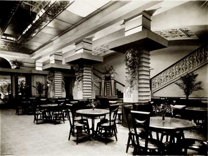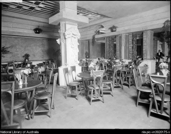 Created in 1916, it was a complete rebuild of the Vienna Cafe, renamed as too German in World War I, when Greek Australian owner Antony Lucas revamped it with a national name and features, like murals of gumtrees, and sculpted tea trees and fig trees (and three Greek muses by Margaret Baskerville) amongst the characteristic Griffin geometric patterns and lots of gold tiles.