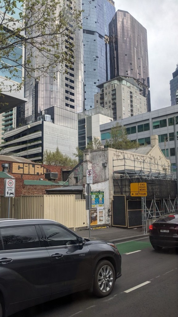 My photos are from 2017, and this is what I said then : #RussellTeaRooms, King Street. Dunno if it’s really about to fall down but it sure looks wonky. Built in 1850, just before the #goldrush, maybe not built so well….also famous as being a the family home of one time actress #LolaRussell @citykid.lolarussell since she was born here 93 years ago, only moving out last year due to wall instability which they couldn’t afford to rectify (but Council have paid for the #propping). A crowd funding initiative didn’t raise the $100,000 and the funding bodies refuse to give any more, since they’ve had numerous grants over the years.
